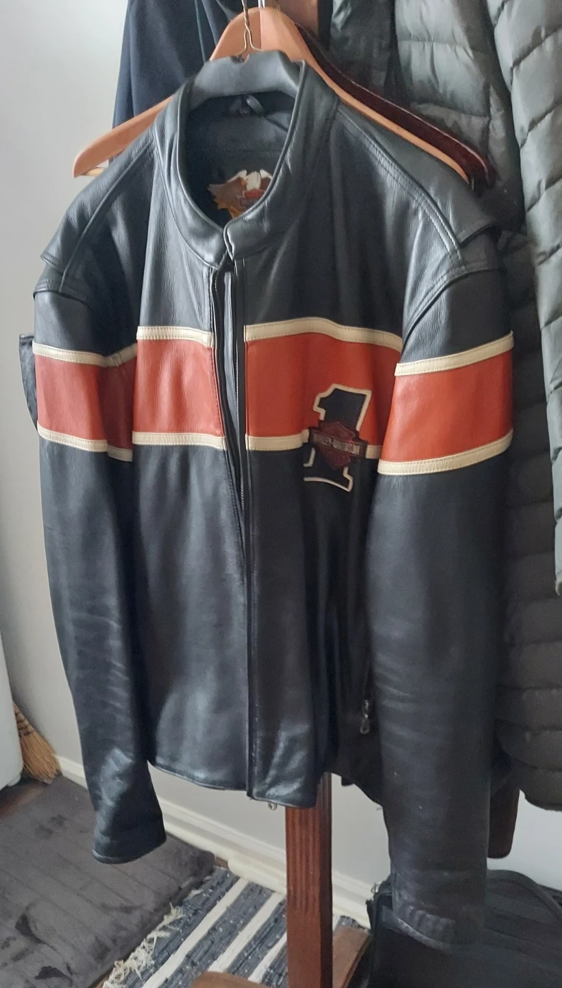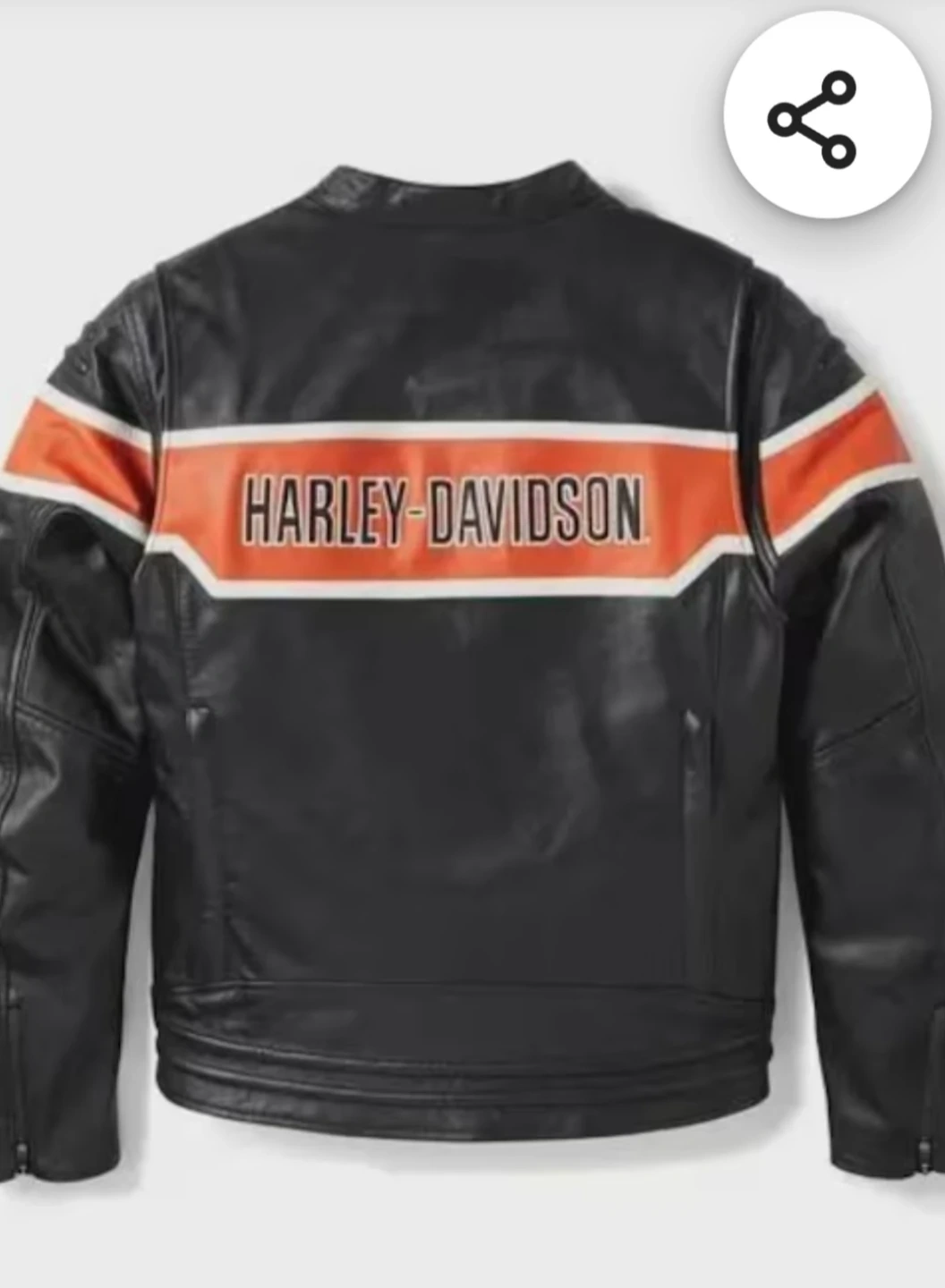 Classic black leather motorcycle jacket with orange and cream racing stripes. Features "Harley-Davidson" branding on the back. Zipper closure and durable construction.