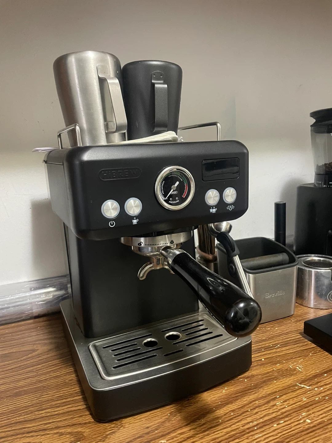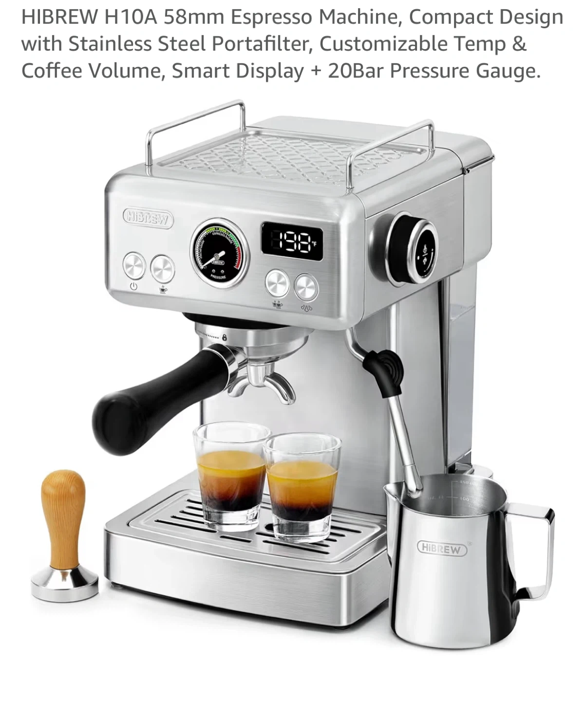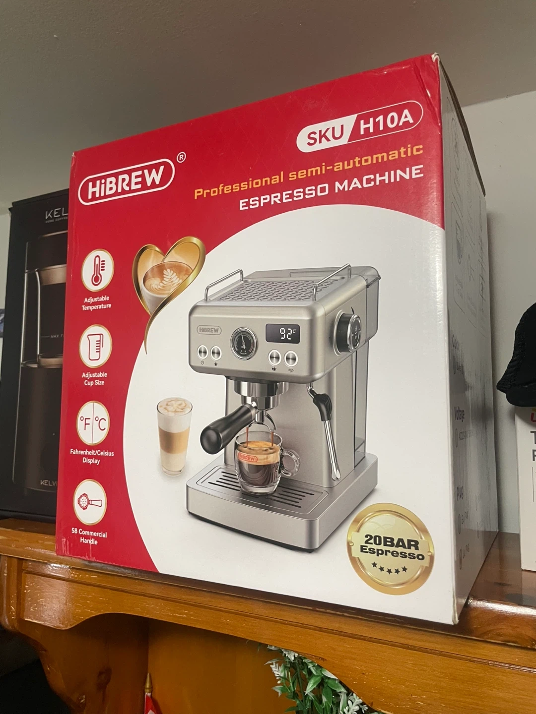 Selling a HIBREW professional semi-automatic espresso machine. It features an adjustable temperature and adjustable cup size. It also has a Fahrenheit/Celsius display and a 58 commercial handle. This machine is perfect for making delicious espresso at home!