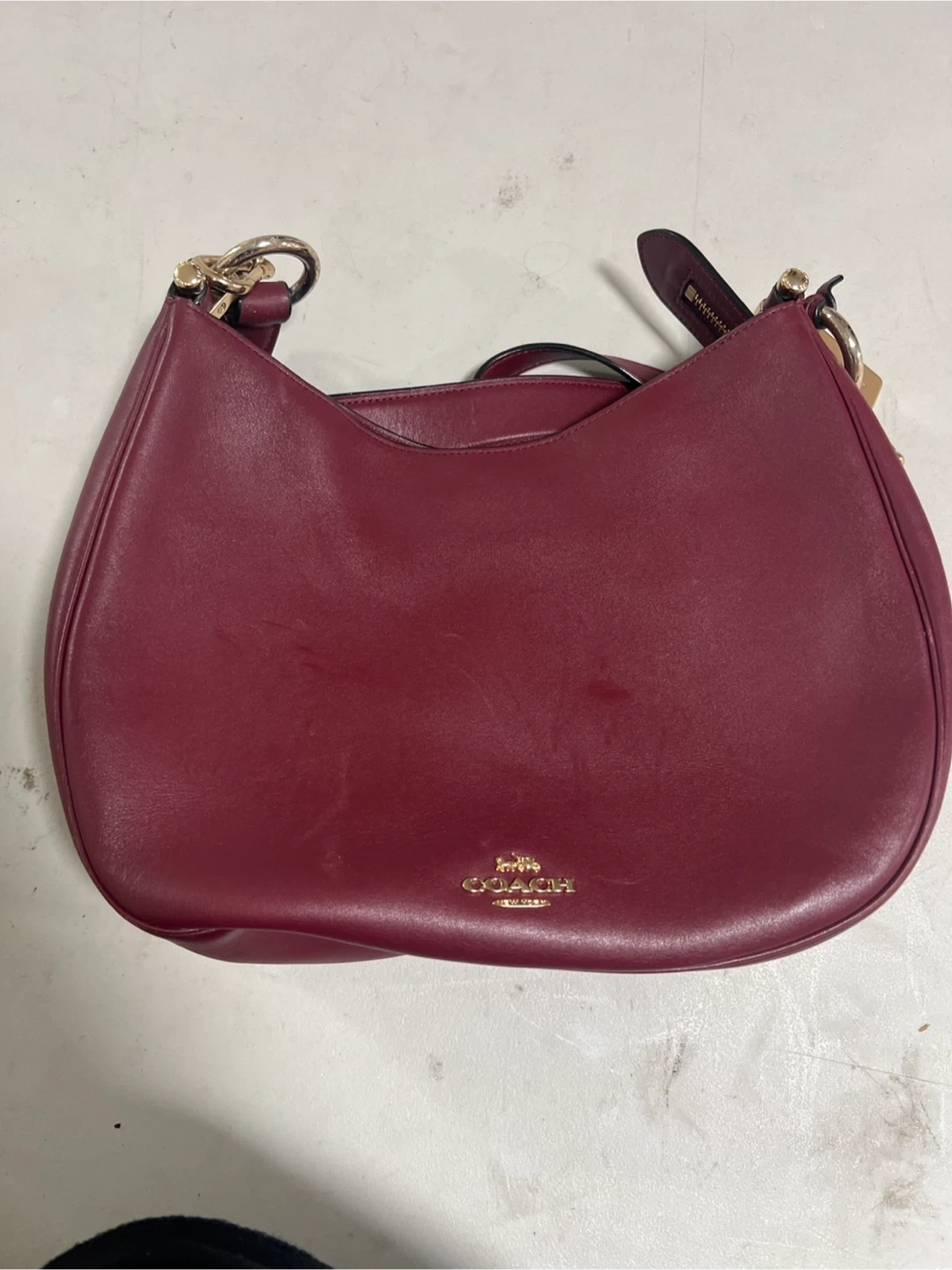 A selection of used handbags from well-known brands. Includes a Michael Kors crossbody, a Coach hobo bag in a dark red, a gray Michael Kors shoulder bag, a Dooney & Bourke monogrammed satchel, and a black Dooney & Bourke hobo bag