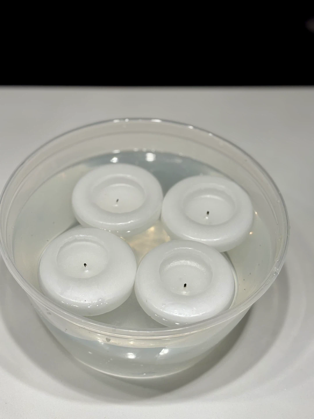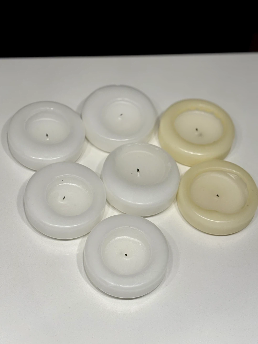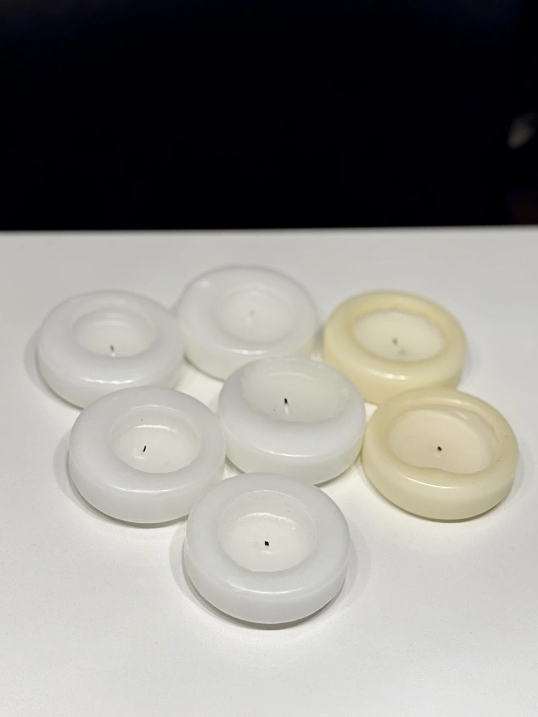 Set of seven white floating candles, perfect for adding ambiance to any water feature or event. These candles are designed to float and create a warm glow. They're a lovely addition to parties, weddings, or relaxing evenings at home. Used but still some life left in them.