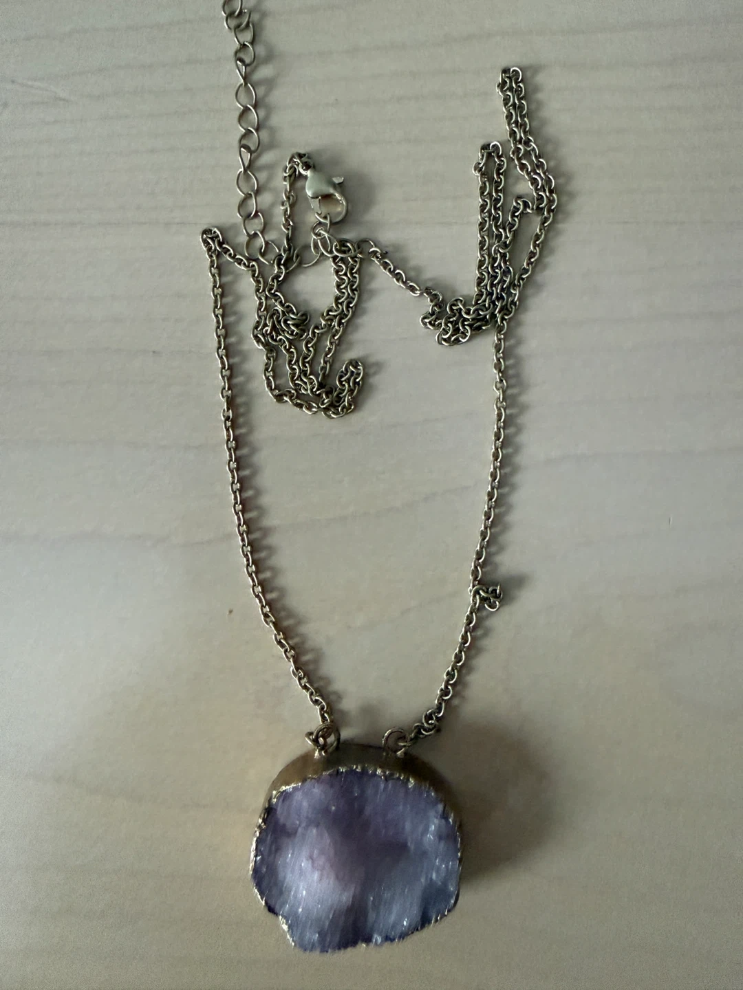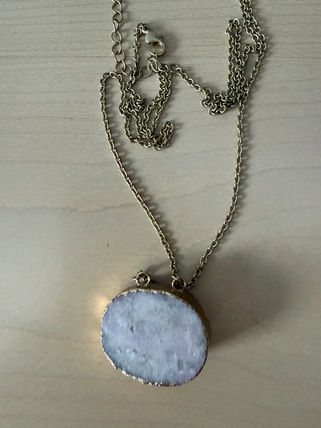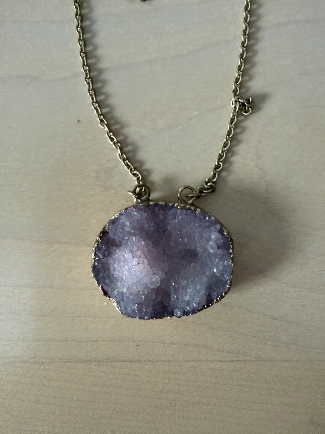 A unique druzy geode pendant necklace featuring a purple and white crystal. It's set in a gold-tone metal bezel and hangs from a delicate chain with an adjustable clasp. This pendant necklace adds a touch of natural beauty to any outfit.