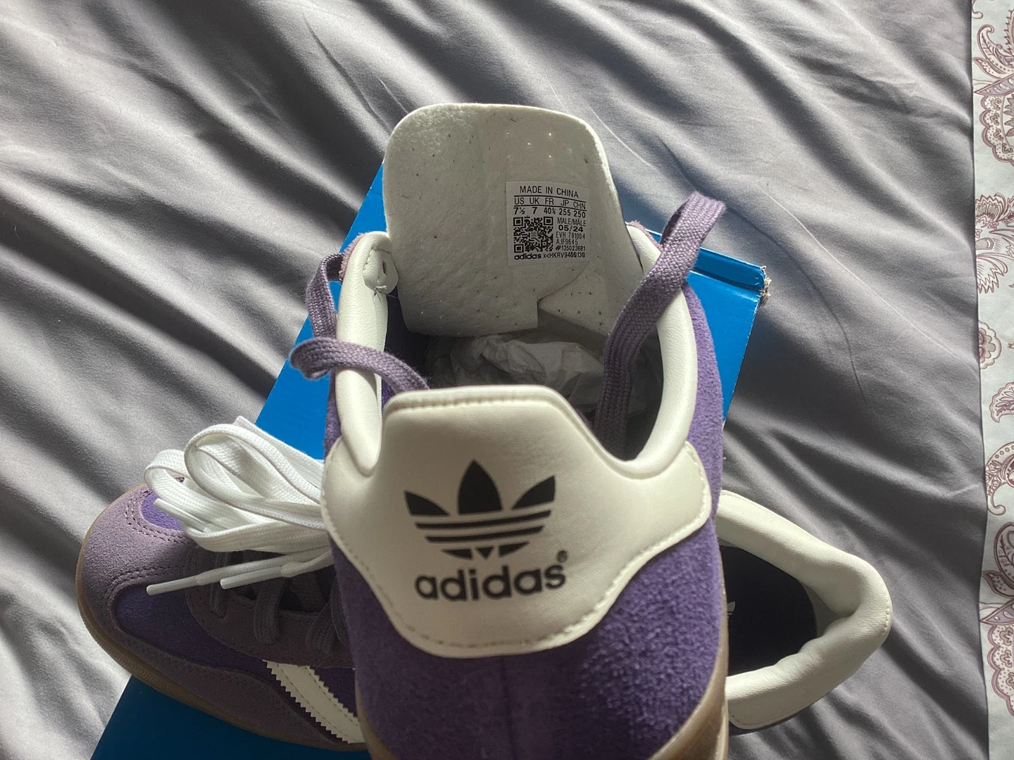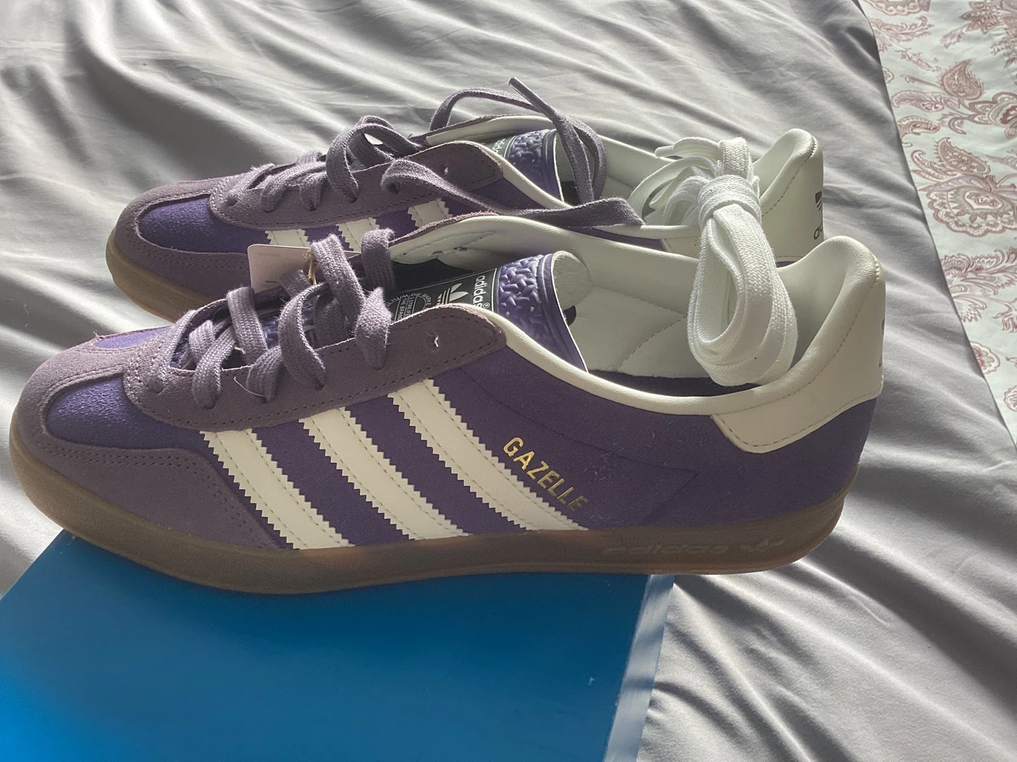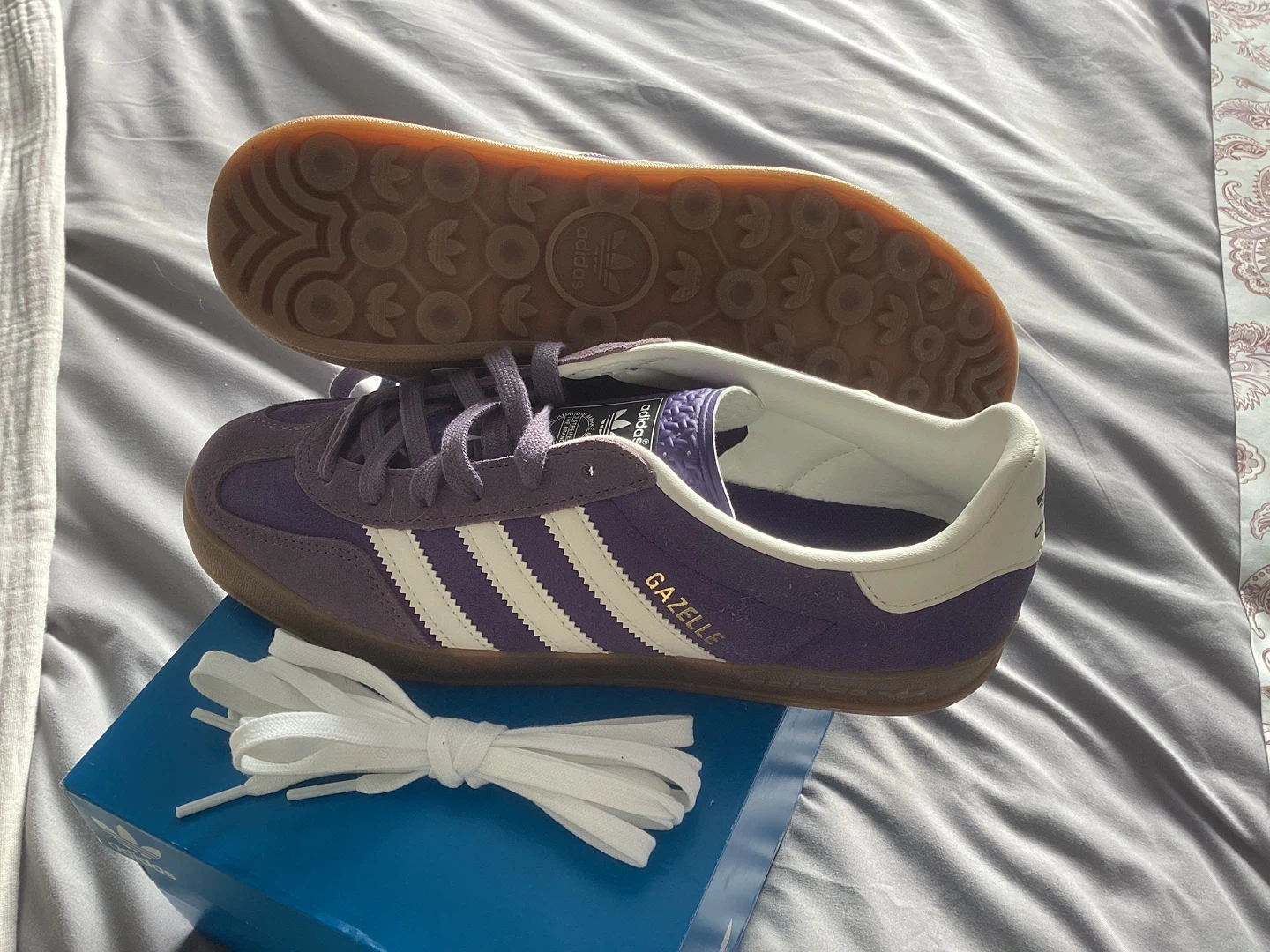 Selling a new with tags pair of authentic Adidas Gazelle sneakers in a lovely purple colour! These are a women's size US 7 1/2. The classic Adidas stripes are in white, and the Gazelle logo is in gold. They come with an extra pair of white laces.