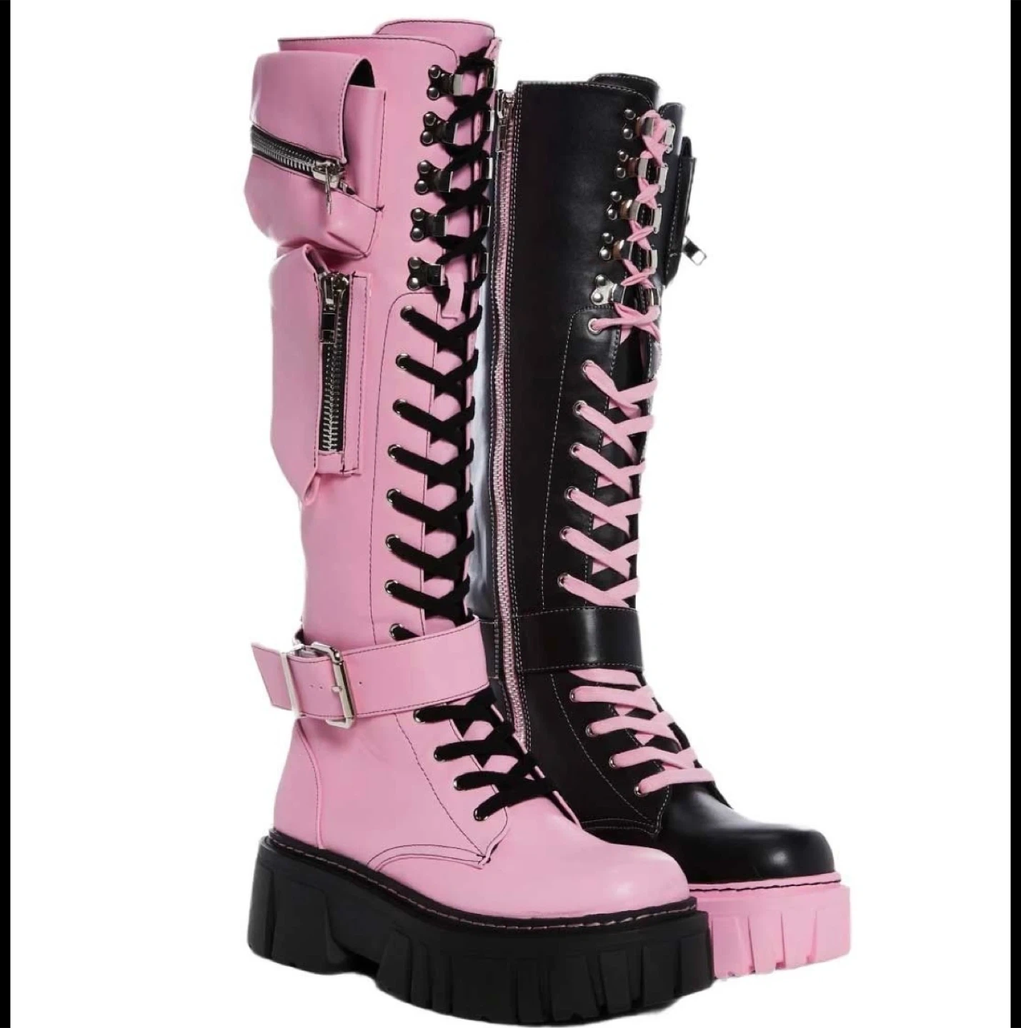 10Selling a pair of Demonia platform boots in a cool black and pink color combo! These are a women's size 8. They feature a unique design with lace-up fronts and a chunky platform sole. Perfect for adding some edge to your look!
