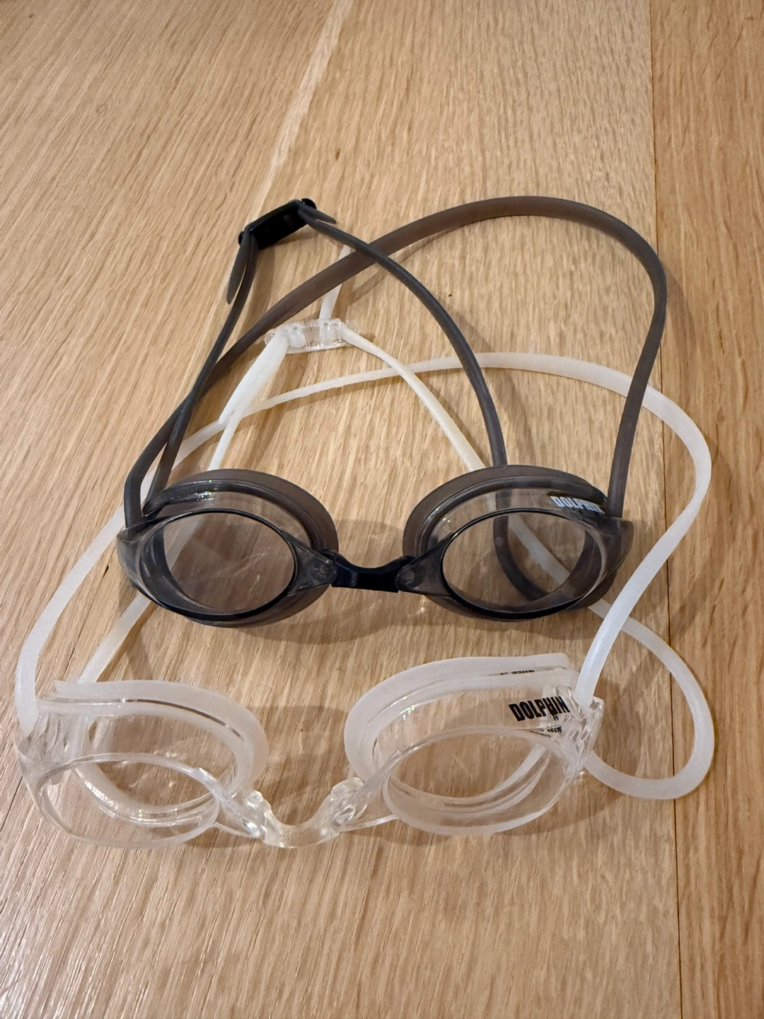 Selling two pairs of Dolphin swim goggles. One pair is clear and the other is a dark gray color. Great for swimming laps or just having fun in the water!