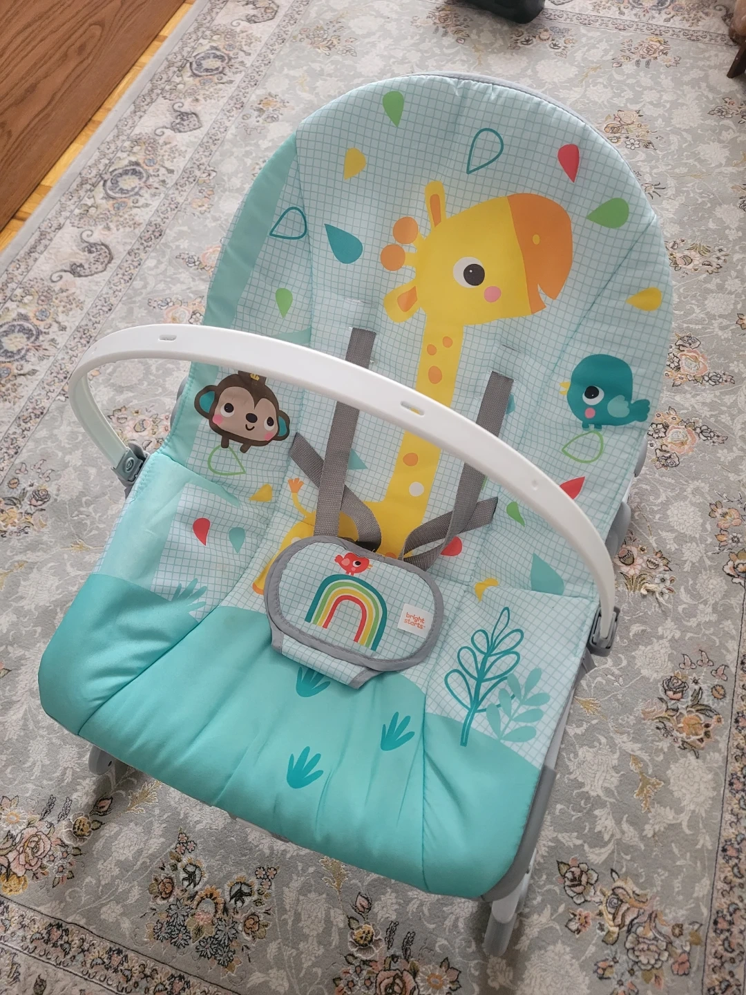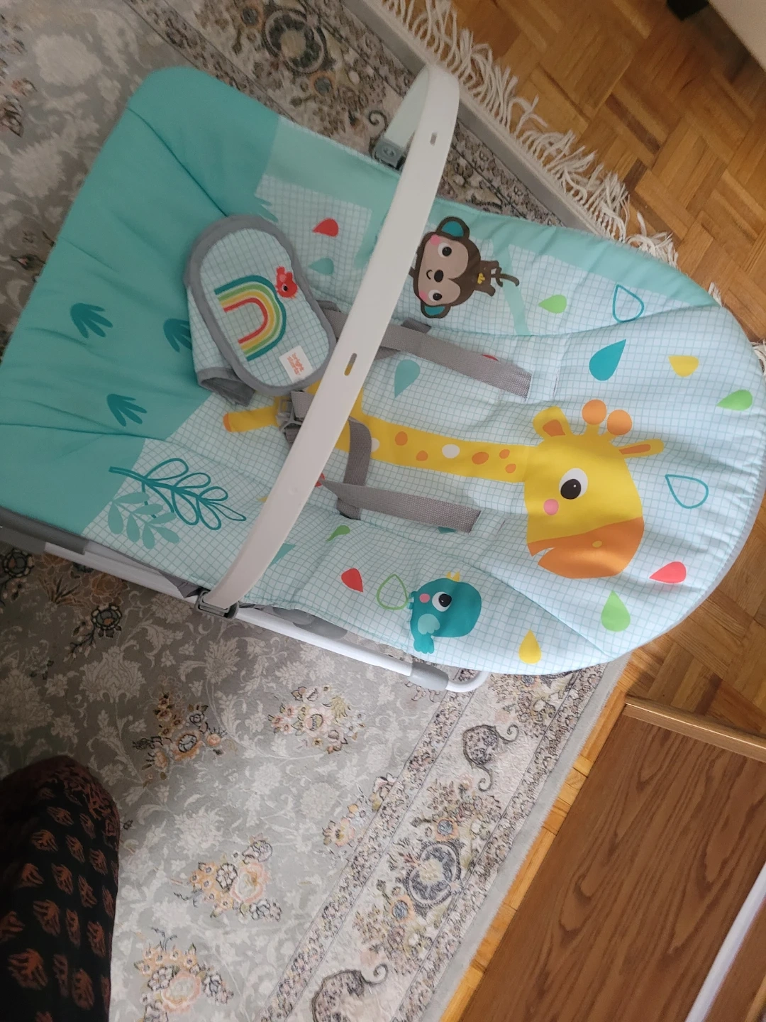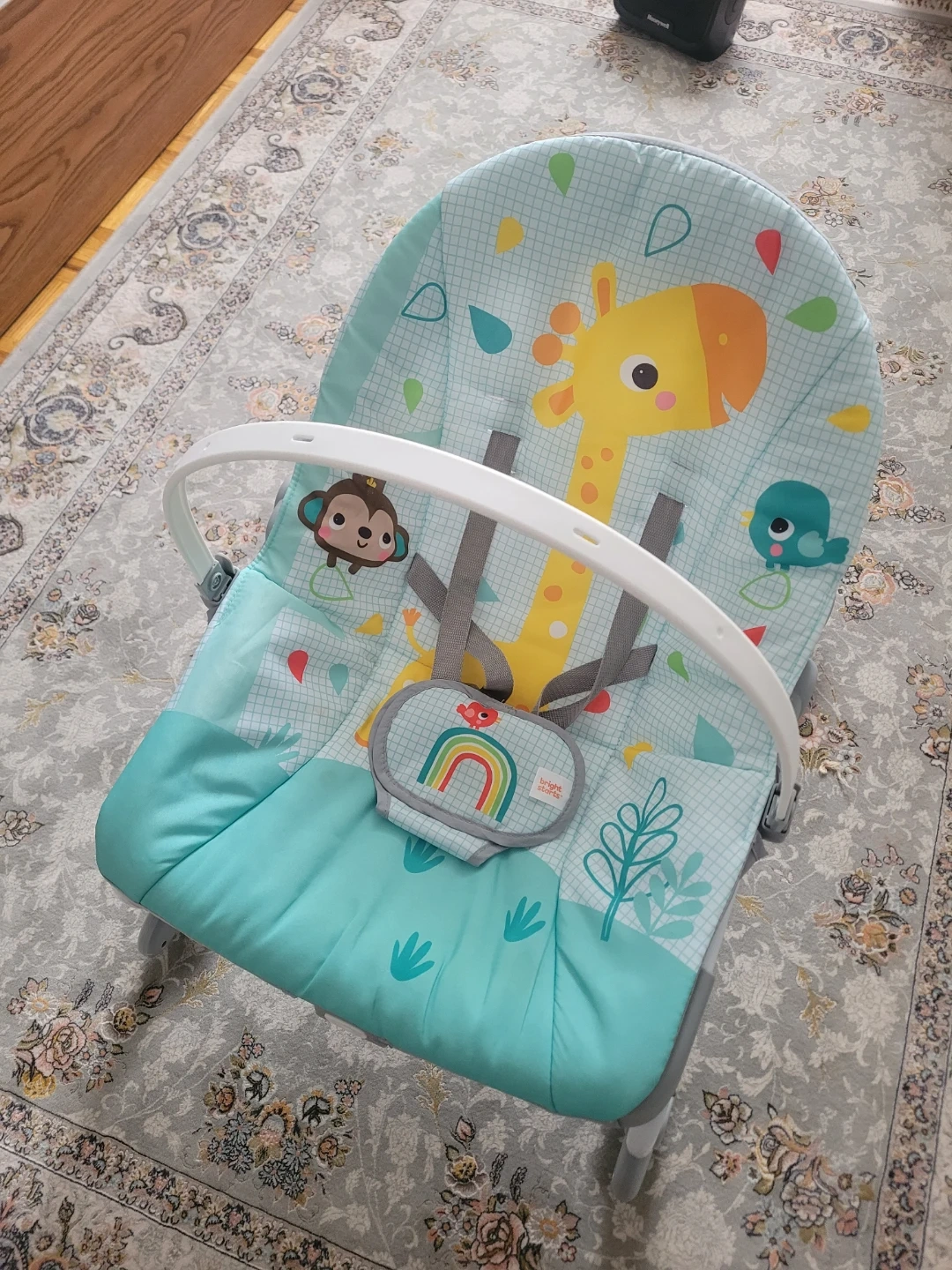A gentle baby bouncer with a fun giraffe and monkey theme. It's designed with a comfortable seat and secure harness. This bouncer provides a cozy spot for your little one to relax. Perfect for babies who need a calm place to sit.its almost new.