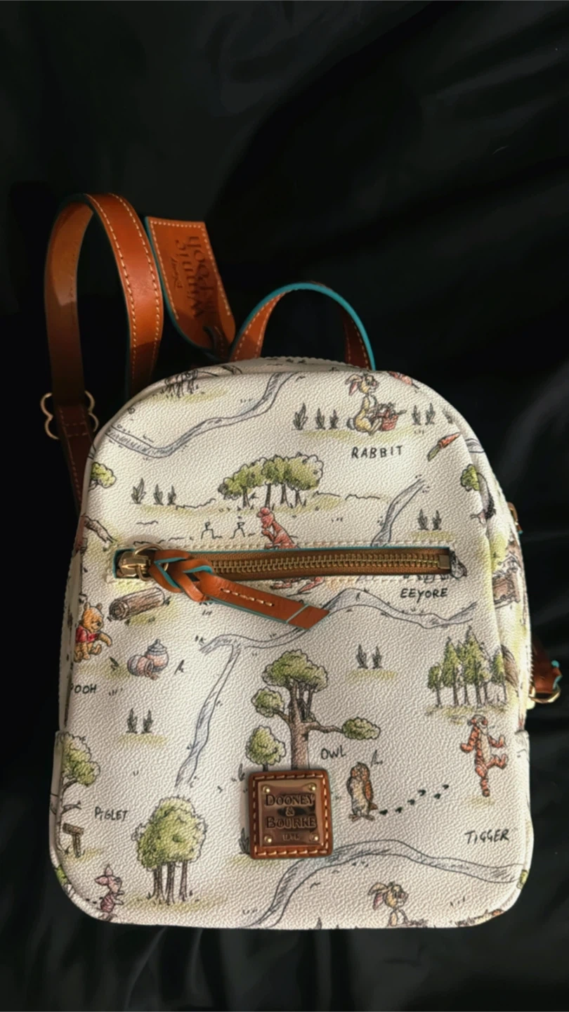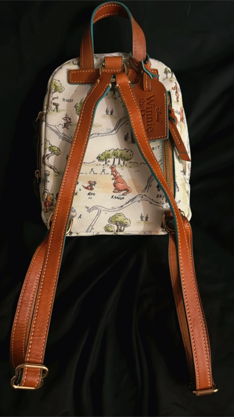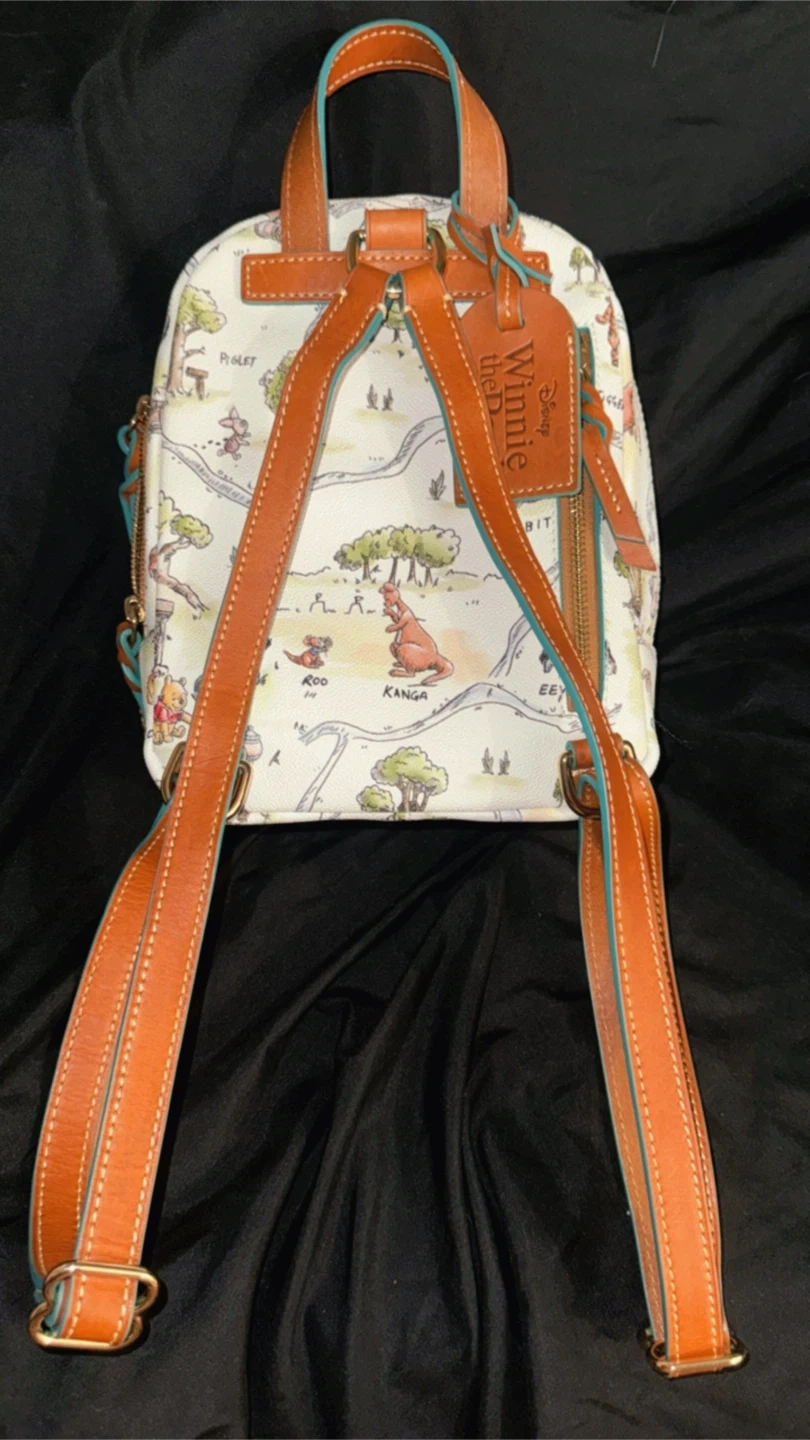 This is a super cute Dooney & Bourke mini backpack featuring a Winnie the Pooh map design! It has leather straps and trim with a teal accent color. The interior is a matching teal color as well. New Without Tags
