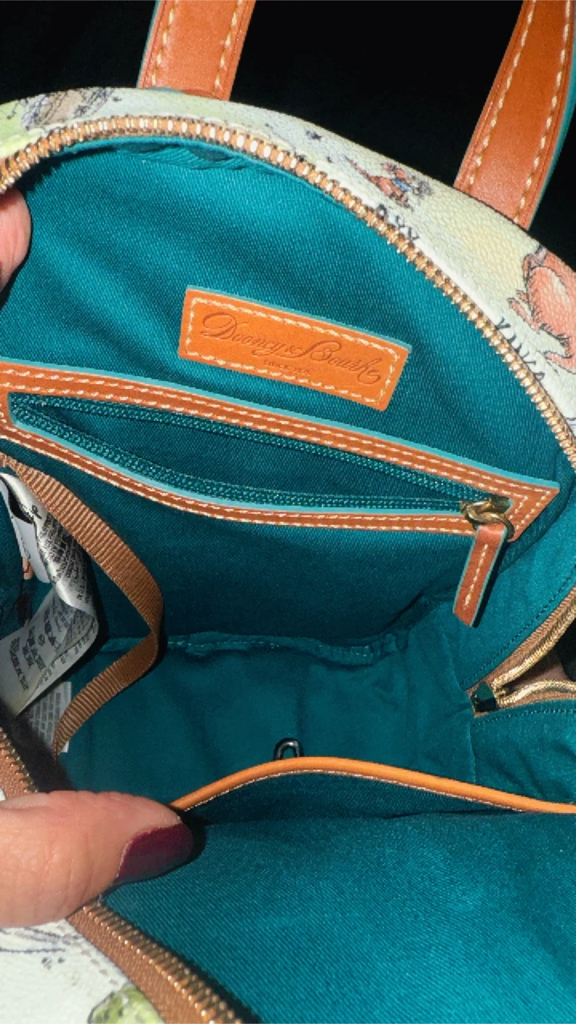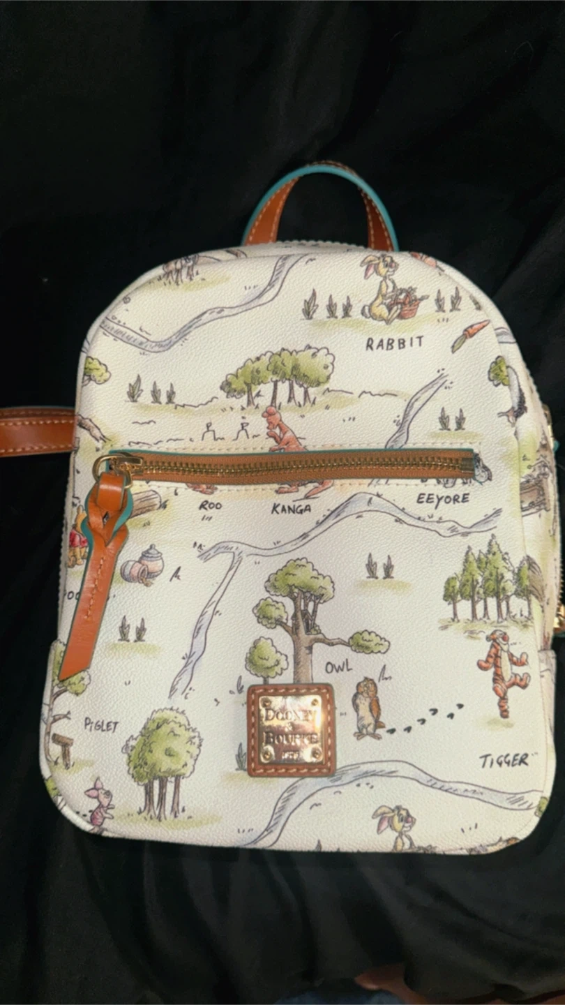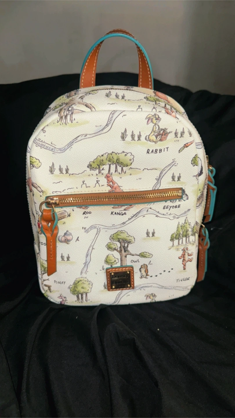 This is a super cute Dooney & Bourke mini backpack featuring a Winnie the Pooh map design! It has leather straps and trim with a teal accent color. The interior is a matching teal color as well. New Without Tags