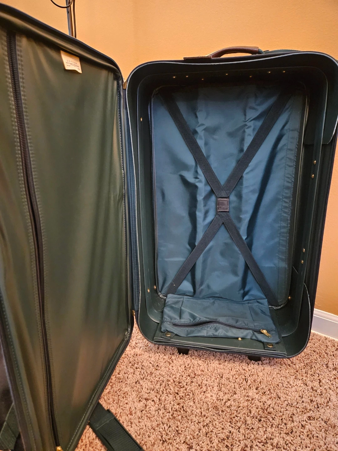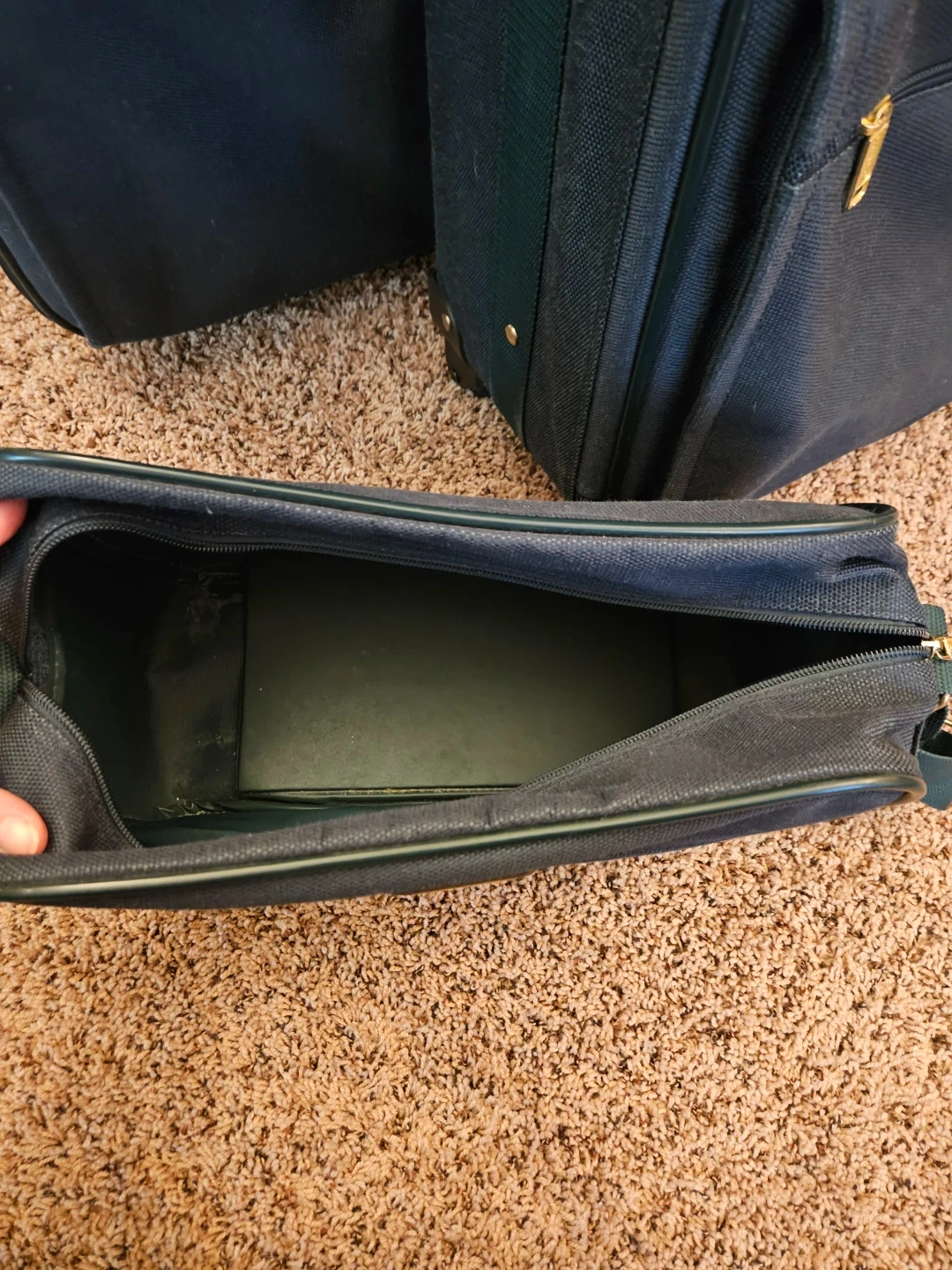 This is a dark green travel luggage set. It includes a large suitcase, a medium suitcase, and a shoulder bag. The interior is lined with dark green fabric and features elastic straps for securing items. The large suitcase has 2 exterior pockets, and the medium suitcase and shoulder bag each have 1 pocket.