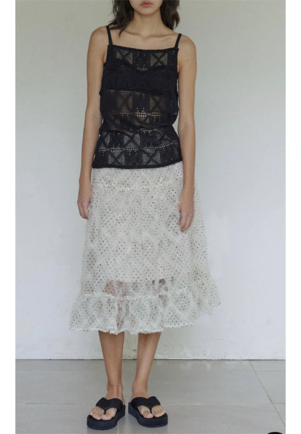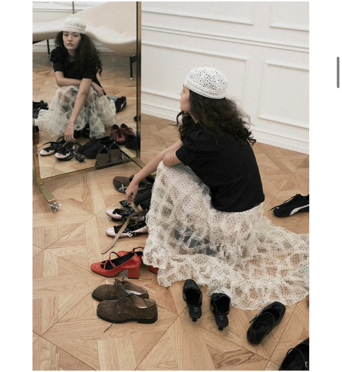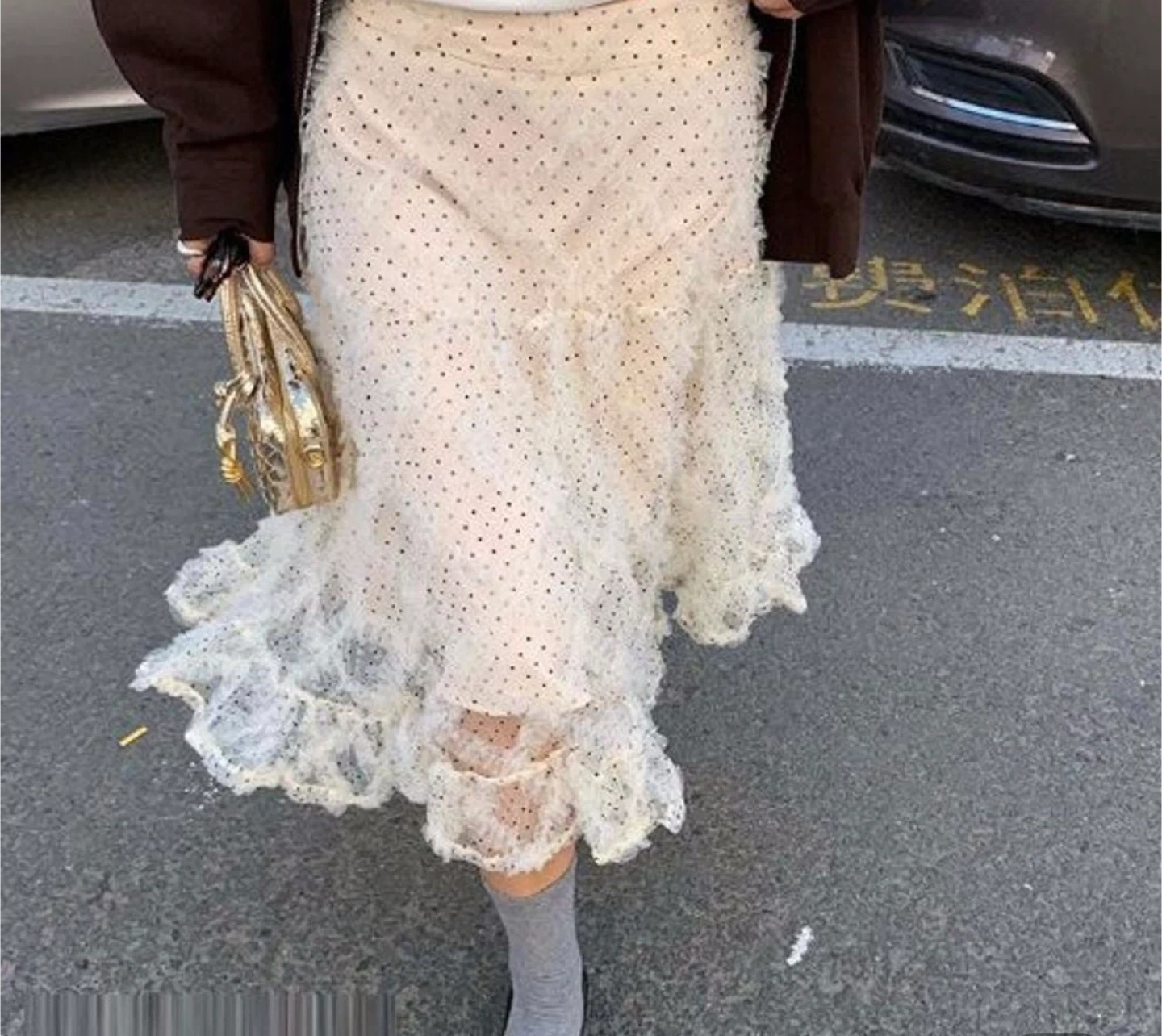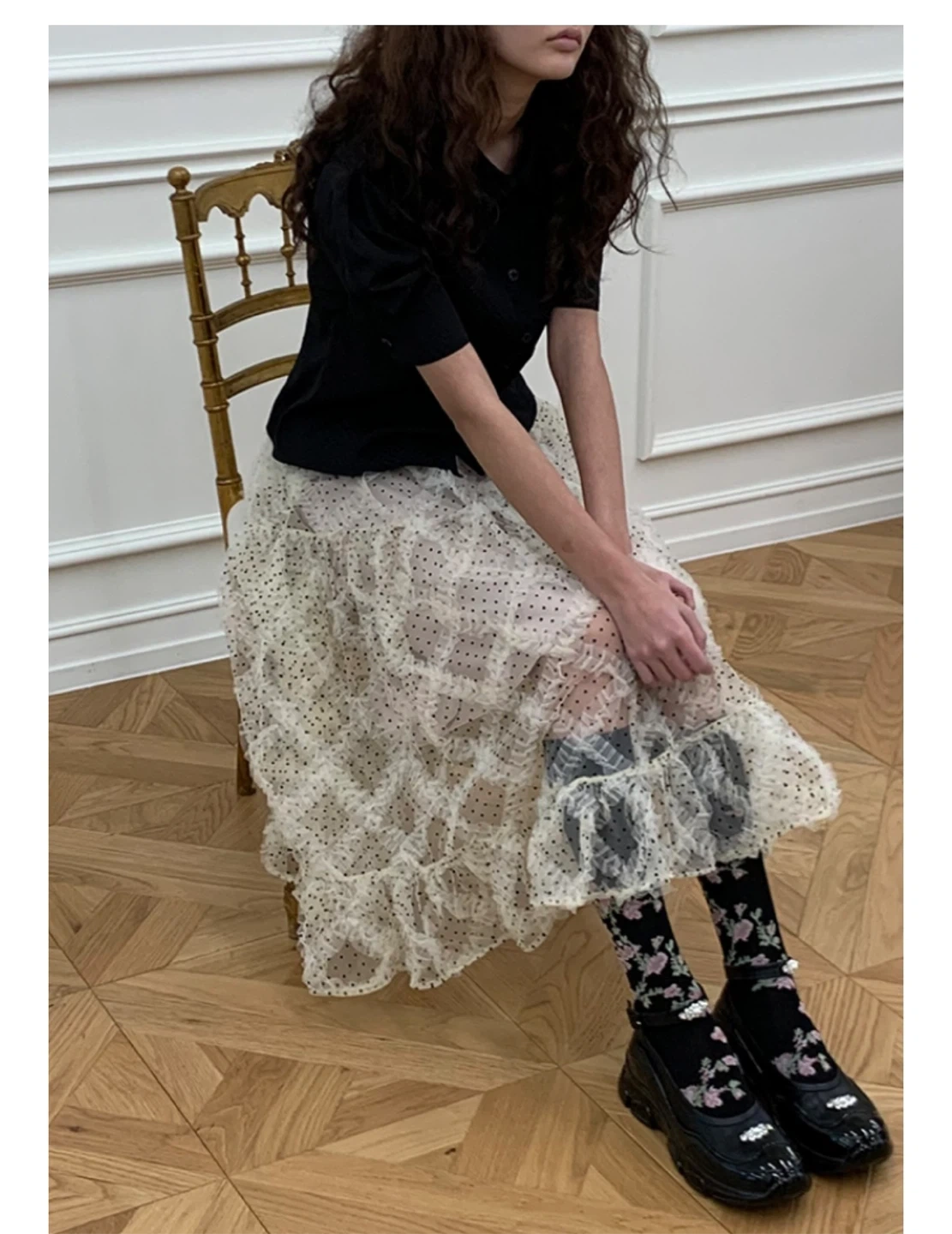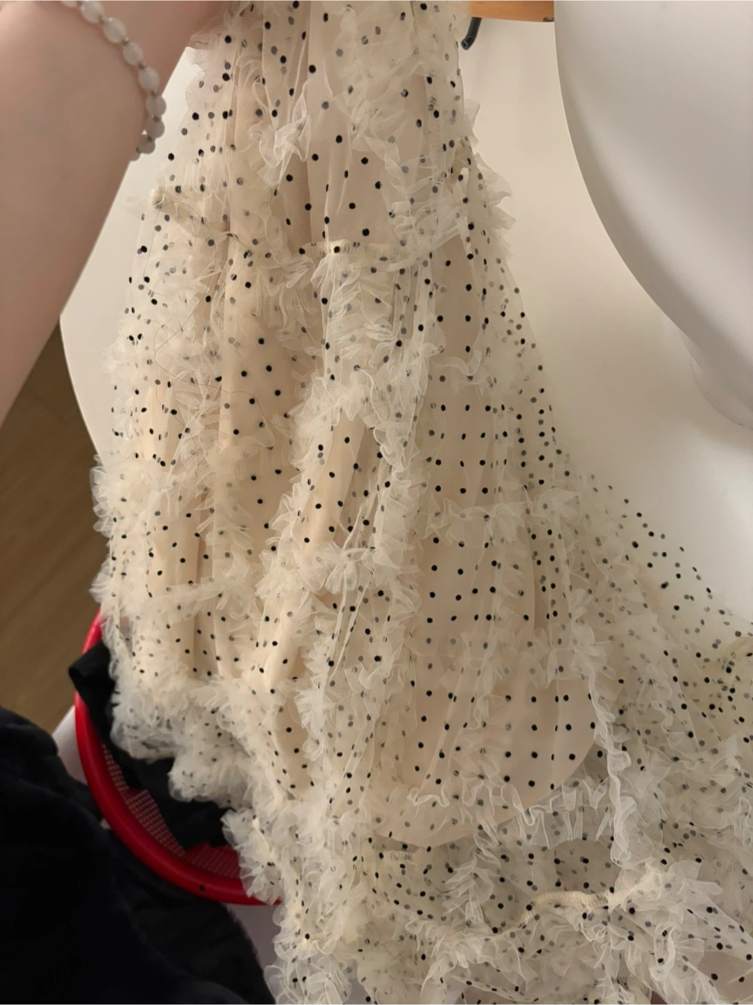 This cute polka dot skirt features a ruffle hem. Never wear it! Small size