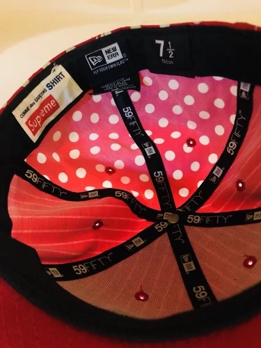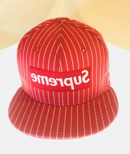 Item in Excellent Condition. Worn 3 times. Guaranteed 100% Authentic. The picture you see is exactly the item you get. Color: Red with White stripes and polka dots. Size: 7 1/2 (Around Head: 60cm / 23.5”). Material: 100% cotton. This is a collaboration "NEW ERA CAP 5950" of SUPREME and COMME des GARCONS from the Spring/Summer 2014 release. Features an embroidered inverted BOX logo on the front. The front half of the cap, including the brim, has a white stripe pattern, while the back half of the dome has a polka dot pattern. Feel free to message if you have any questions!
