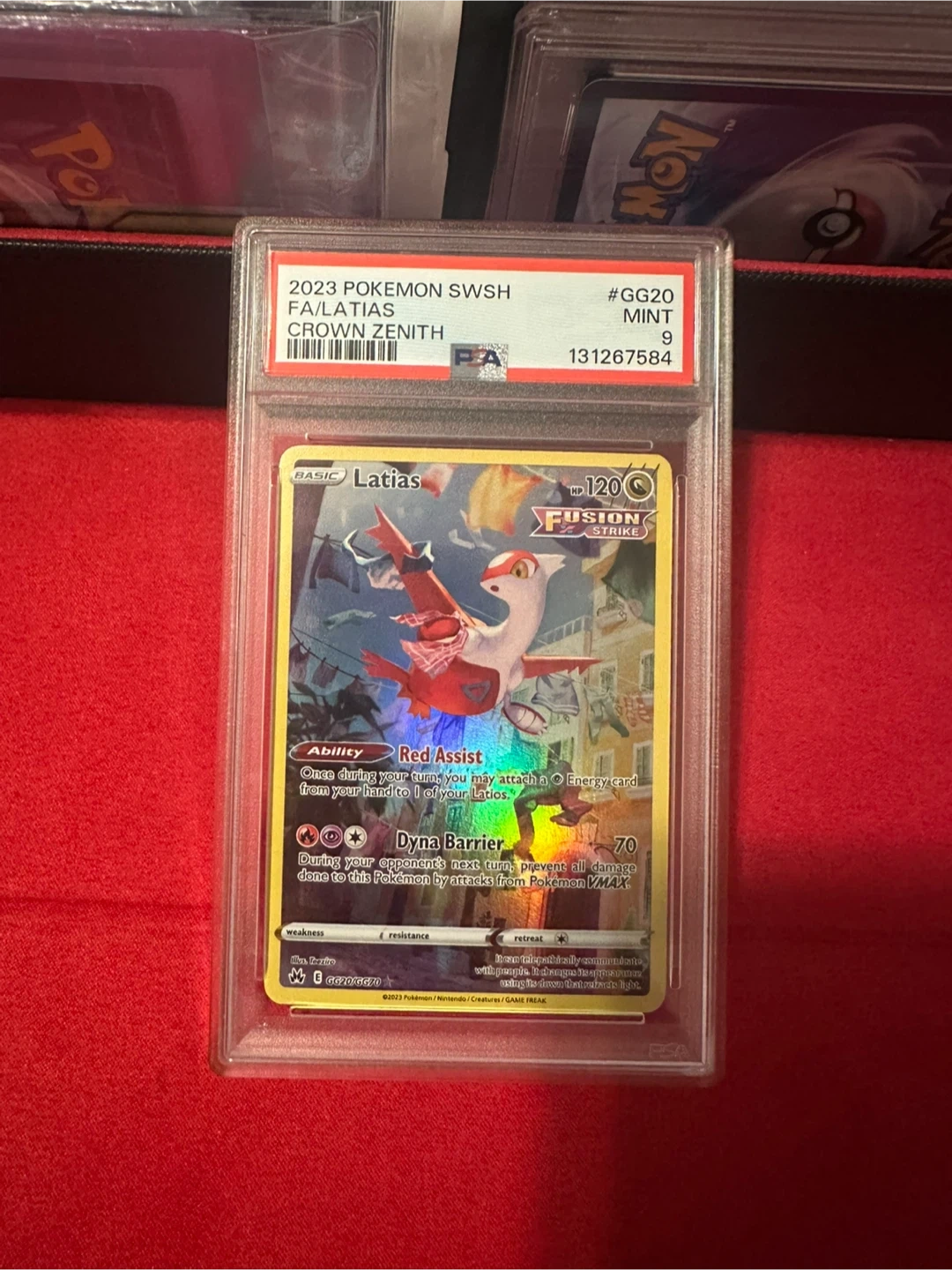 This is a 2023 Pokemon SWSH FA Latias VMAX Fusion Strike trading card, graded Mint 9 by PSA. It features the Red Assist ability and Dyna Barrier move. This card is a great addition for any Pokemon collector!