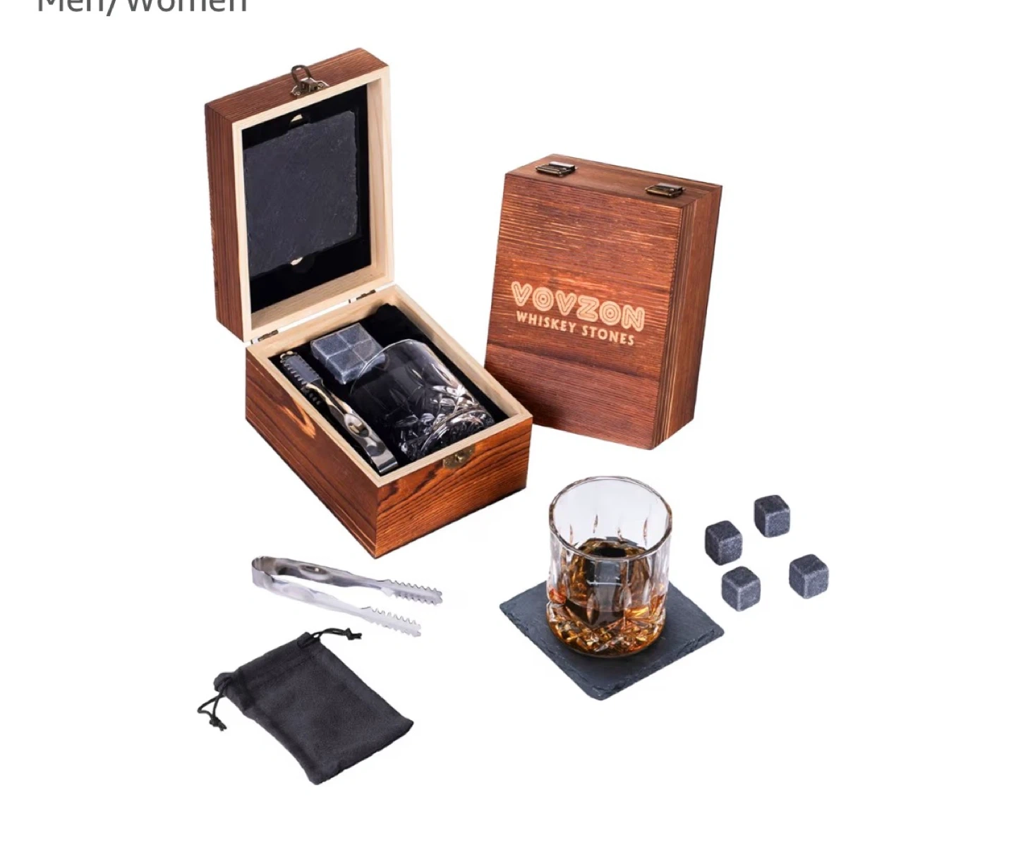 This set includes one glass, six whiskey stones, tongs, a coaster, and a carrying pouch. Everything comes neatly organized in a wooden gift box. It's perfect for keeping your drinks chilled without dilution.