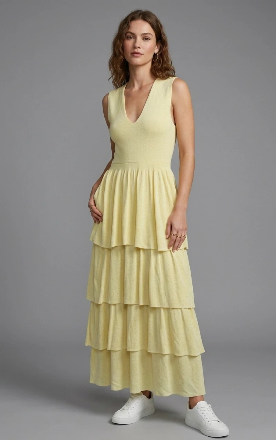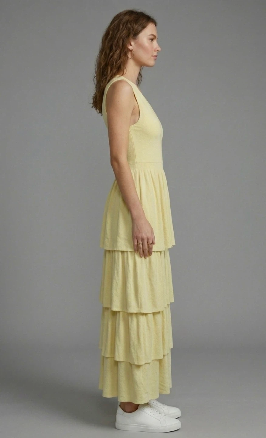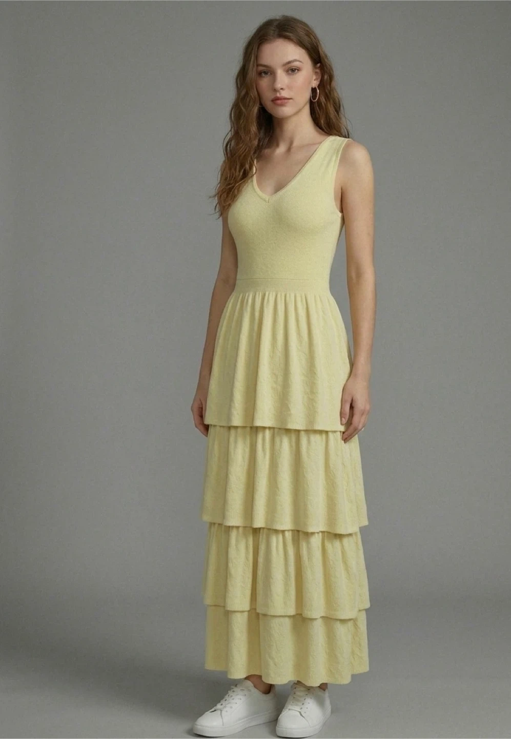 This sleeveless soft pastel maxi dress features a flattering V-neck and a tiered skirt. It's made from a textured fabric that offers a comfortable fit. A lovely choice for warm-weather outings!