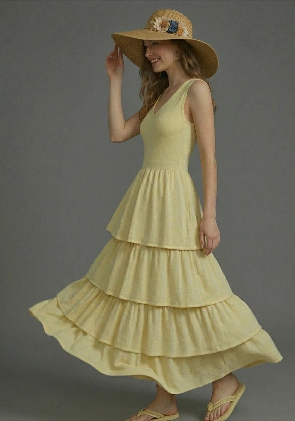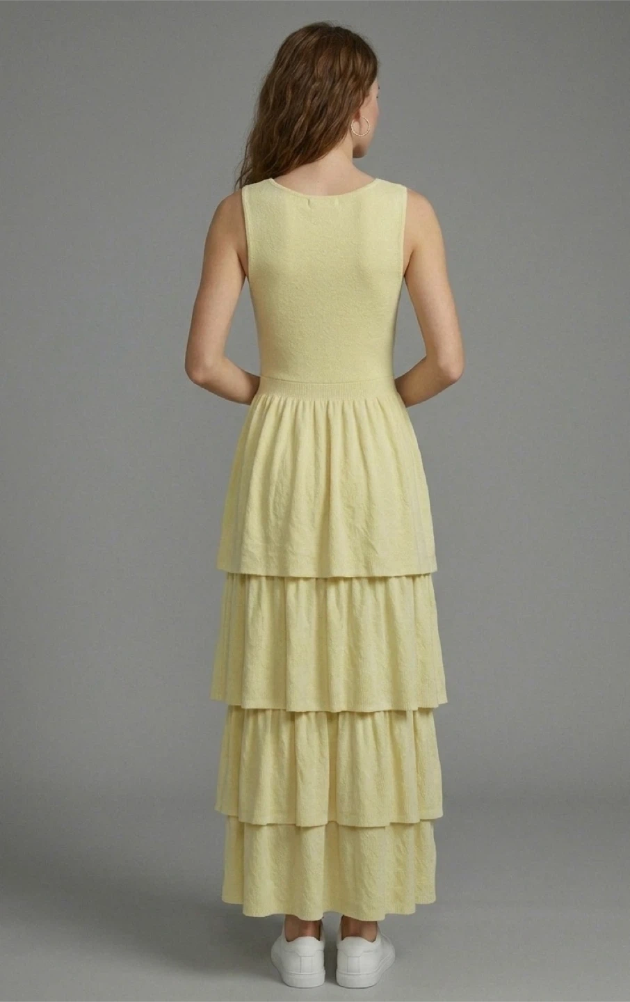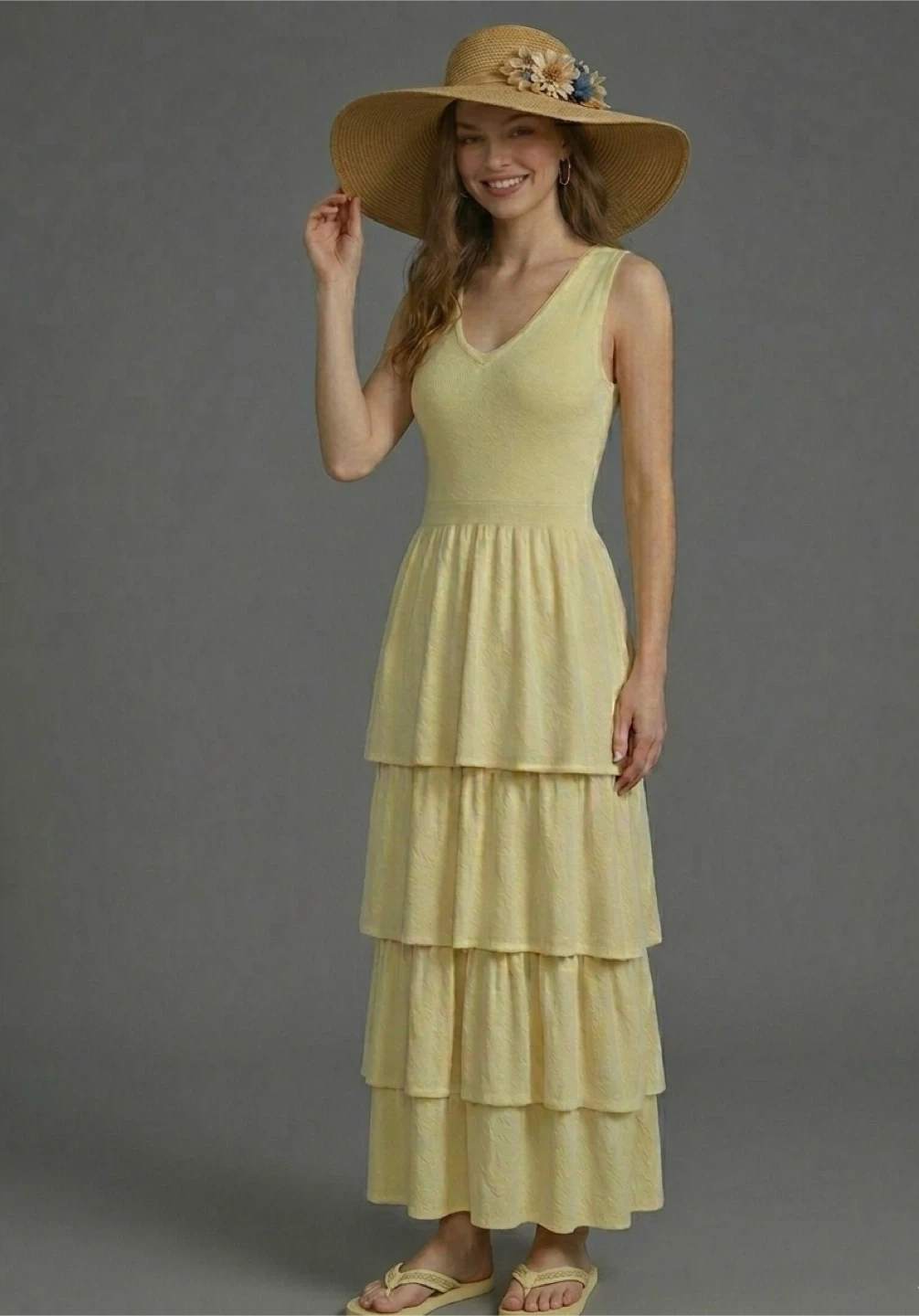 This sleeveless soft pastel maxi dress features a flattering V-neck and a tiered skirt. It's made from a textured fabric that offers a comfortable fit. A lovely choice for warm-weather outings!