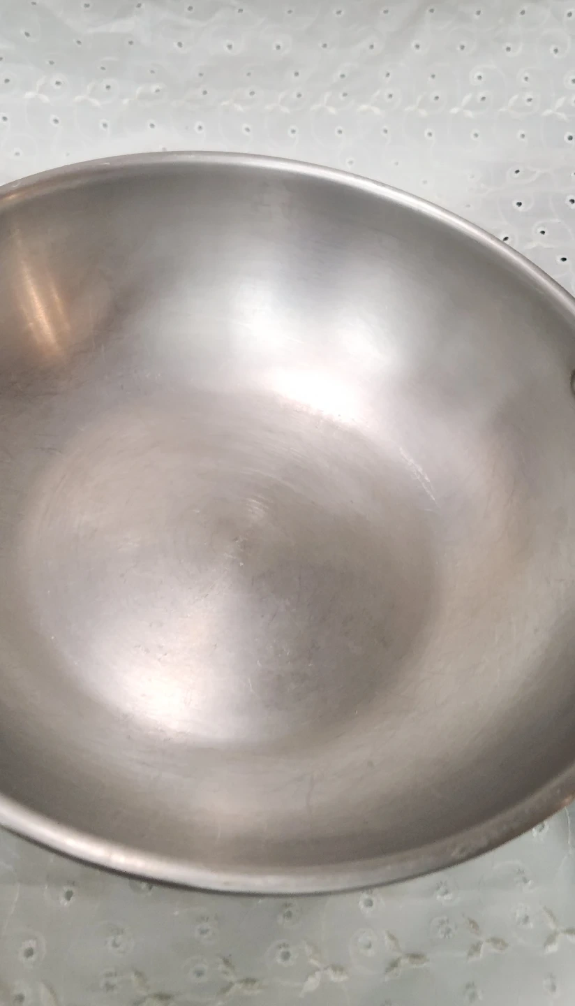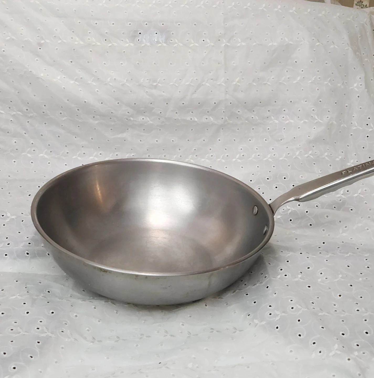 This is a Platinum brand wok, made from stainless steel. It's a good size for stir-frying or other cooking needs. This wok is useful for many types of cooking.