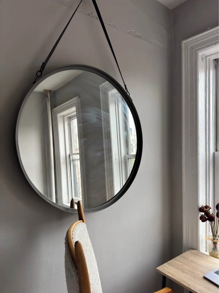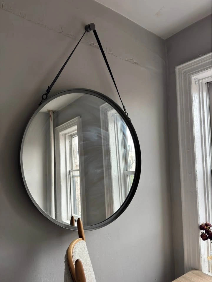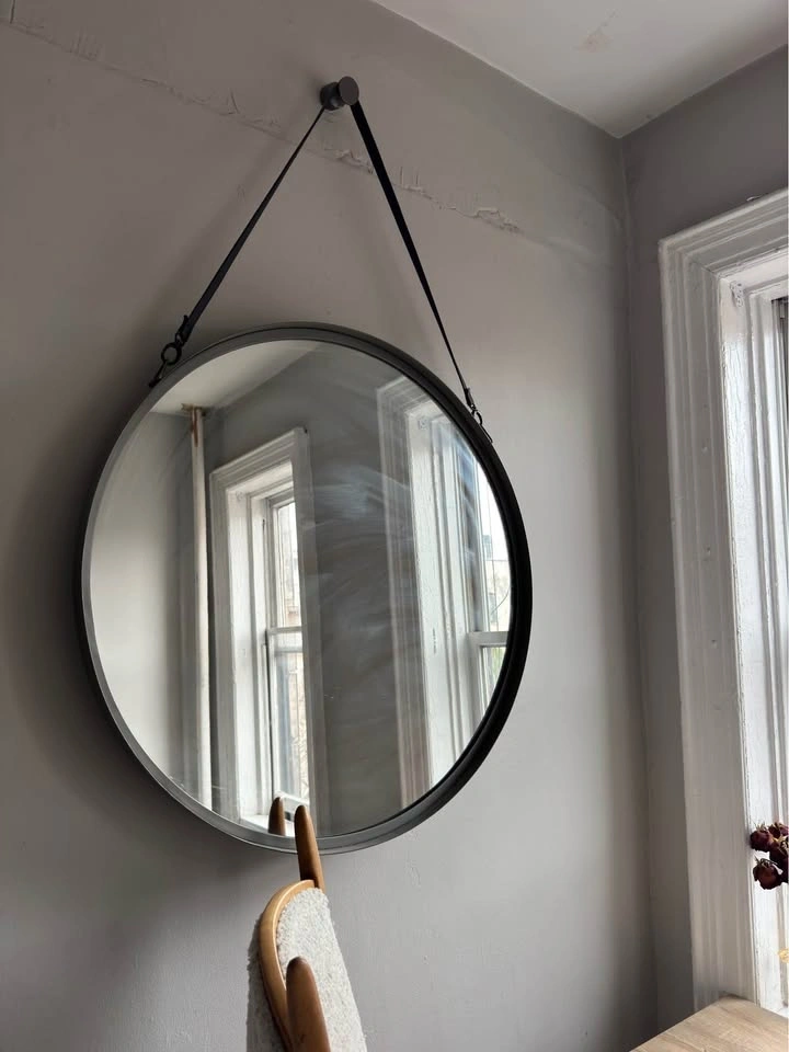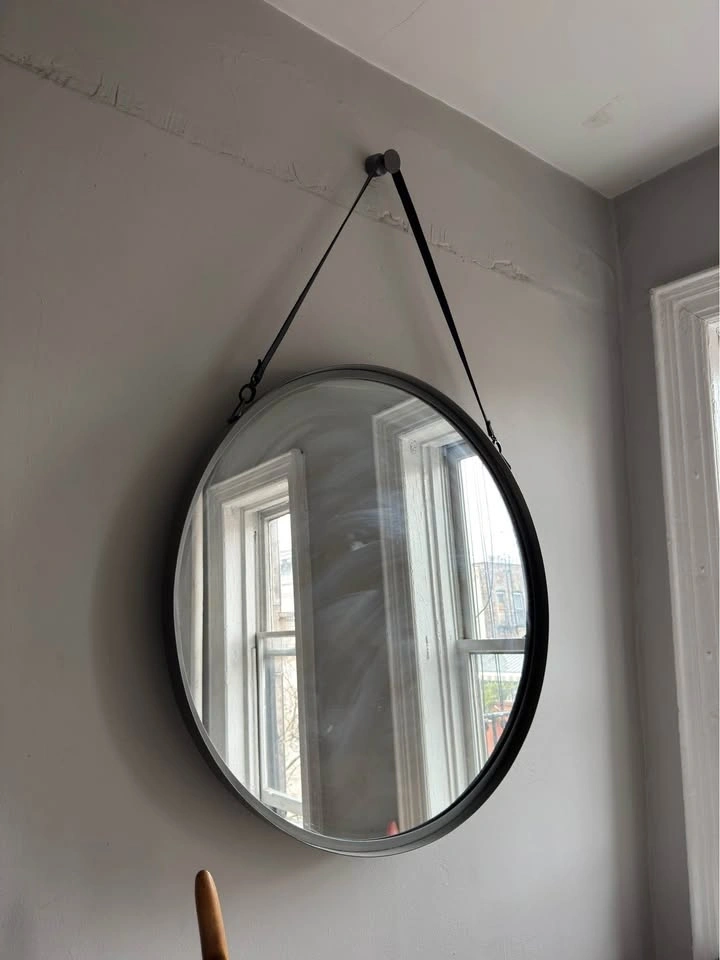 A stunning statement piece that blends raw industrial edge with sophisticated design. The CB2 Victor mirror features a hand-wrapped natural leather strap suspending a deep-set trapezoid gunmetal iron frame around polished looking glass. Mixed materials give it an effortlessly cool urban-rustic character that works in living rooms, entryways, and bedrooms. Condition: Like new — no chips, cracks, or damage. Dimensions: 36" overall | Frame: Gunmetal powder-coated iron | Weight: 24.29 lbs | Mounting hardware included. Original retail: $270. Moving sale — must go!