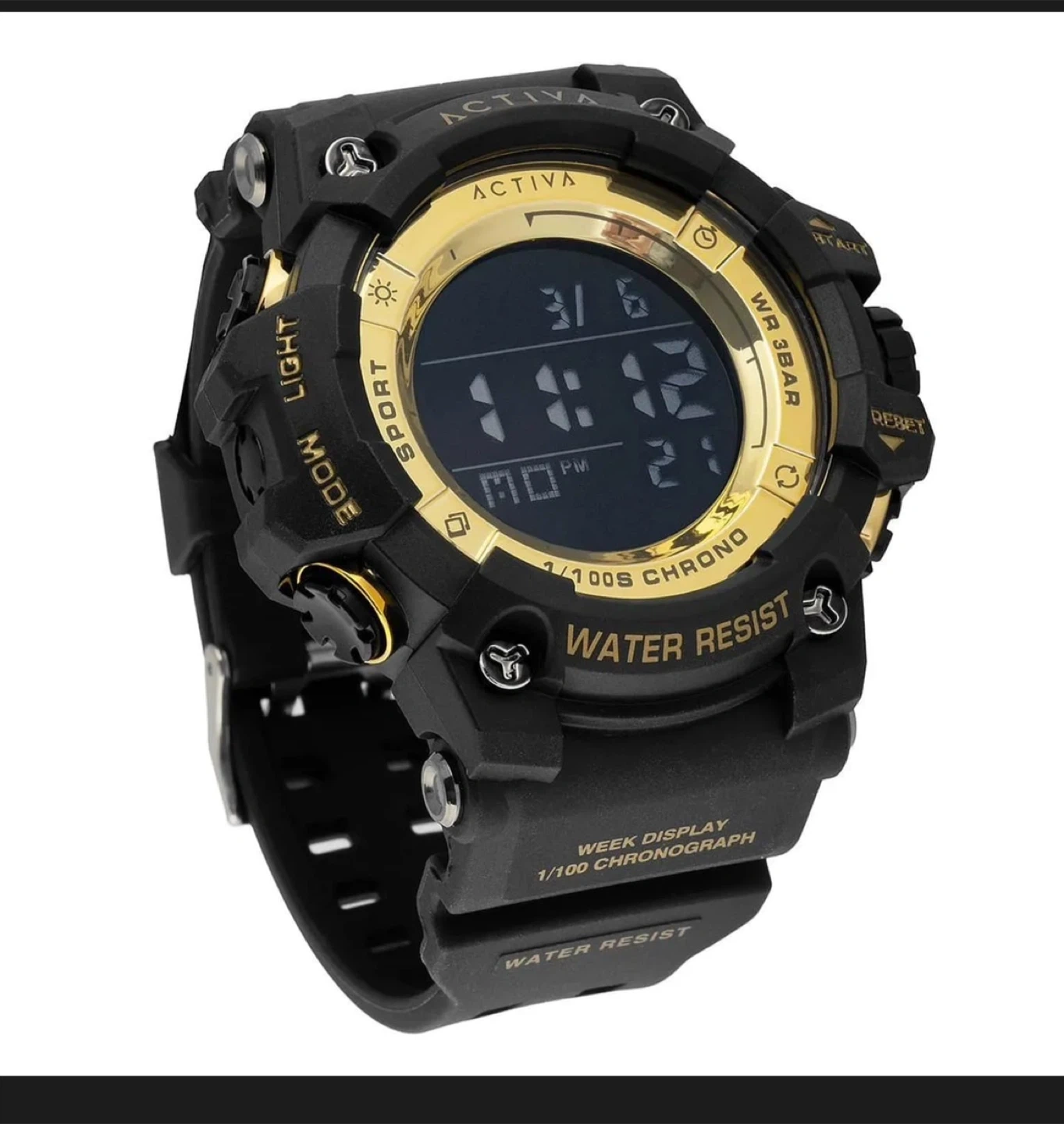 Activa digital watch with a gold bezel and black strap. It's water resistant up to 3BAR. Features include a week display and 1/100 second chronograph.
