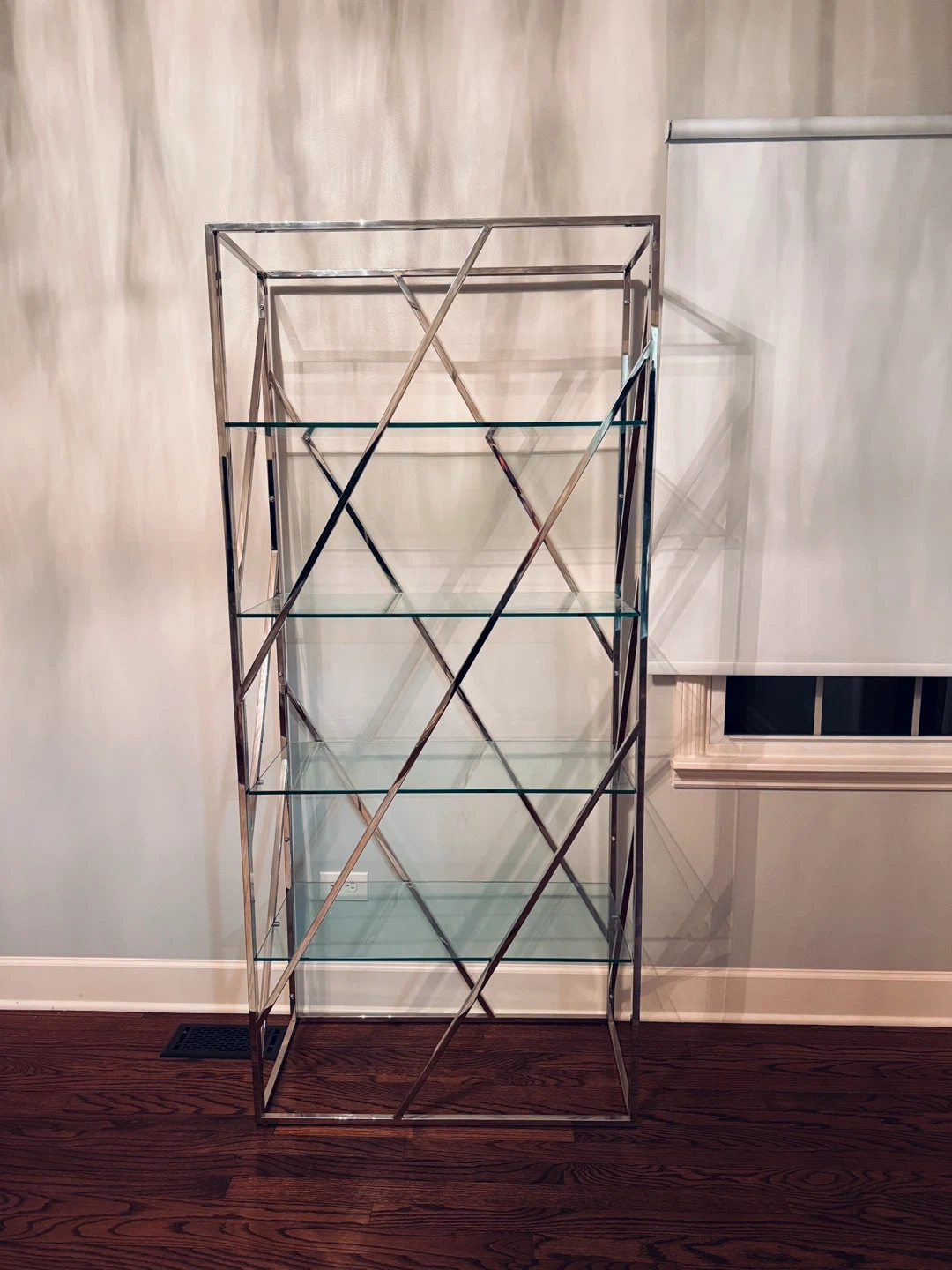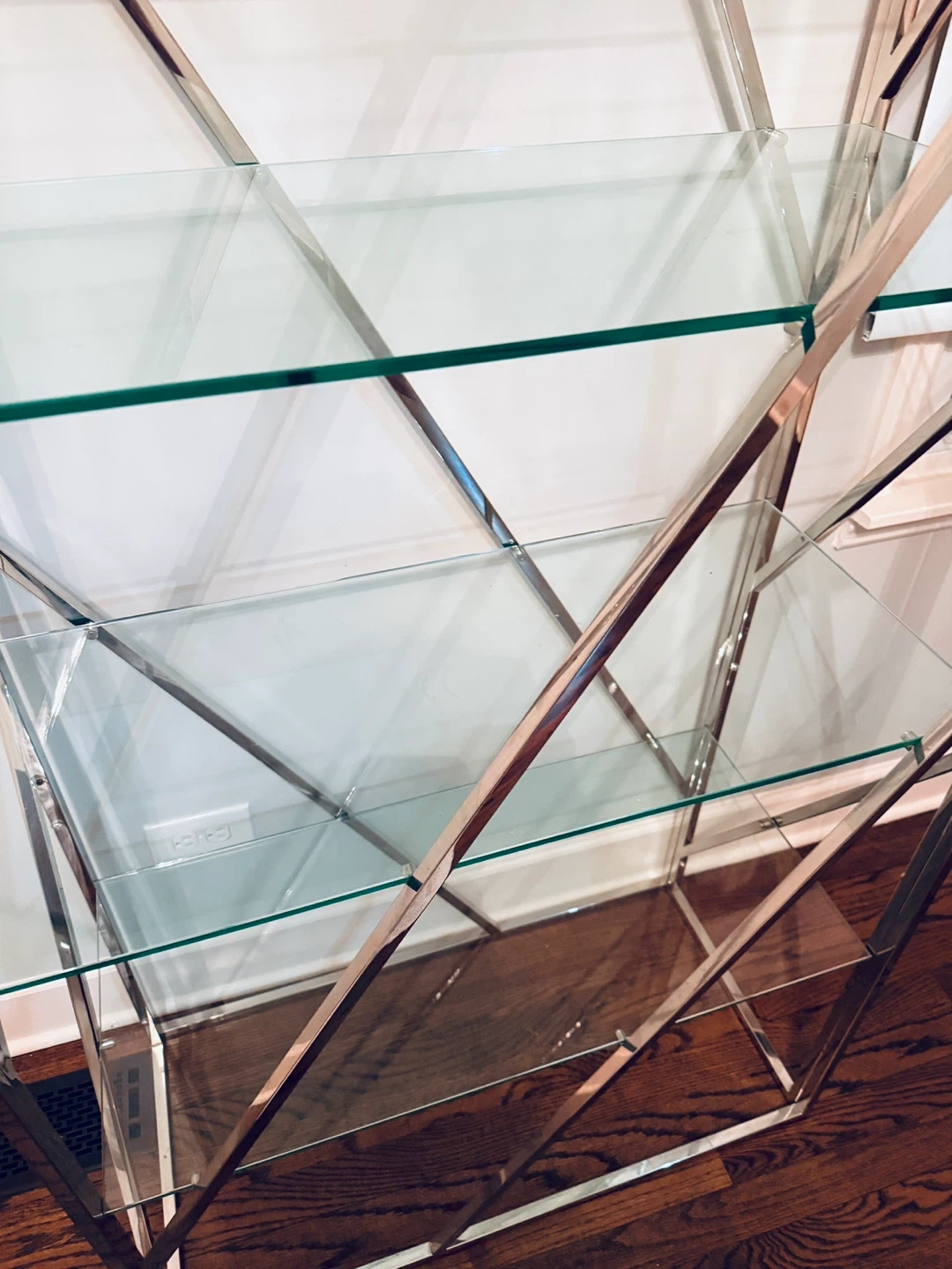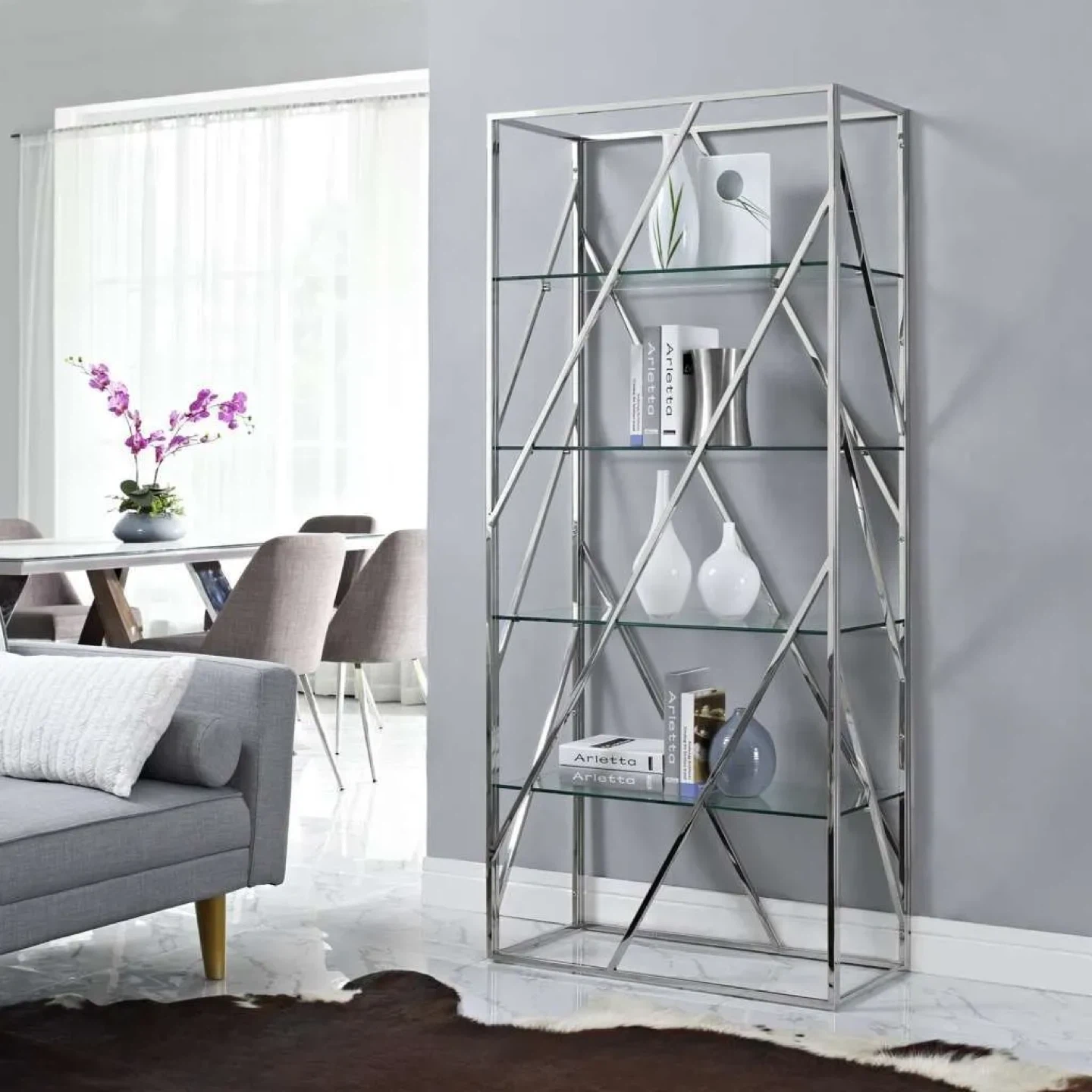 This bookshelf features a sleek, modern design with a polished metal frame and clear glass shelves. It has five spacious shelves for storage or display. This piece adds a contemporary touch to any living space!