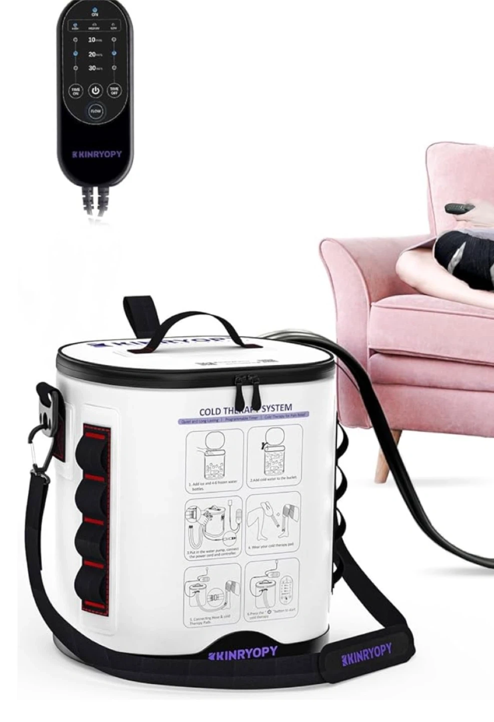 This is a KINRYOPY cold therapy system with a programmable timer and adjustable settings. It includes the main unit, a remote, and a strap. The unit has a capacity for 4-6 frozen water bottles.