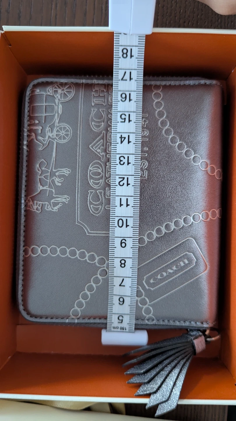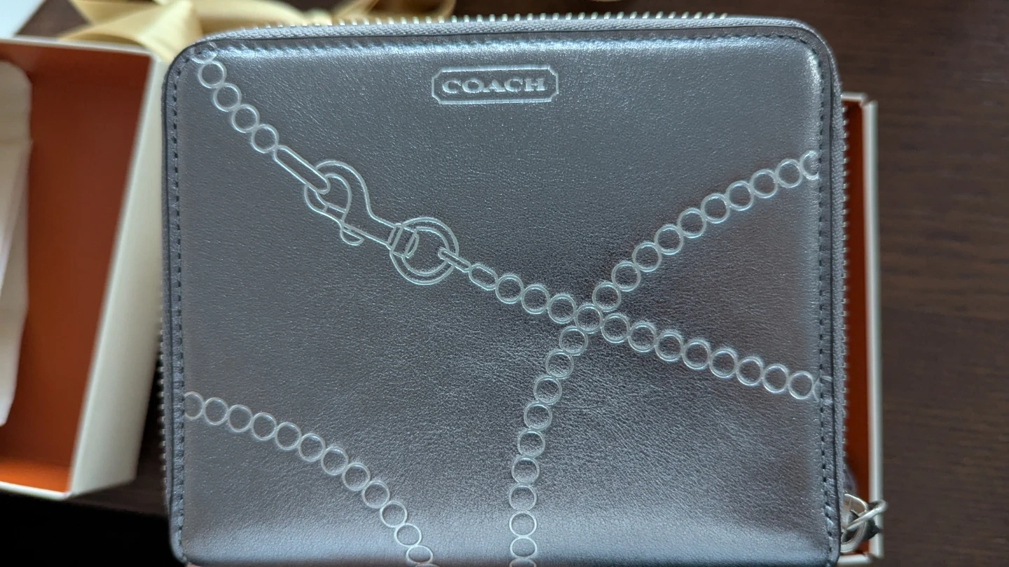 This is a Coach bifold zip wallet in a unqiue pattern and metallic silver colour. It's made of leather and includes an interior coin pocket and card slots. It comes in its original box great for use or gifting!