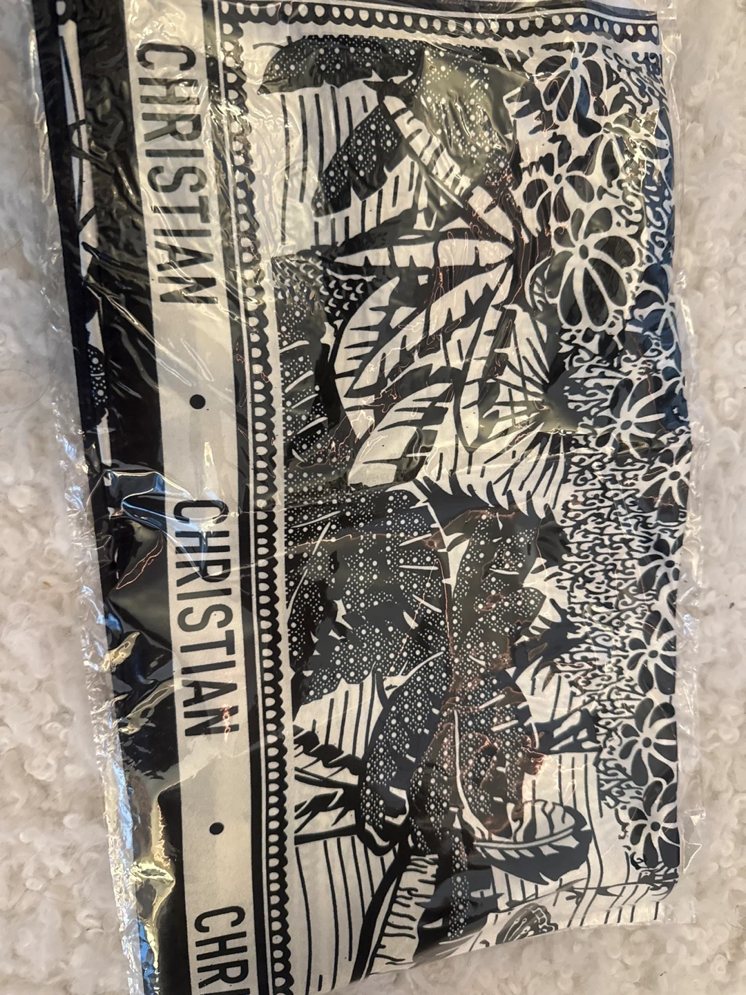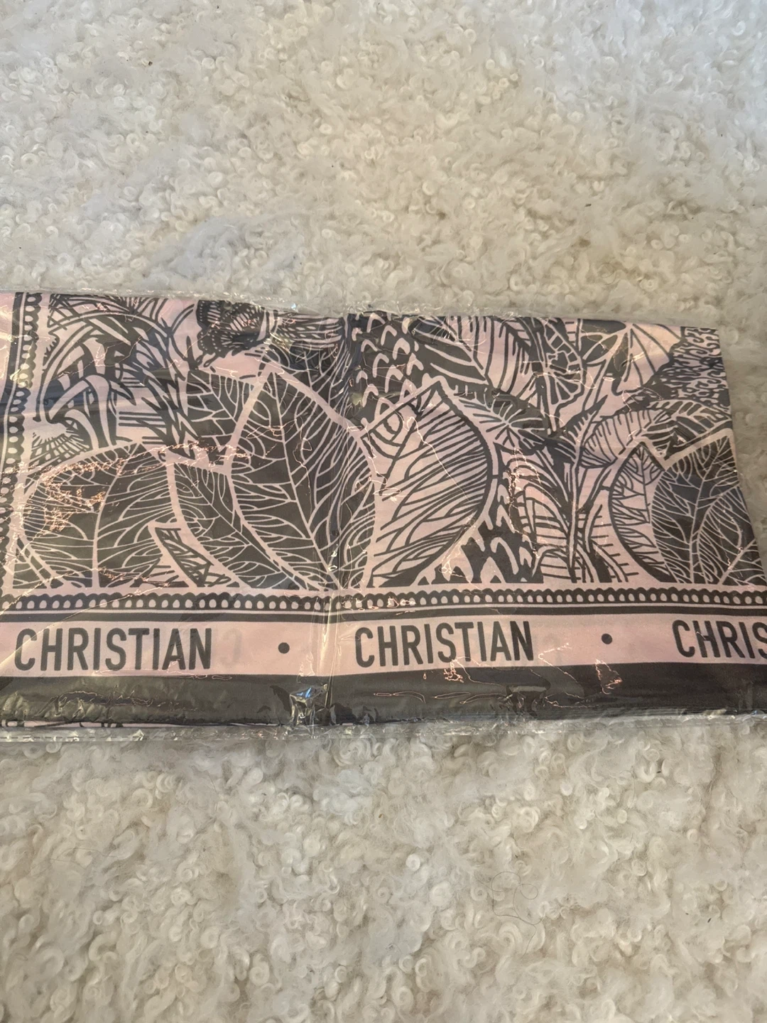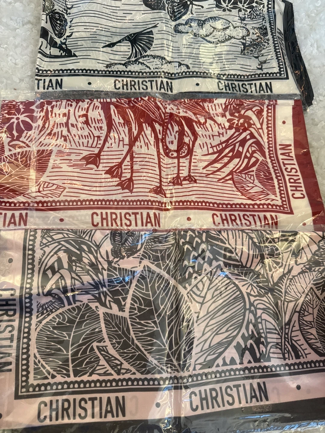 Three Christian Dior silk scarves with botanical prints. Each scarf features the Christian Dior logo along the border. Each is $45 very elegant pieces.