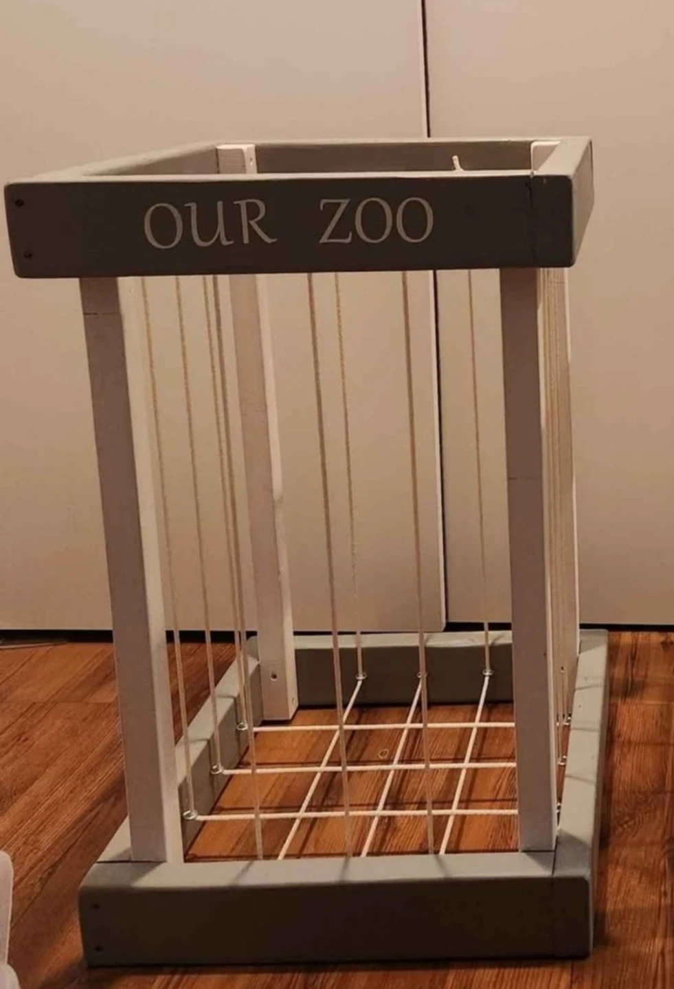 This is an Our Zoo wooden Stuffy Storage! It's designed with hanging strings and a grid at the bottom to hole all your child's stuffed animals. Its construction is primarily wood with a grey and white finish.