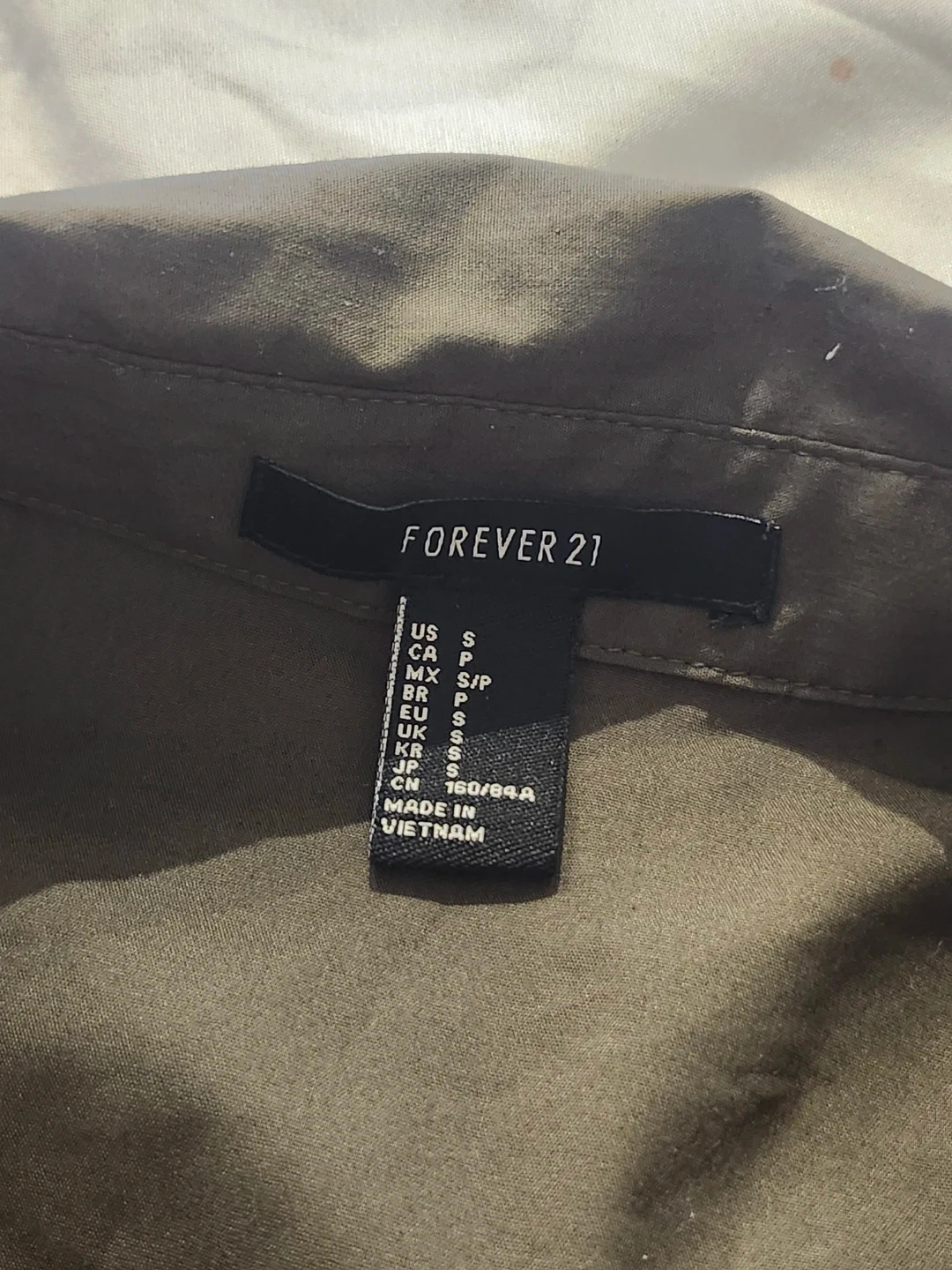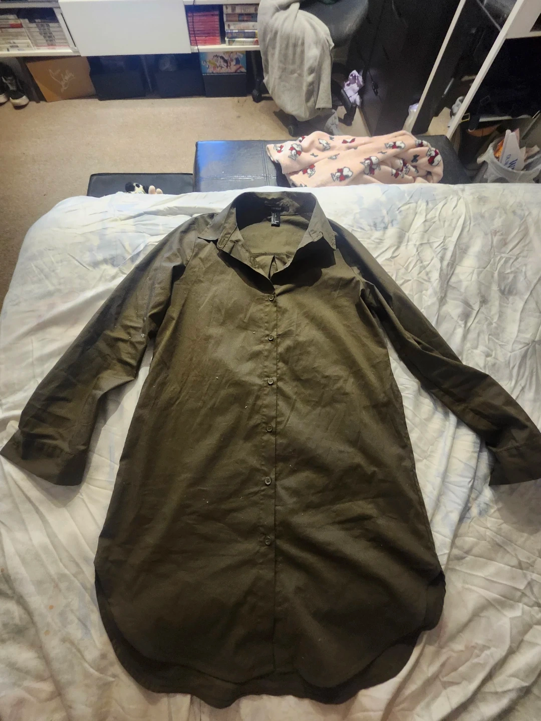 This is a Forever 21 olive green long-sleeved button-up shirt dress. It's a size small. It features a classic collar and button-front closure.