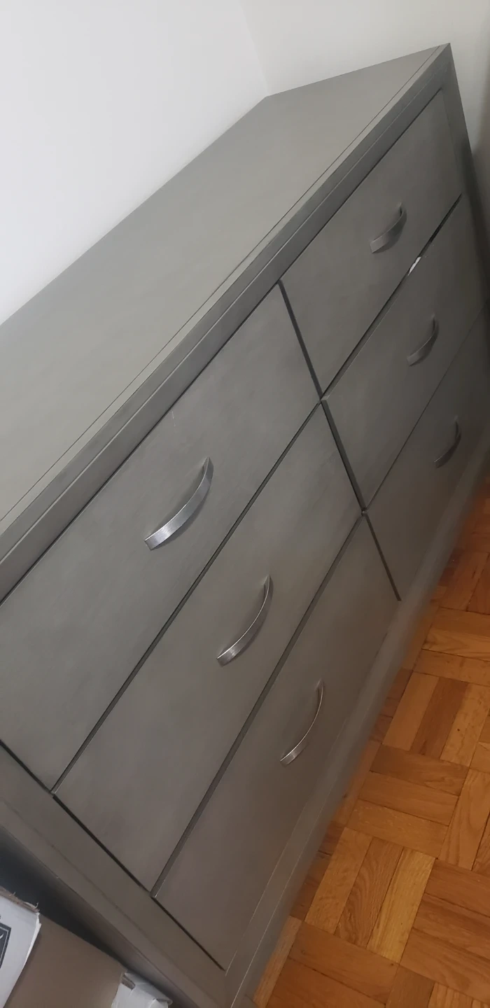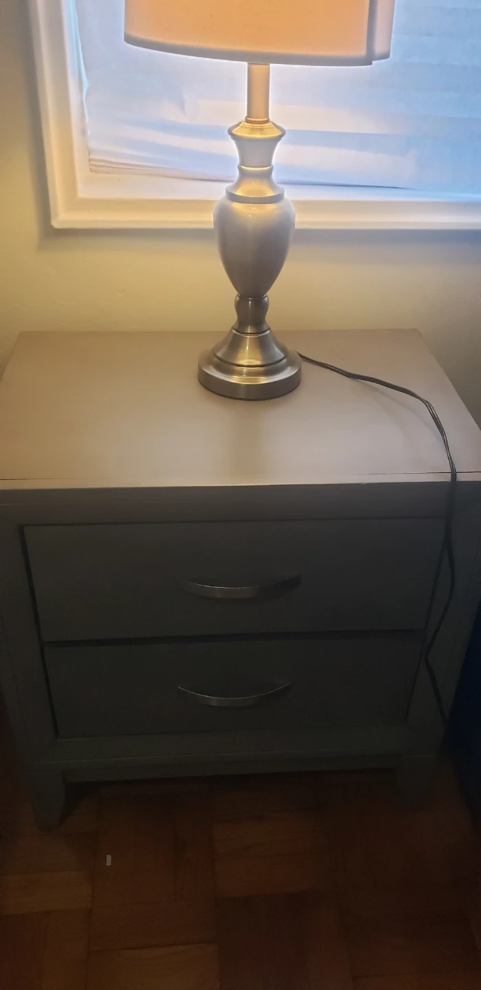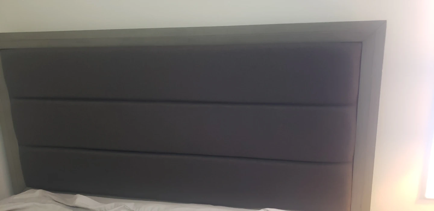 Includes a gray upholstered headboard footboard a six-drawer dresser. Headboard is padded with horizontal panels. Dresser has silver tone drawer pulls. One nightstand. Furniture set for bedroom.