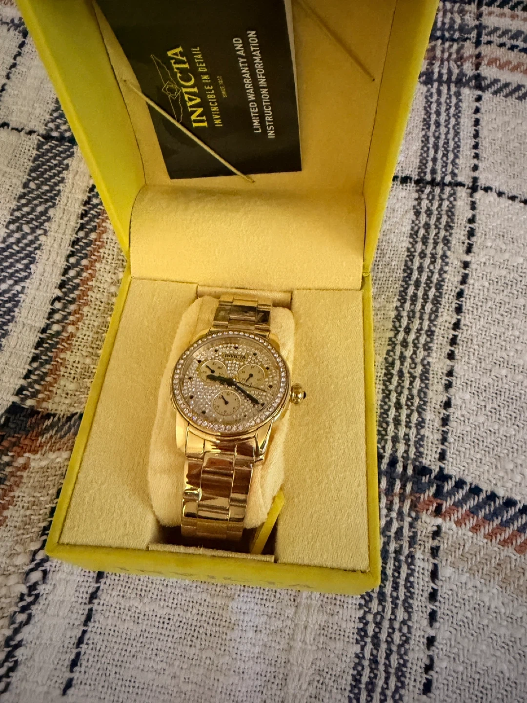 This Invicta watch features a gold-tone stainless steel band and case. It's embellished with crystal accents around the dial. Includes original box and instruction manual.
