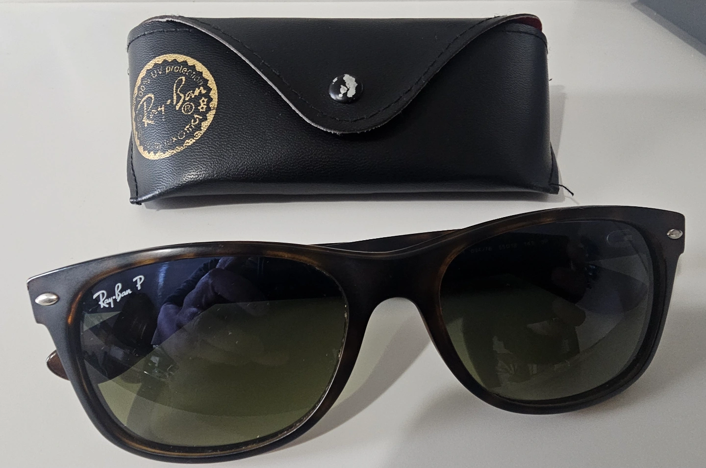 Ray-Ban sunglasses, tortoiseshell frame, dark lenses. Includes original case. Pre-owned.