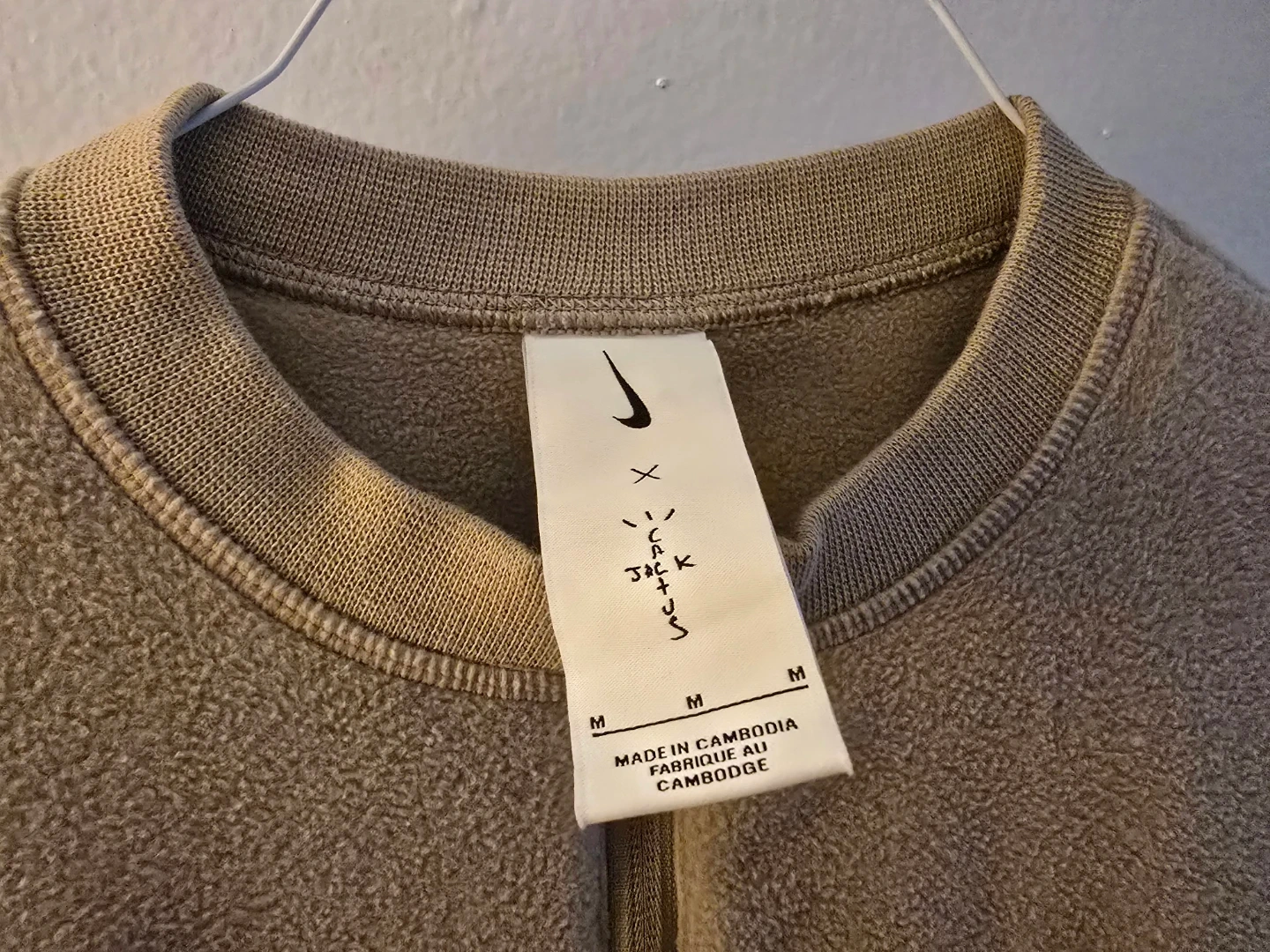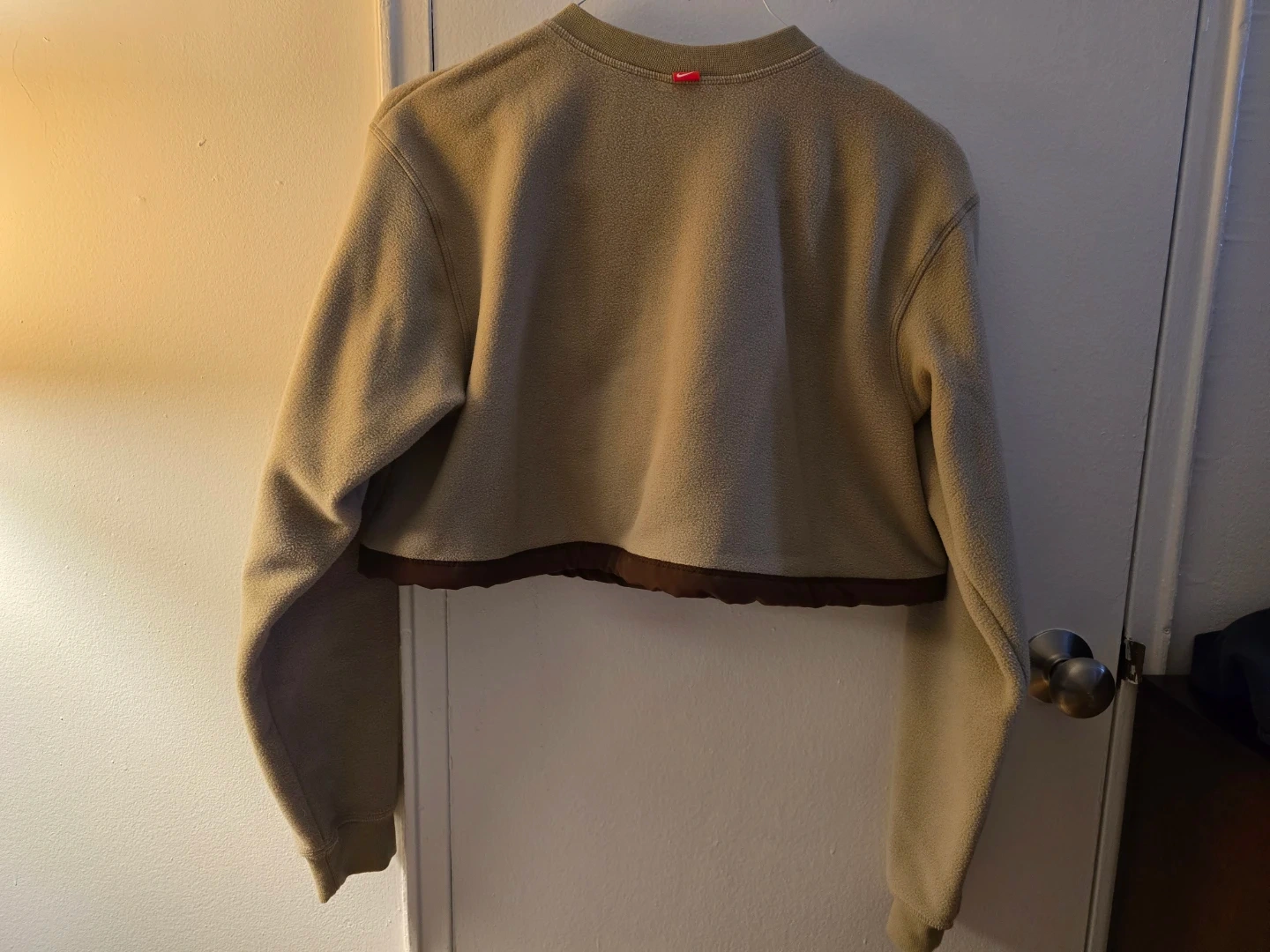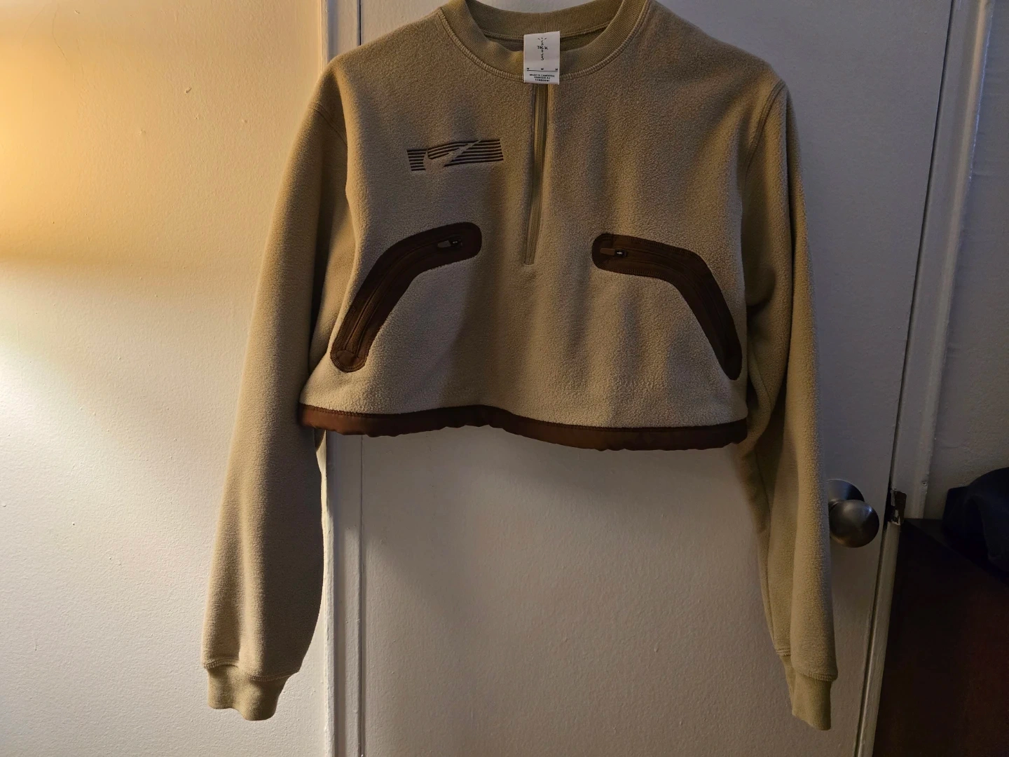 This is a Nike Travis Scott x Jordan "Cactus Jack" fleece crop top. It's a size medium and made in Cambodia. Features include a quarter-zip closure and brown trim details. New without tag!