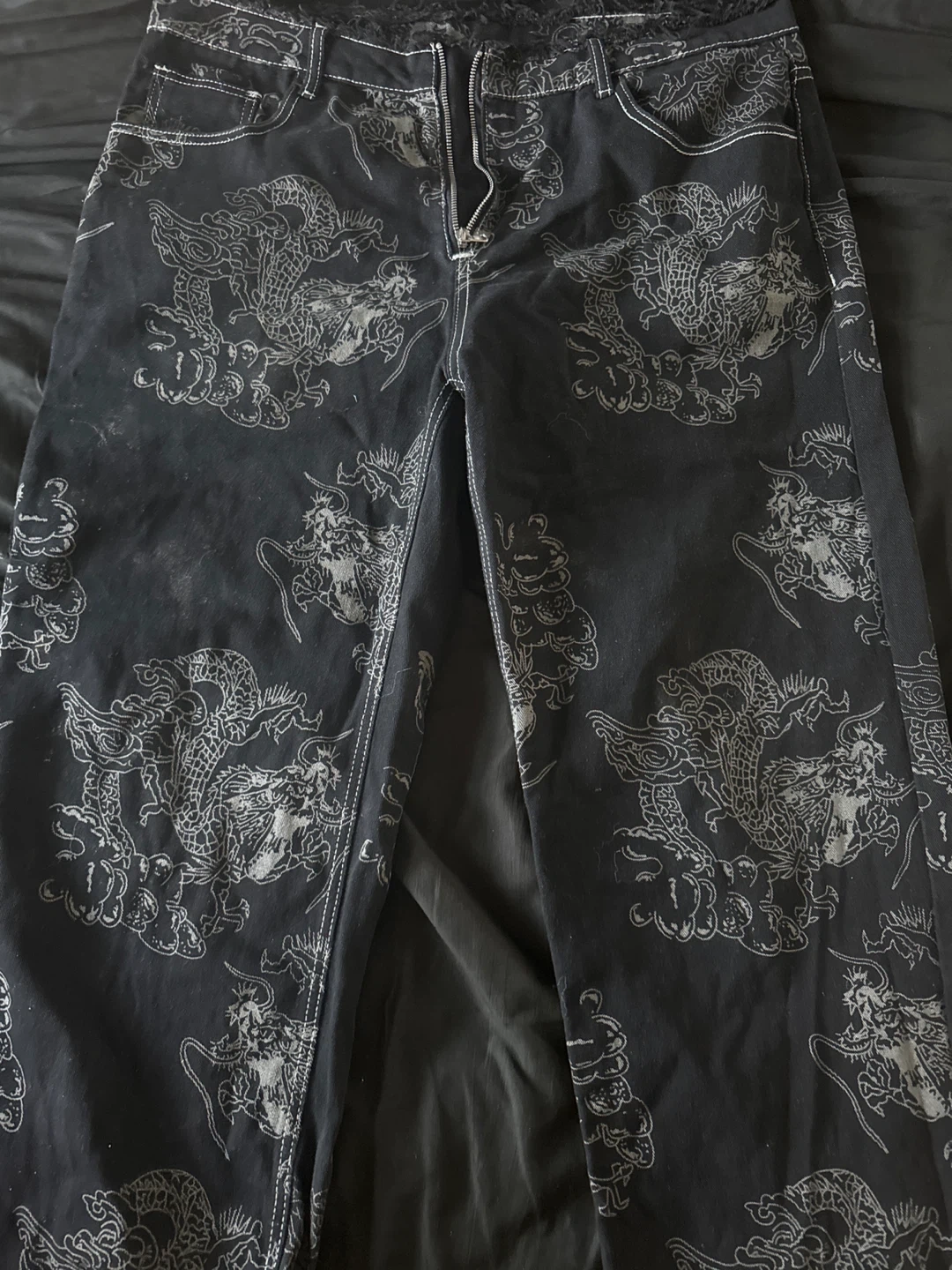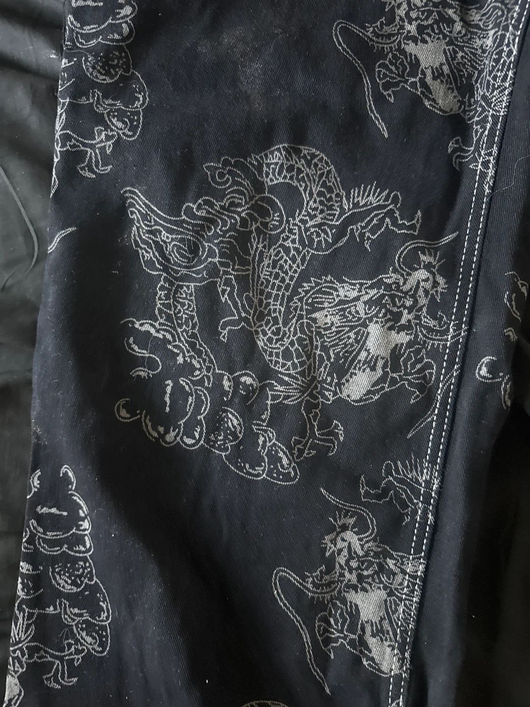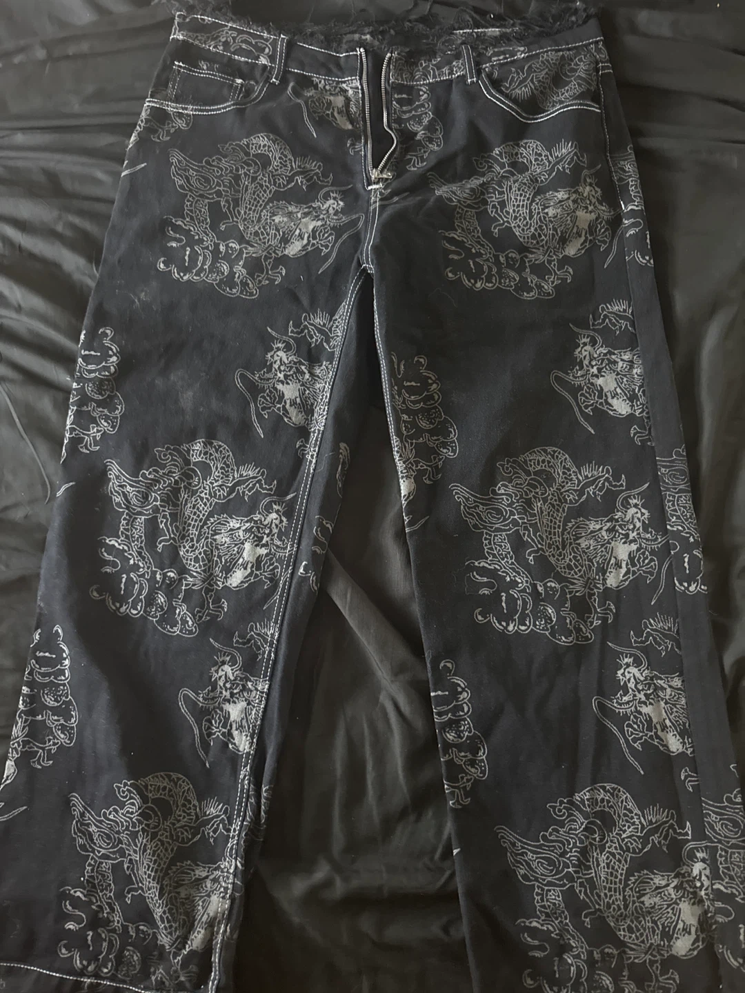 These are a pair of denim jeans with a dragon print. They appear to be in good condition and have a unique style. Perfect for someone looking to add a statement piece to their wardrobe!