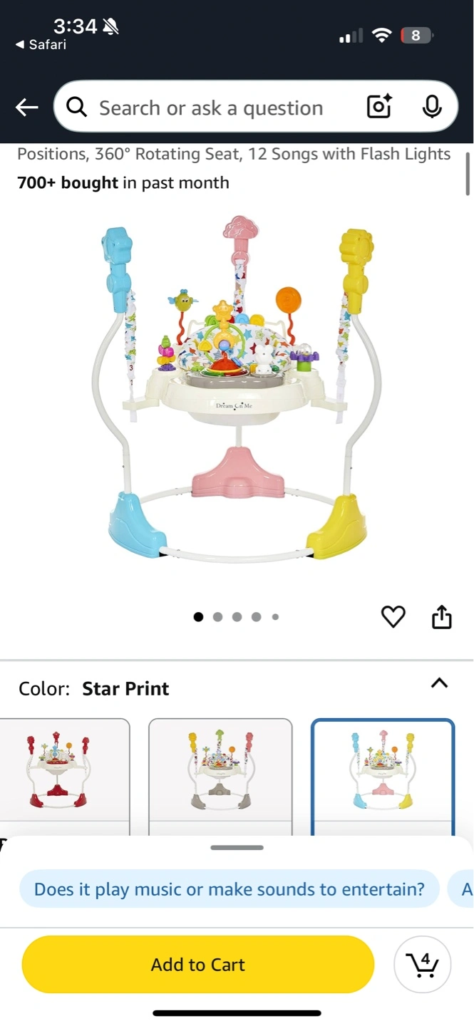 Baby jumper, 360° rotating seat. Plays 12 songs with flashing lights. Multiple positions.