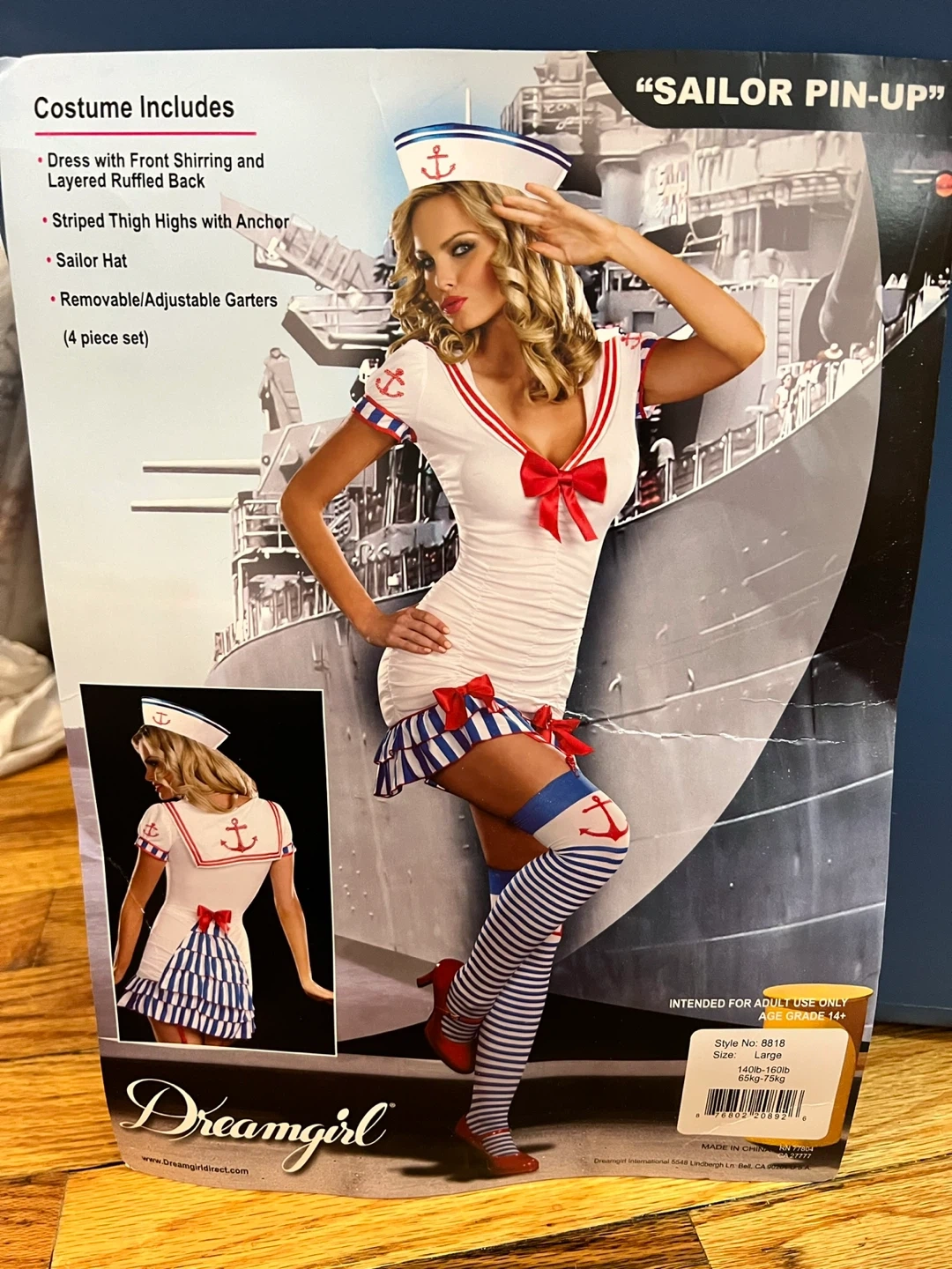 10Selling a Dreamgirl Sailor Pin-Up costume, size Large! This 4-piece set includes: - Dress with front shirring and layered ruffled back - Striped thigh highs with anchor - Sailor hat - Removable/adjustable garters Intended for adult use only, age grade 14+