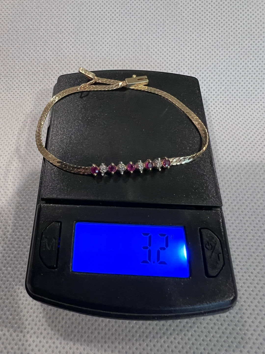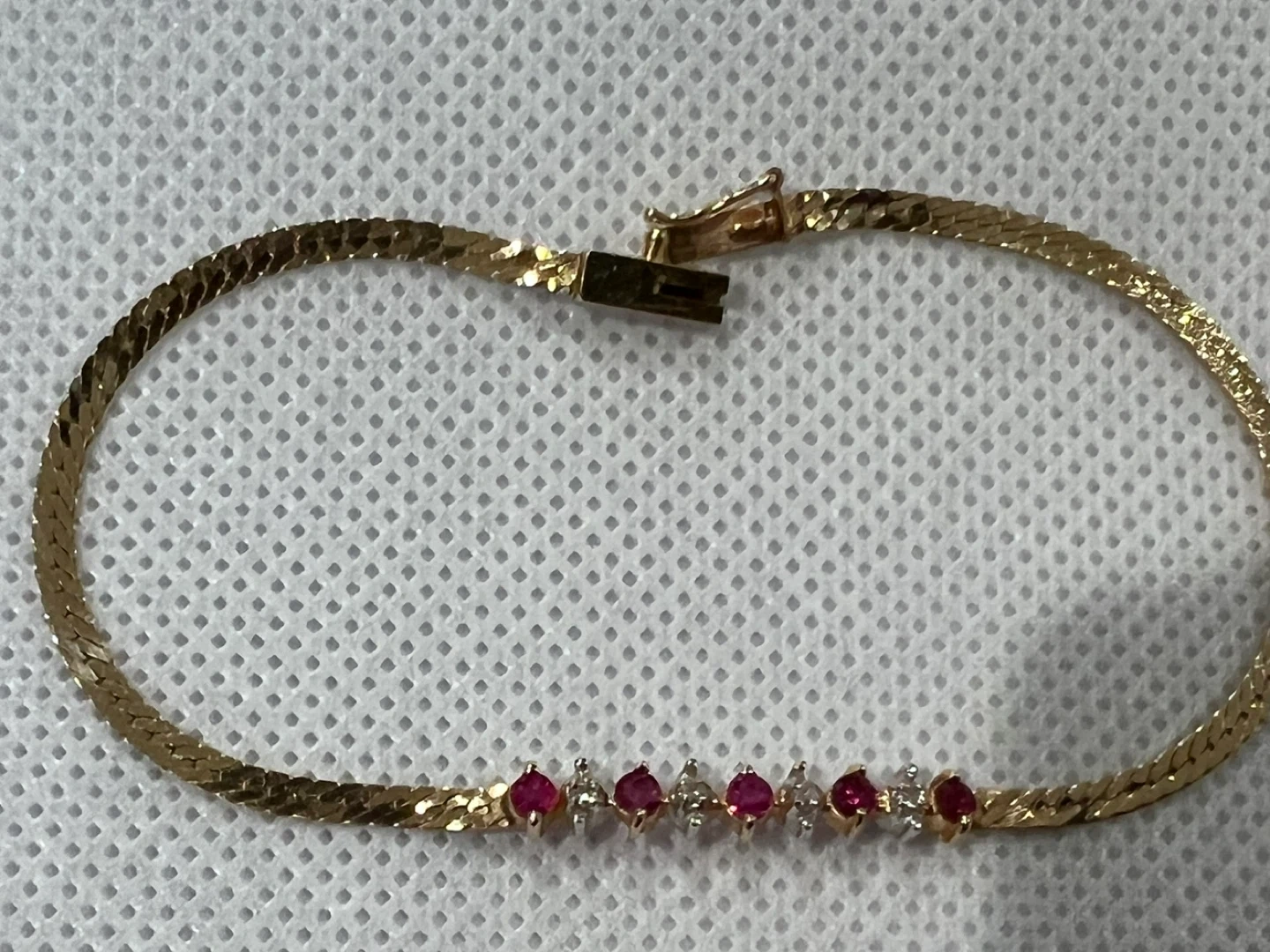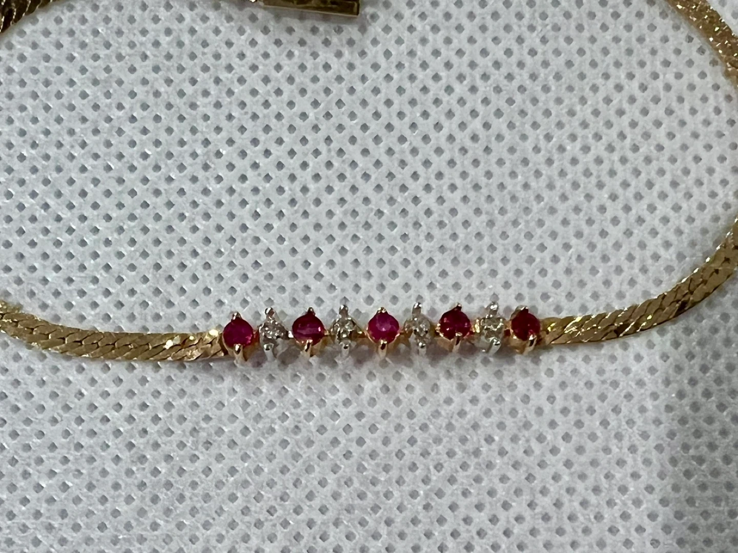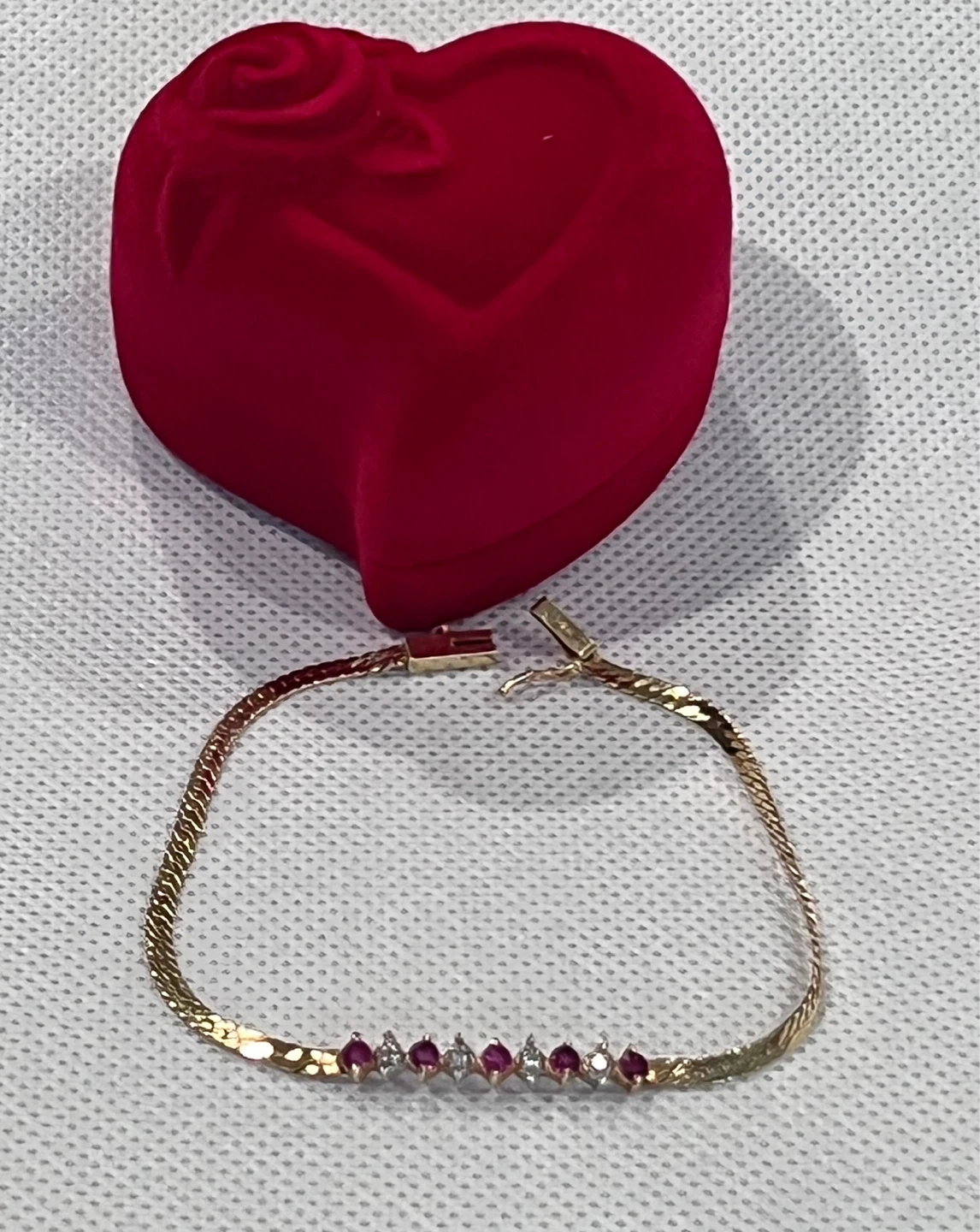 This is a 14k gold bracelet with a herringbone chain. It features alternating rubies and diamonds. The bracelet weighs 3.2 grams. It comes with a red velvet heart-shaped jewelry box.