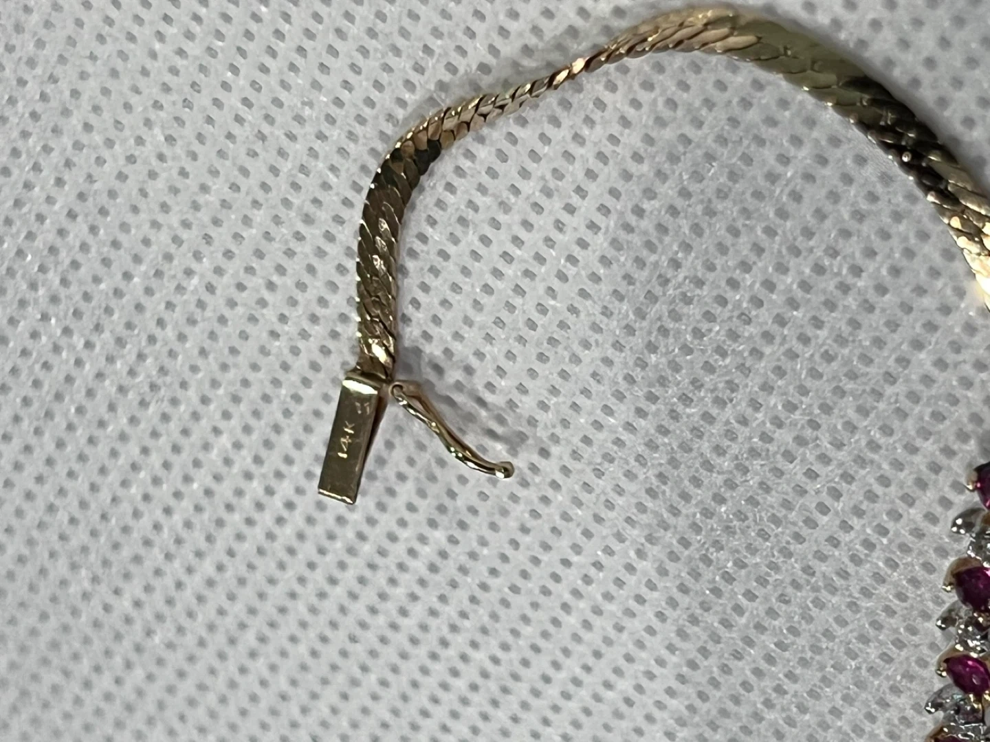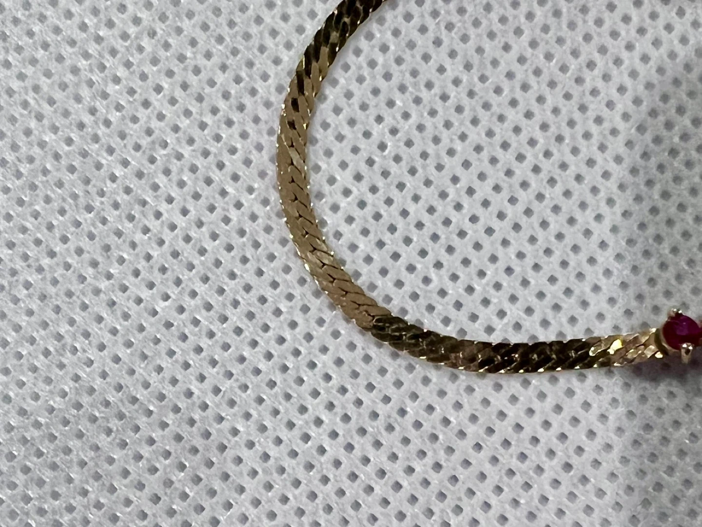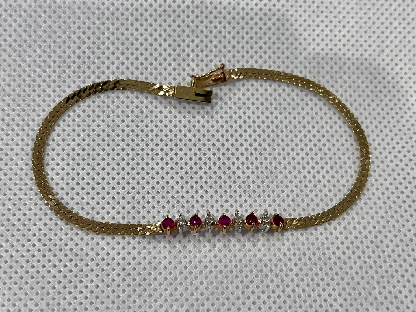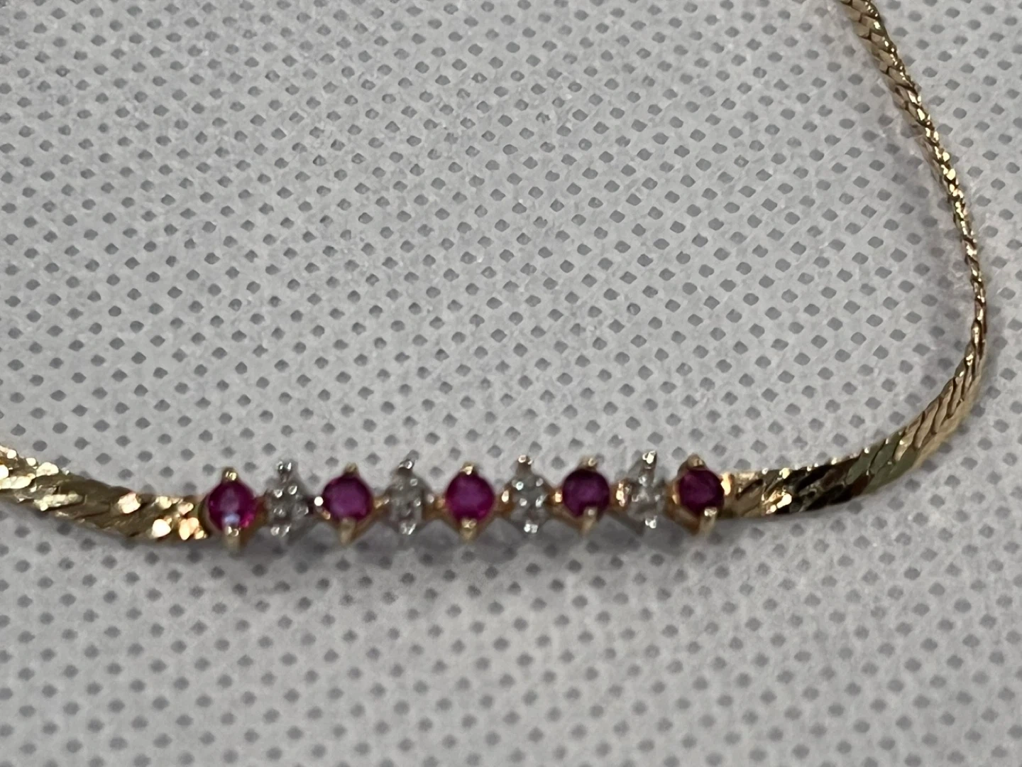 This is a 14k gold bracelet with a herringbone chain. It features alternating rubies and diamonds. The bracelet weighs 3.2 grams. It comes with a red velvet heart-shaped jewelry box.