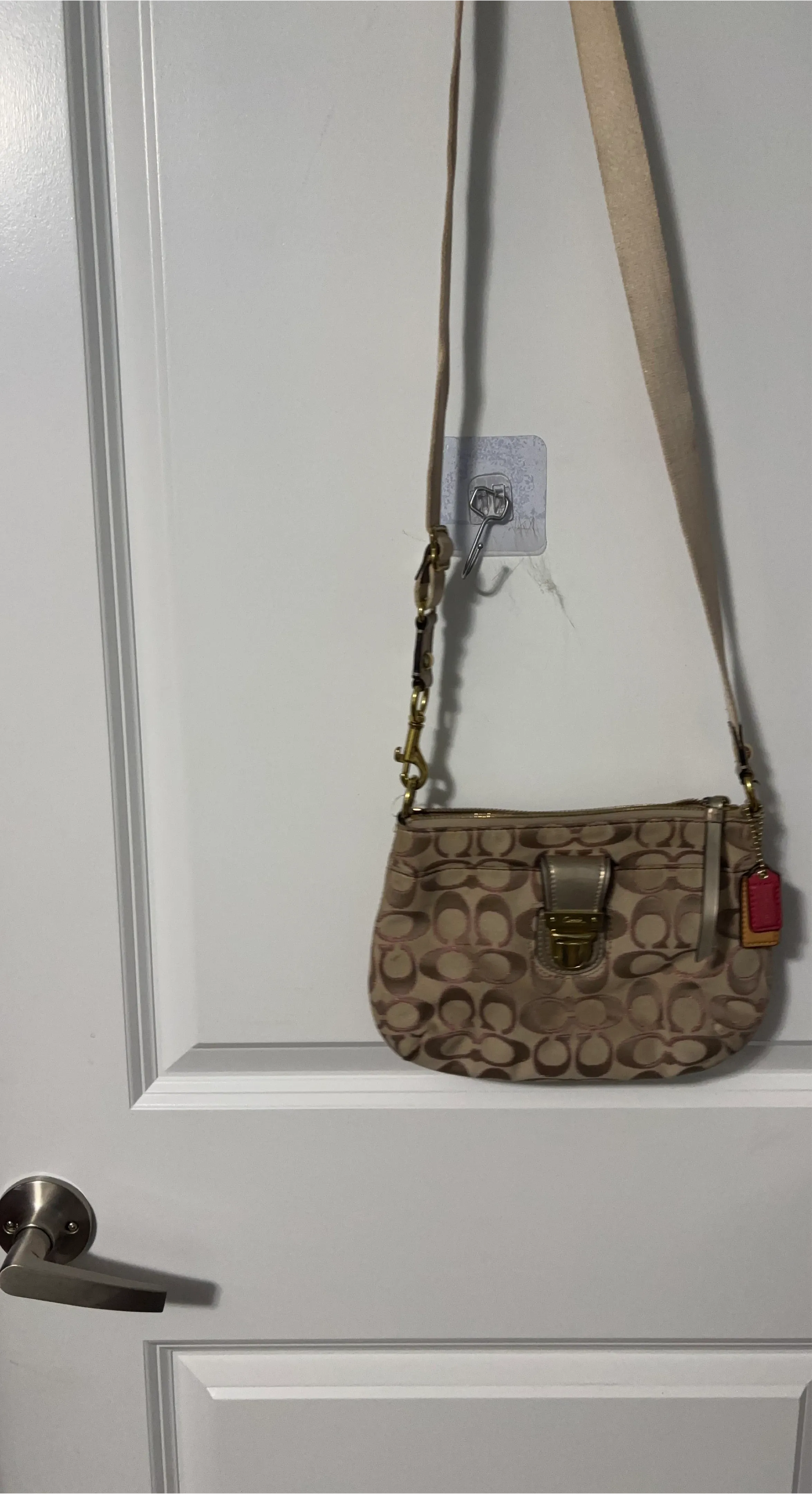 A classic Coach shoulder bag in signature monogram canvas. It has a secure clasp closure and a fabric strap. Includes a small pink and tan hang tag.