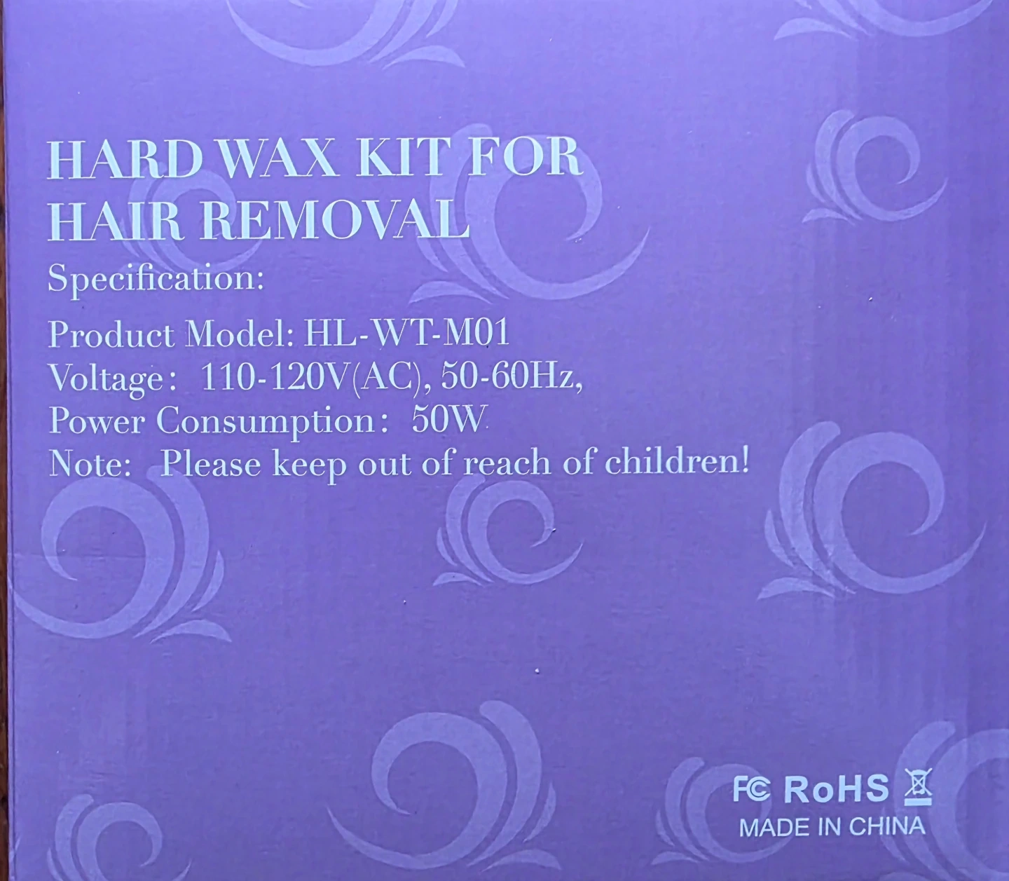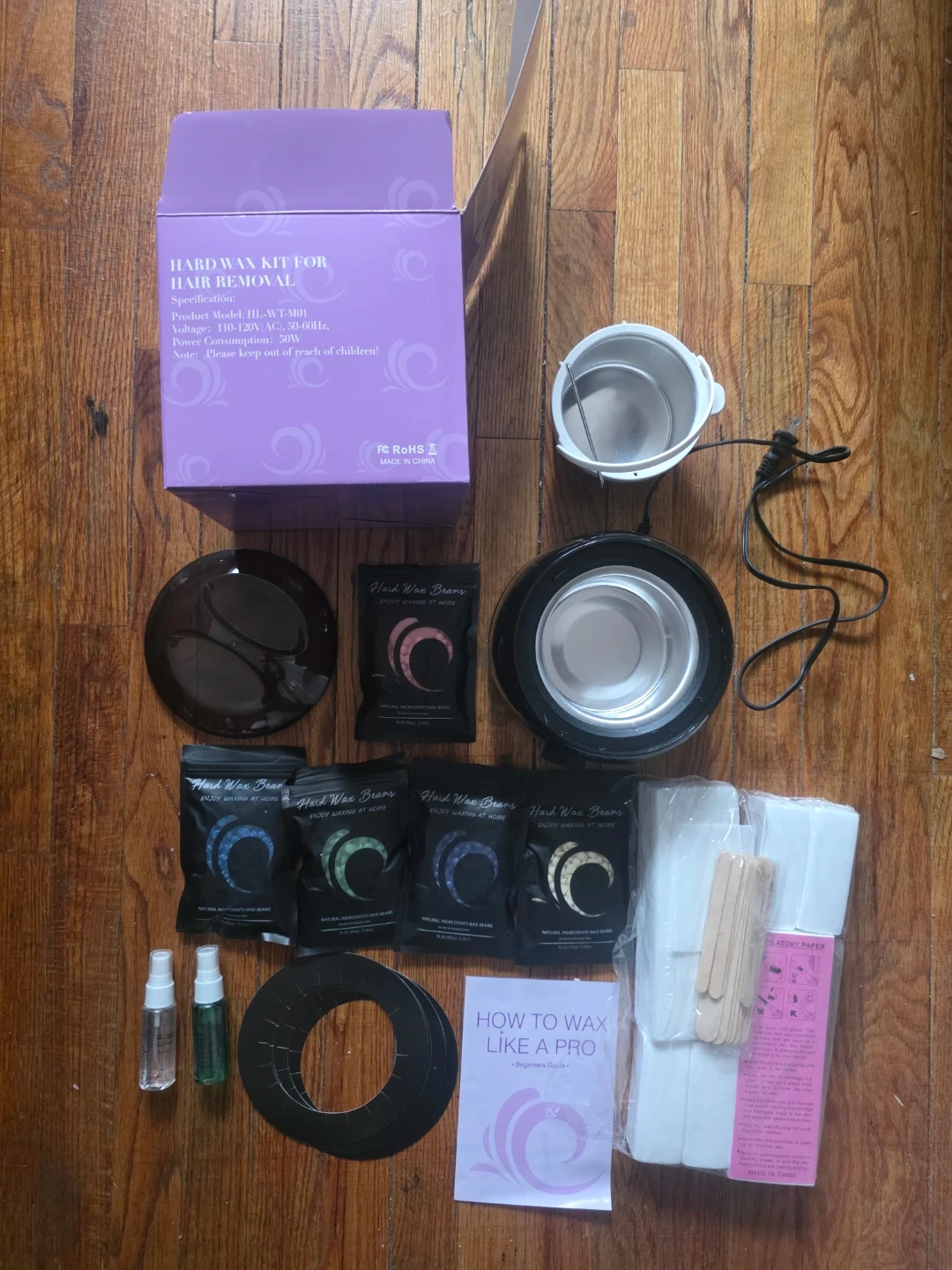 This hard wax kit for hair removal includes a wax warmer, wax beans, and accessories. It operates on 110-120V with 50W power consumption. Includes a beginner's guide for use.