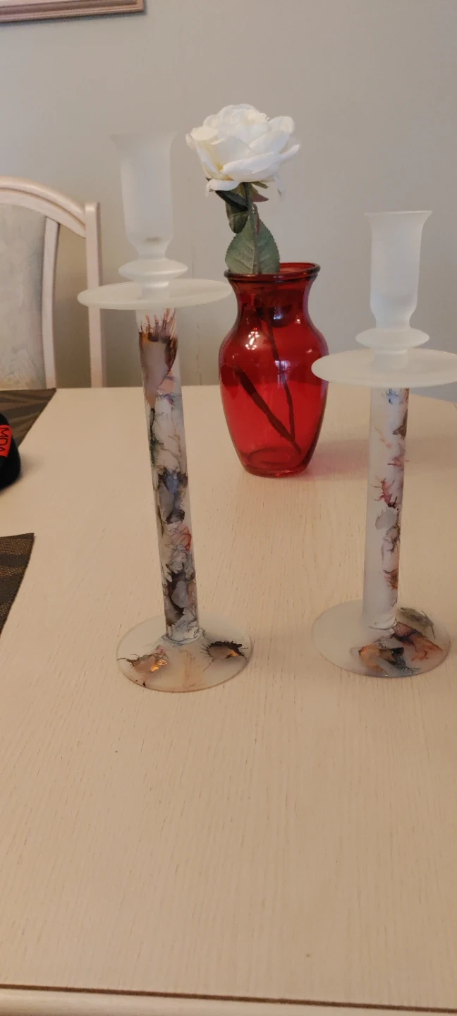 This is a set of two decorative glass candlesticks. Each candlestick features a frosted glass top and a clear glass base with a colourful, abstract design along the stem. They're perfect for adding a touch of elegance to any table setting. A red vase with a faux rose is also pictured but not included.