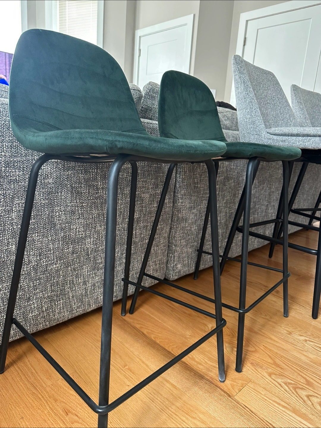 Counter height stools. Green velvet seat. Black legs. Enjoy your morning coffee while seated at your kitchen island in these comfortable stools.