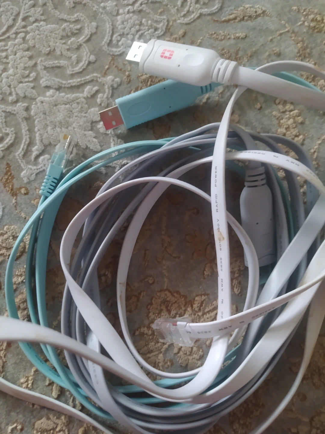 This is a bundle of various USB and Ethernet cables. Includes USB-A to USB-mini, and a white USB cable with a red logo. One blue Ethernet cable is also included.