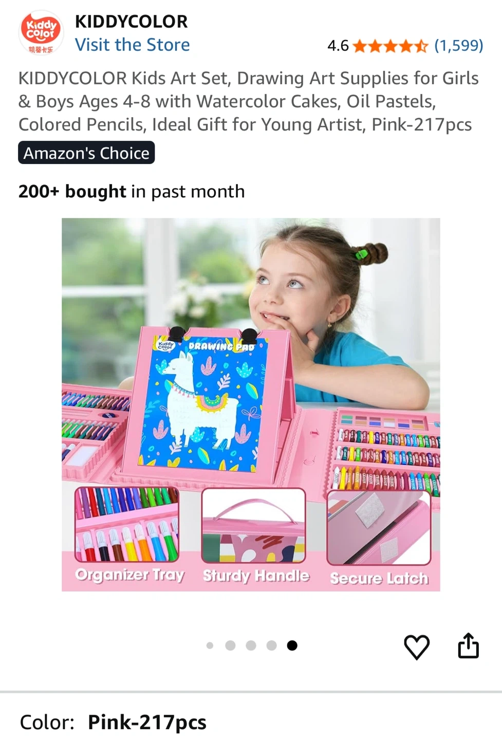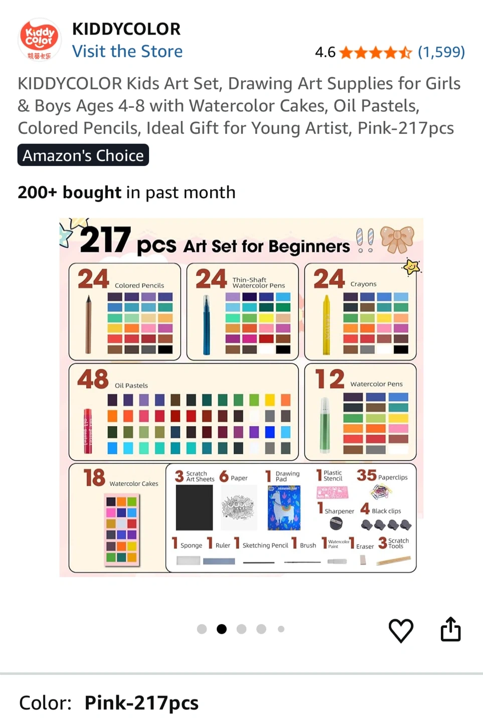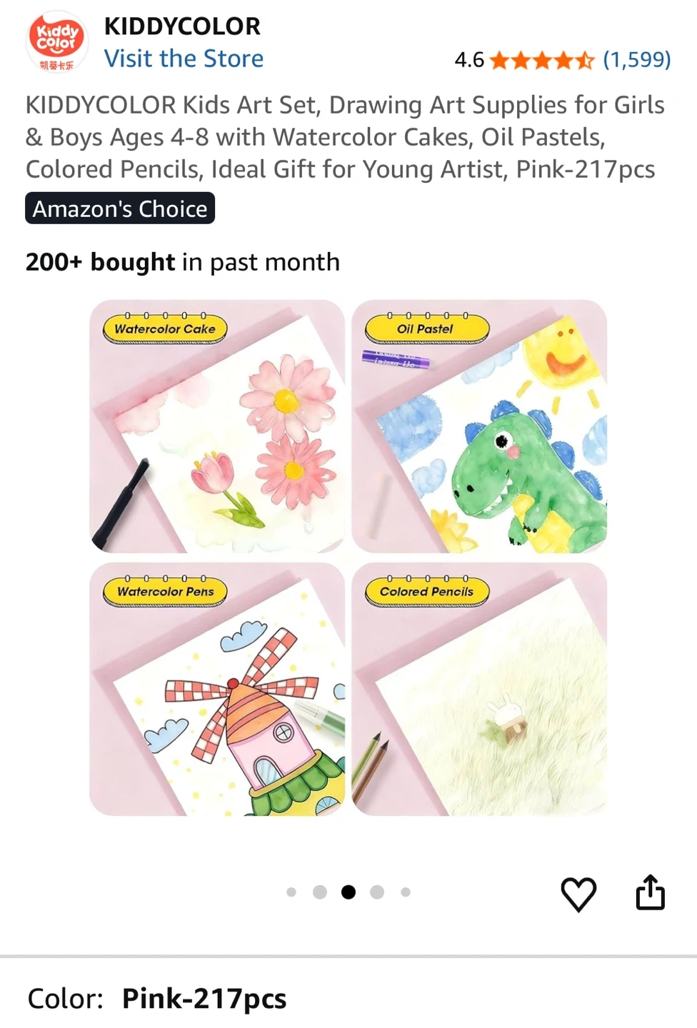 This KIDDYCOLOR art set includes 217 pieces of drawing supplies! It's great for young artists and comes with colored pencils, oil pastels, watercolor cakes, and pens. Ages 4-8 are recommended for this art set.