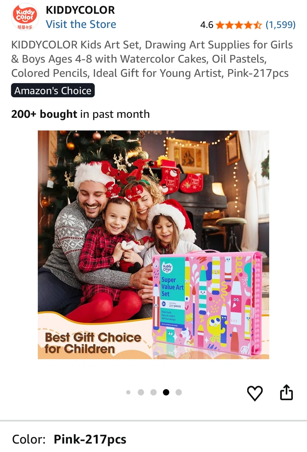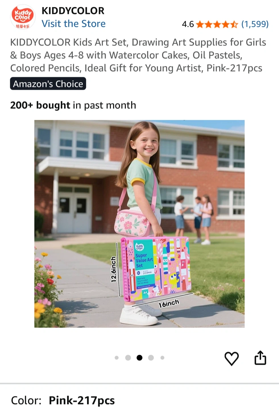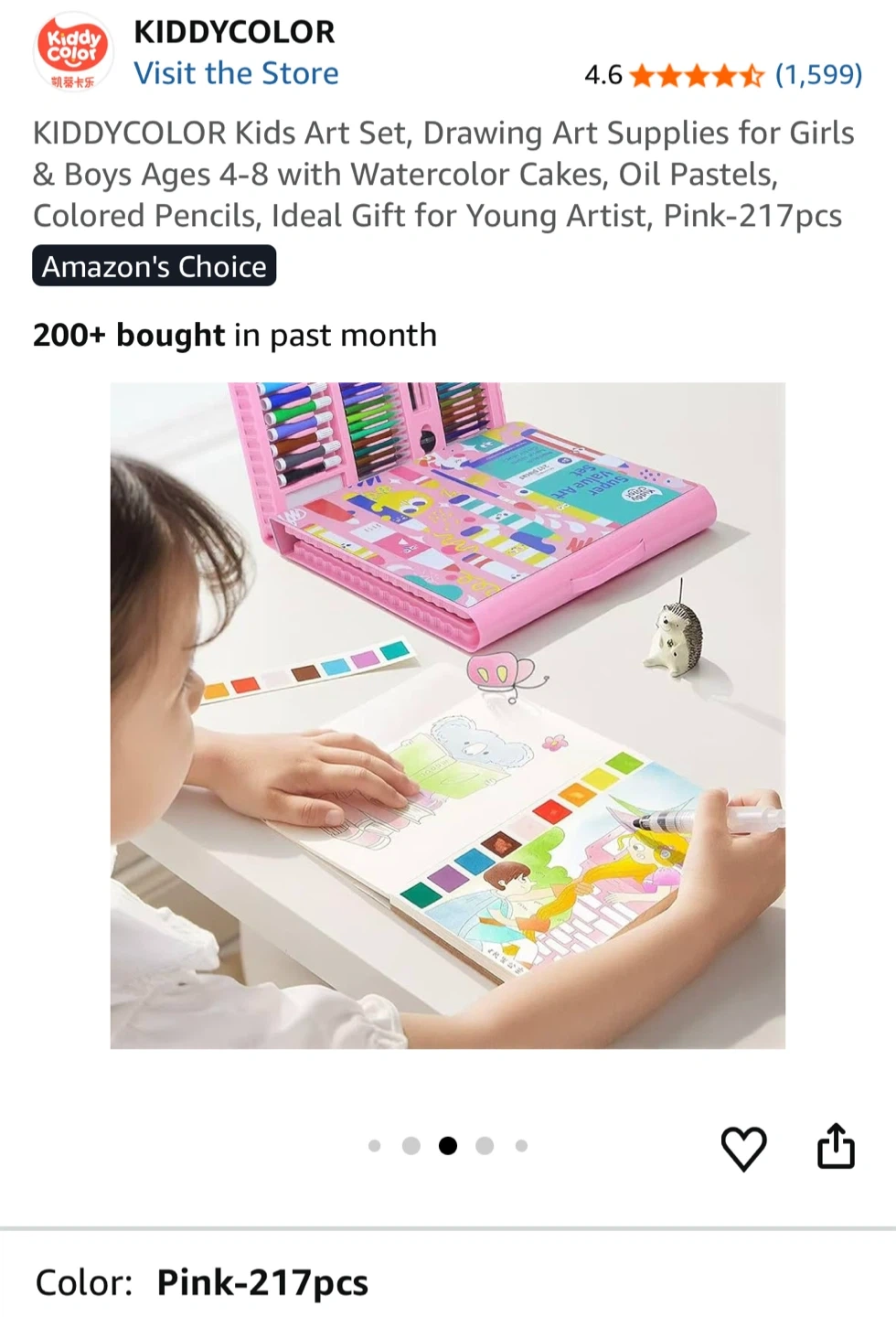 This KIDDYCOLOR art set includes 217 pieces of drawing supplies! It's great for young artists and comes with colored pencils, oil pastels, watercolor cakes, and pens. Ages 4-8 are recommended for this art set.