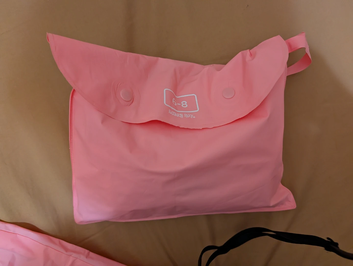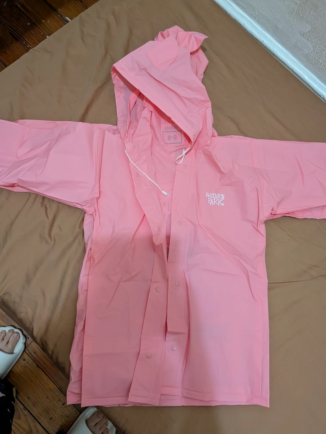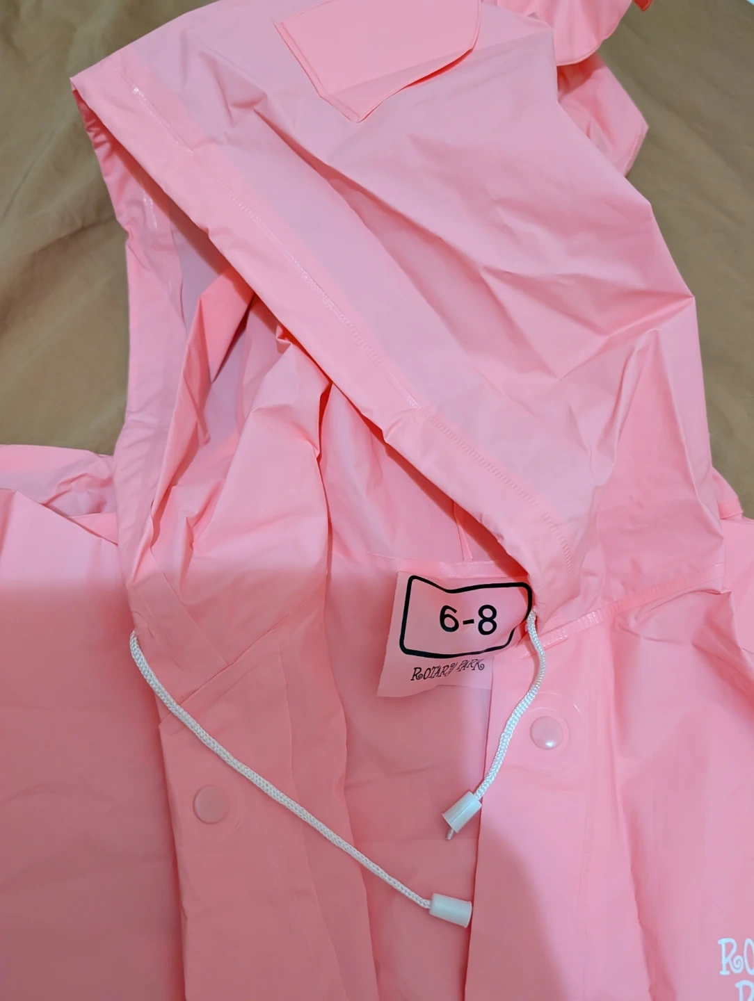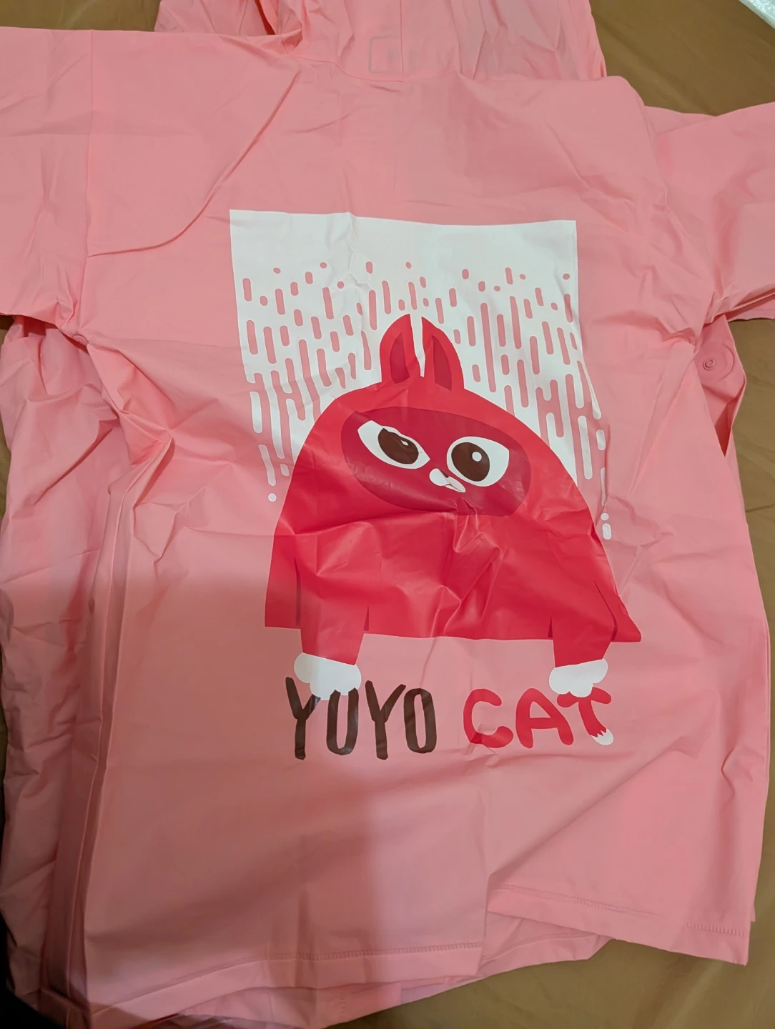This pink raincoat is designed for kids aged 6-8. It features a hood and a snap-button closure. The back has a cute "YOYO CAT" graphic. It includes a matching pouch for storage.