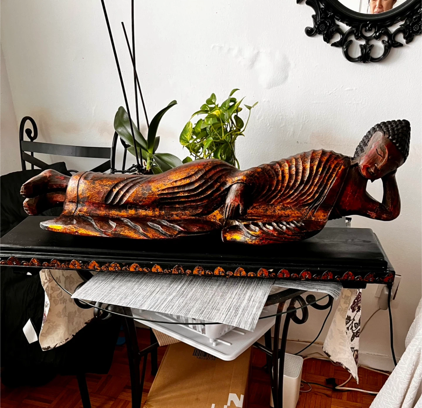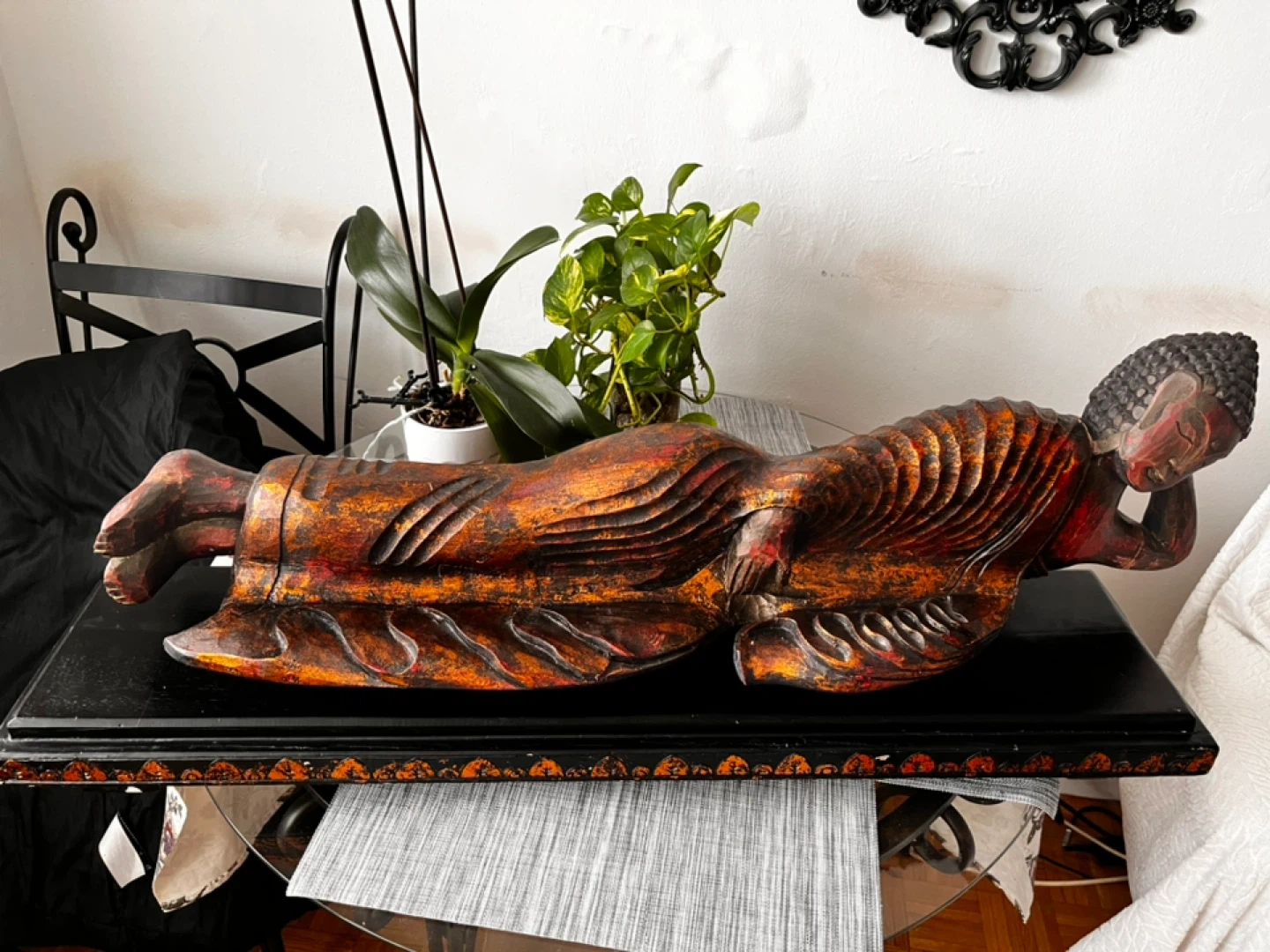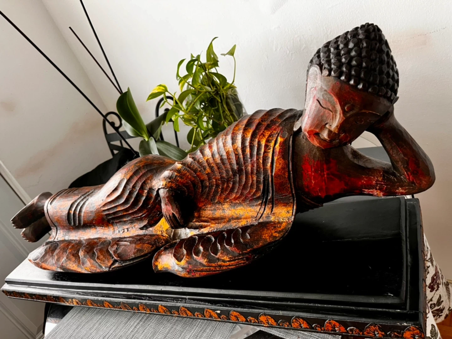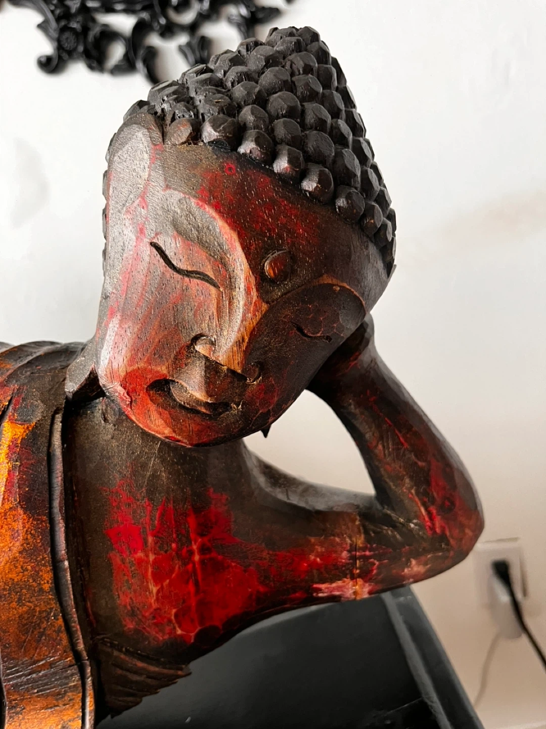 This is a beautifully carved wooden statue of a reclining Buddha, exquisite piece of art. It's finished with a rustic, weathered look, featuring black, copper and orange tones. The intricate details on the robe and face add to its serene appeal and antique look.