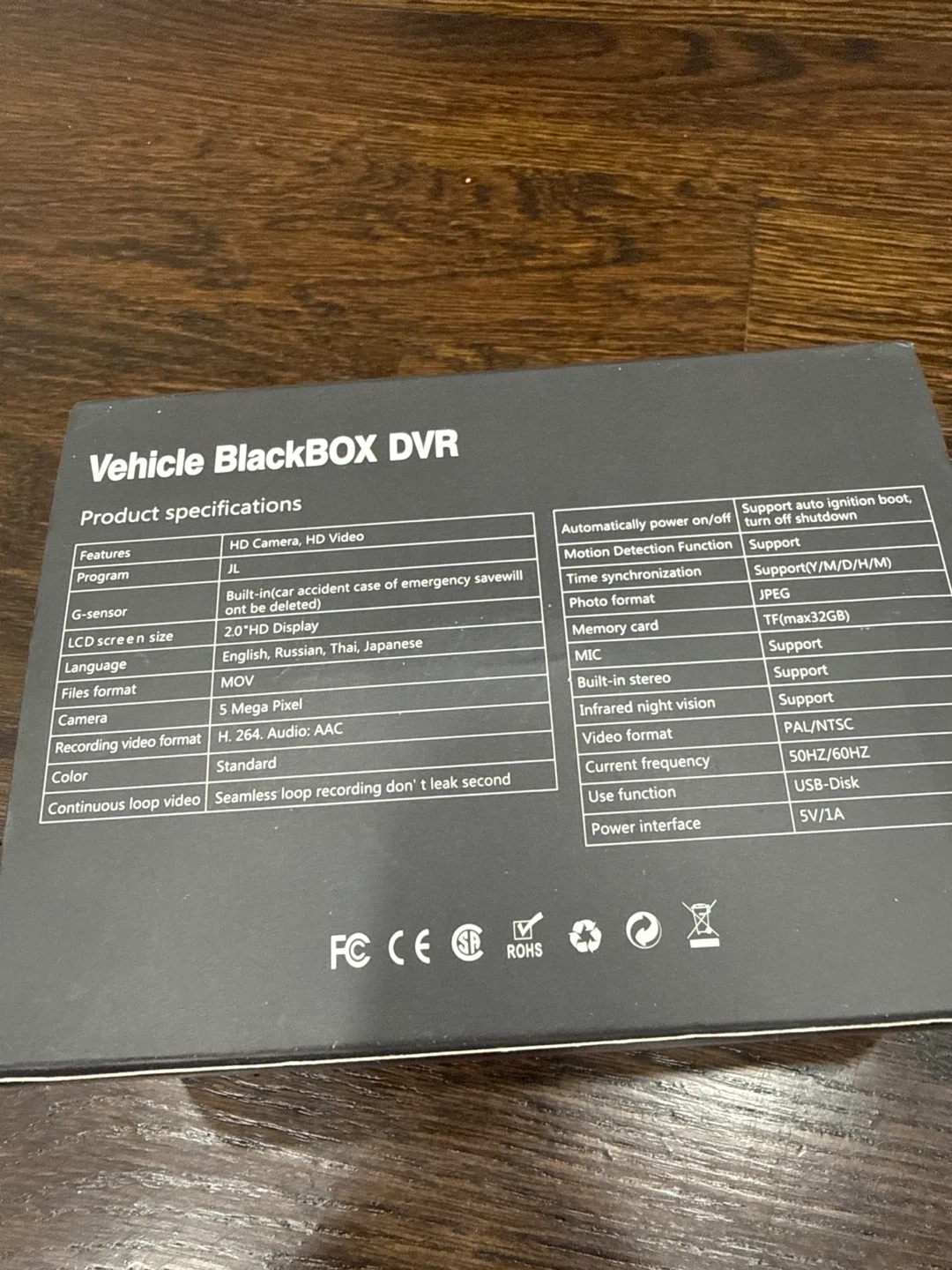 This vehicle black box DVR offers HD camera and HD video capabilities. It supports dual lens, motion detection, and infrared night vision. It includes a G-sensor and a 2.0" HD display. Supports up to 32GB TF card.
