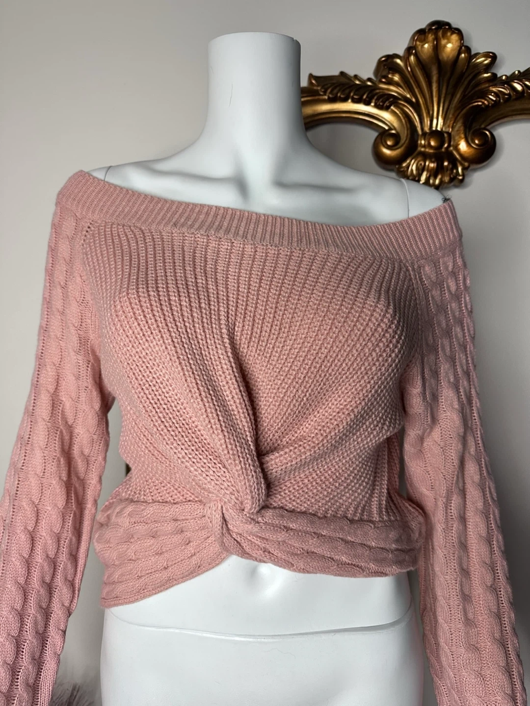 Cute pink knit sweater with a unique twist front detail! It's perfect for adding a touch of cozy style to your wardrobe. The soft knit material makes it super comfy for everyday wear