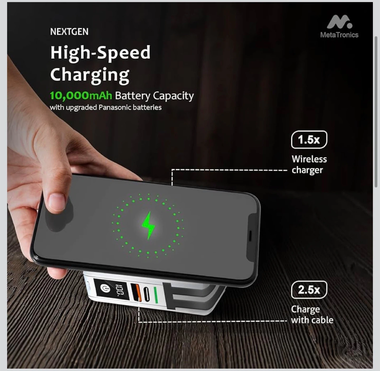 • Charging Capabilities: Features high-speed charging with USB-C, USB, and wireless outputs, compatible with various smart devices.