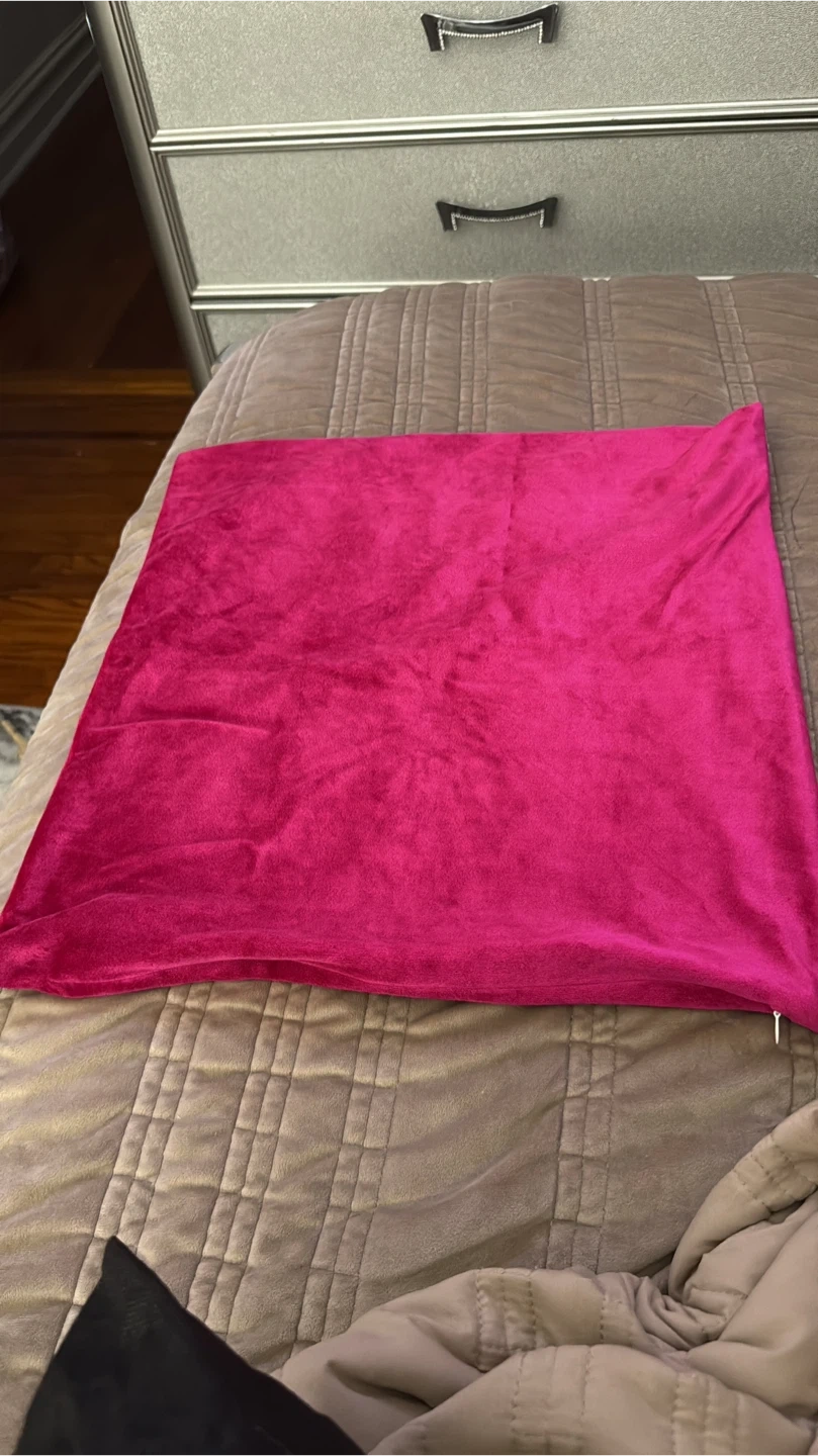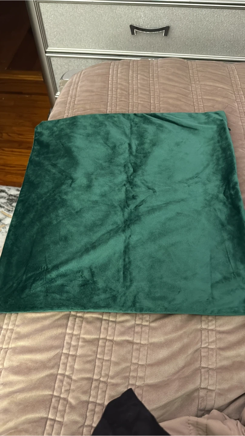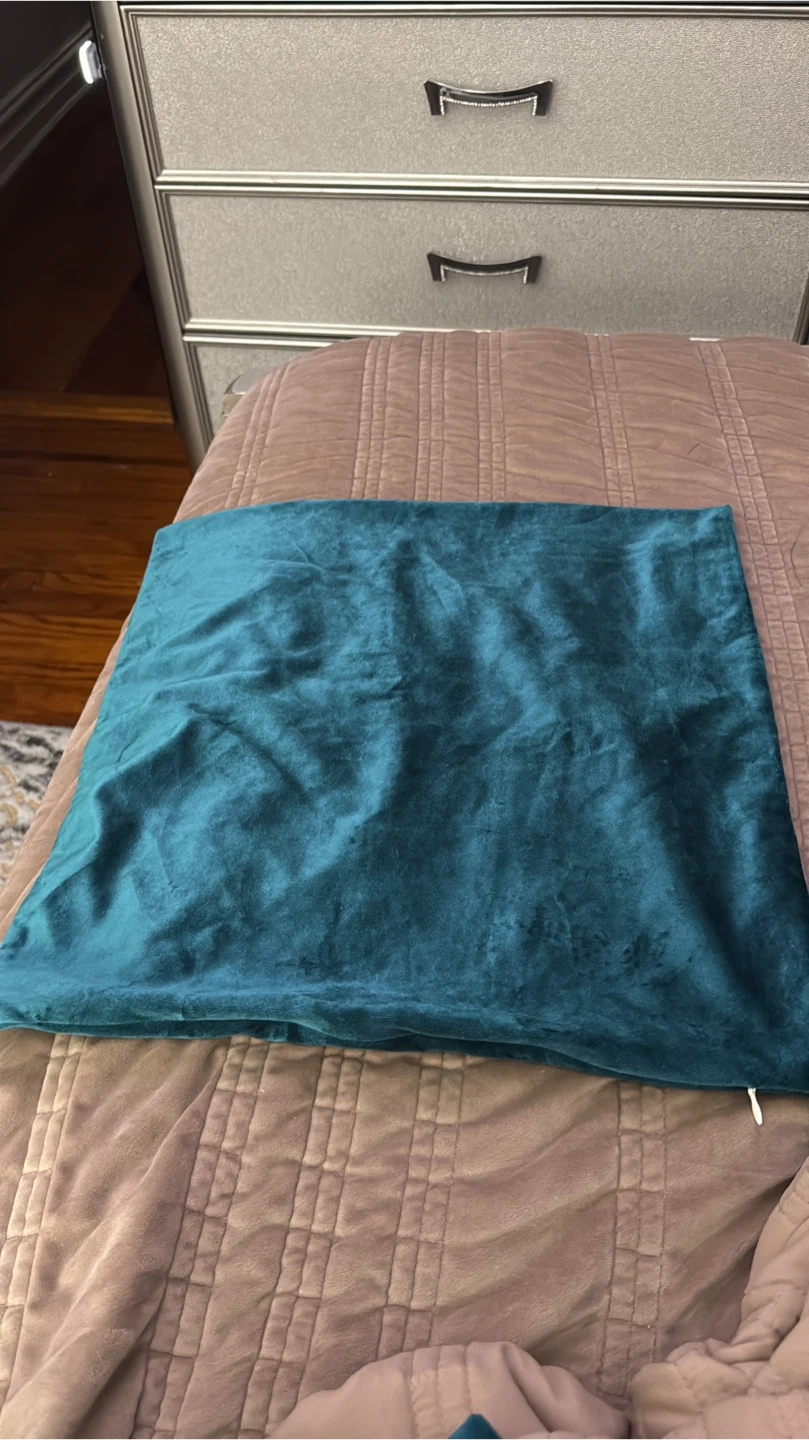 Set of five velvet throw pillow covers. Available in pink, teal, green, navy, and purple. Soft material provides a cozy feel. Zipper closure for easy insert and removal.