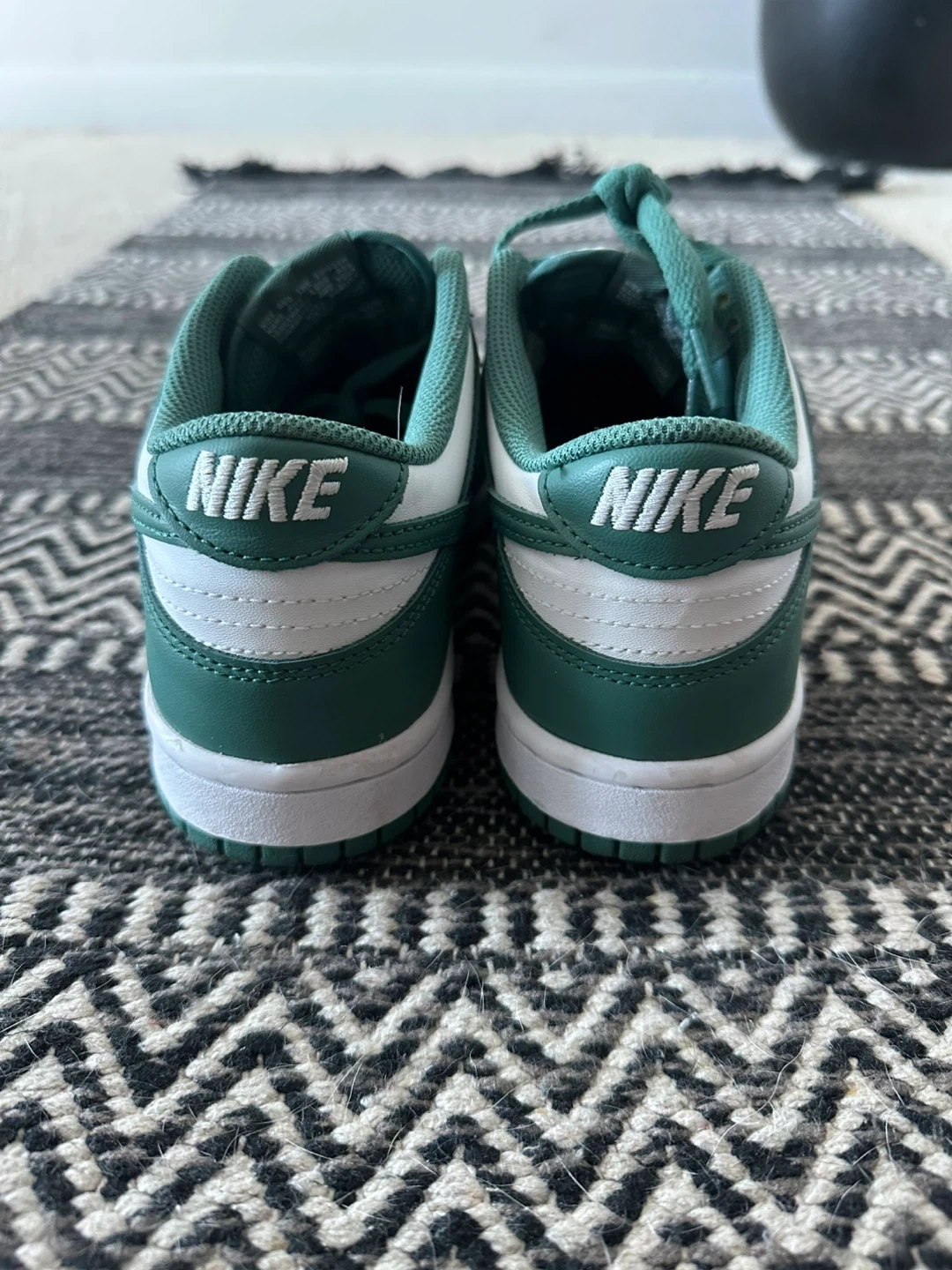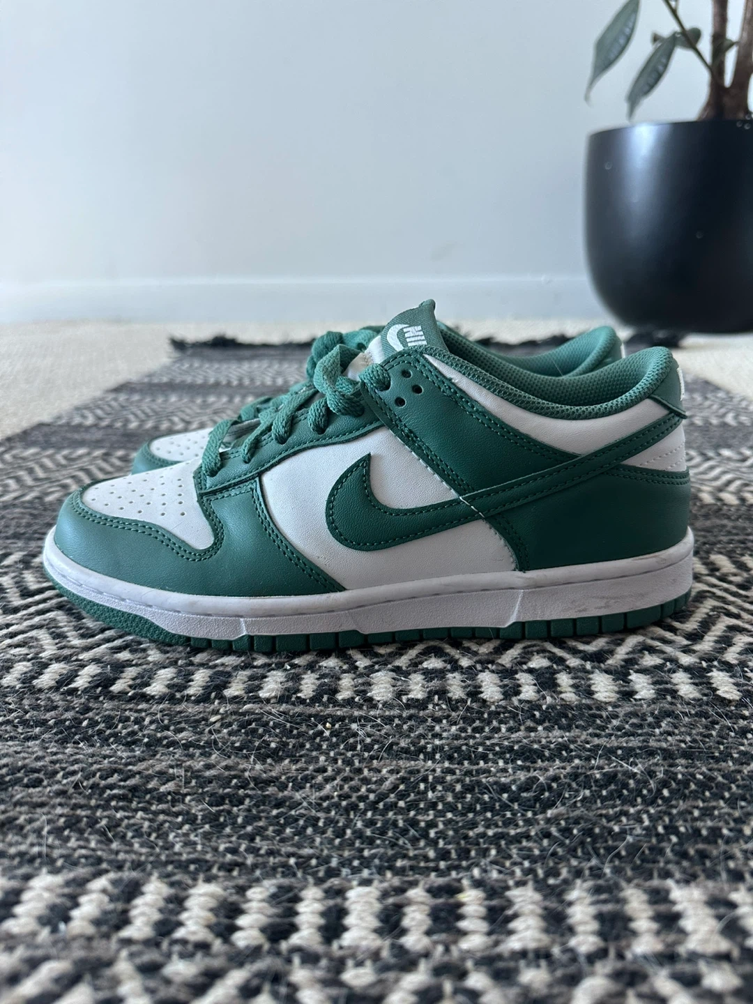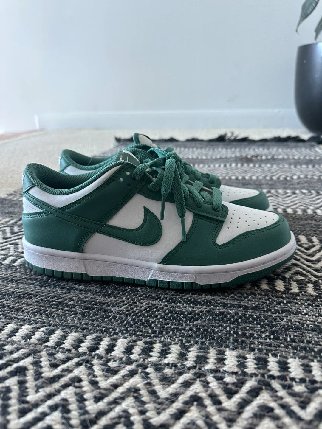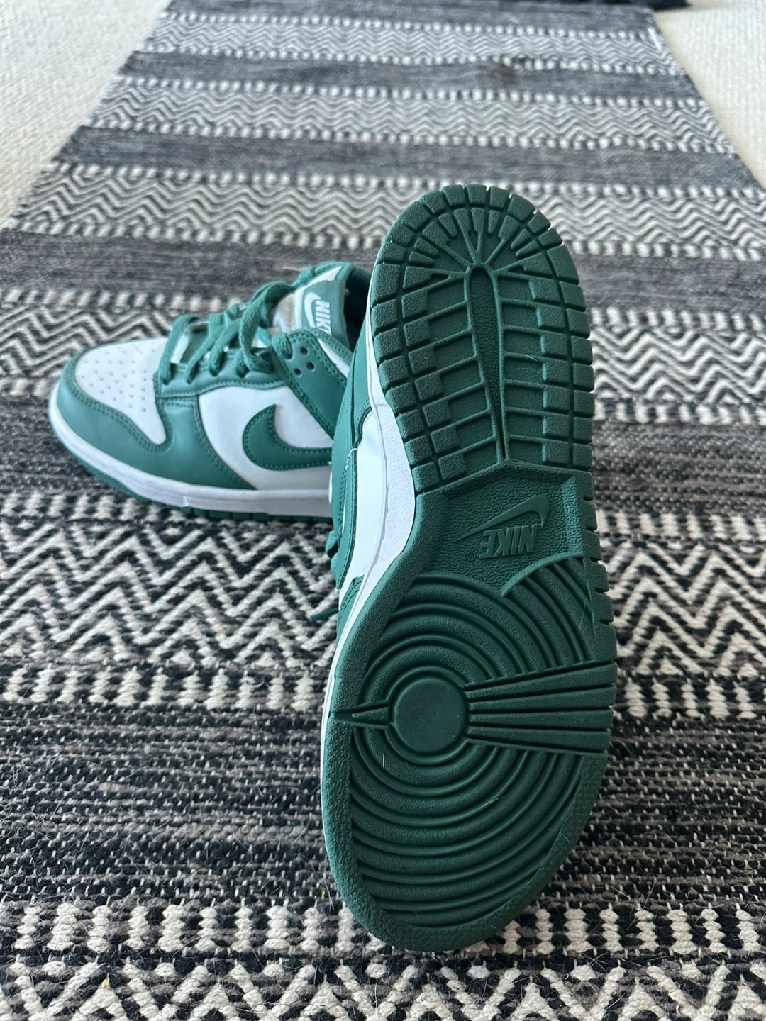 These are Nike Dunk Low sneakers in a green and white colourway. They feature a leather construction with a rubber sole. These kicks are super comfy for everyday wear!